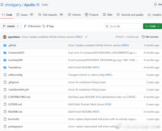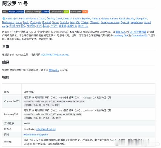 美国阿波罗11号首次登月代码公开:内存竟只有3.75KB!阿尔忒弥斯2号成功完成了算不上真正的绕月之旅,迈出了美国重返月球的重要一步,但一直有很多人质疑,当年阿波罗登月那么成功、那么顺利,如今怎么就如此磕磕绊绊呢?其中的原因不是一句两句就能讲清的,甚至有什么图纸全都丢失了之类的说法。不过,至少程序代码看起来没丢!近日,NASA正式公开了辅助阿波罗11号登月的计算机软件代码,任何人都可以在GitHub上查阅、下载。这次公开的代码有两部分,一是“Comanche055”,指令模块(CM)中的Colossus 2A部分,二是“Luminary099”,登月模块(LM)中的Luminary 1A部分。都曾用于阿波罗11号的制导计算机(AGC),均采用yaYUL汇编语言。Comanche055中第一个引人关注的文件是ALARM_AND_ABORT.agc。文件开头是常规的代码说明引言,随后就是代码的用途,而且从文件名也能直观地看出,它用于记录警报状态,在必要时点亮警示灯,处理各类中止级警报与非中止类警报。这些代码由虚拟阿波罗制导计算机项目(Virtual AGC)团队与麻省理工学院(MIT)博物馆合作完成的数字化处理,都是从印刷本电子化图片抄录、改编而来的。如果你不满足于只是看看代码,可以借助这个Virtual AGC工具,尝试进行编译,Windows XP、Mac OS X 10.3、Linux和部分FreeBSD系统都可以跑。网上还流传着另一段精彩的代码示例,来自阿波罗11号导航轨迹计算程序,其中包括最为关键的30行汇编代码,主要是计算正弦、余弦等超越函数。20世纪60年代的阿波罗登月计算机,其配置和性能如今看起来不值一提,比如AGC只有3840字节(3.75KB)的内存、69120字节(67.5KB)的存储,每秒钟只能执行最多8.5万条指令。它的体积和如今一台桌面游戏台式机差不多,达到了61.595 x 31.580×15.174厘米,重量则有31.8公斤。指令舱部分需要两个DSKY控制器,登月舱则有一个。如此简陋的套件下,科学家和工程师们完成了史无前例的壮举,着实令人敬仰。