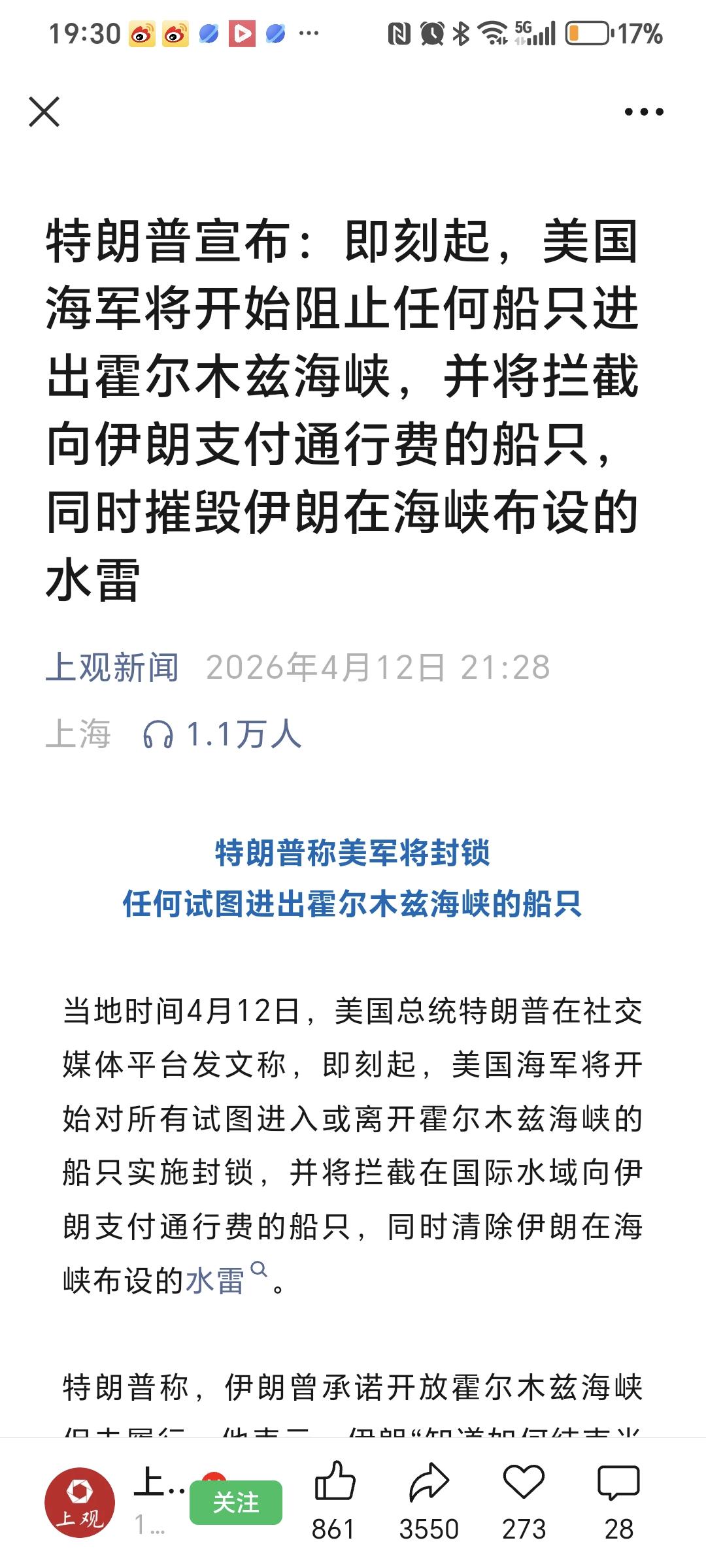 美国海军立即对霍尔木兹海峡实施全面封锁,美军中央司令部从4月13日开始,拦截所有进出伊朗港口的船只。