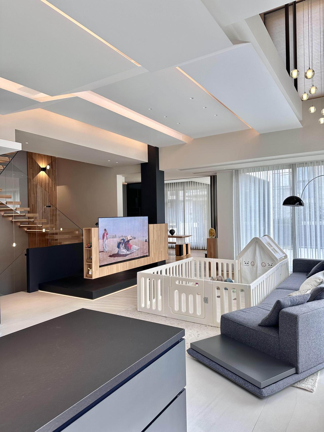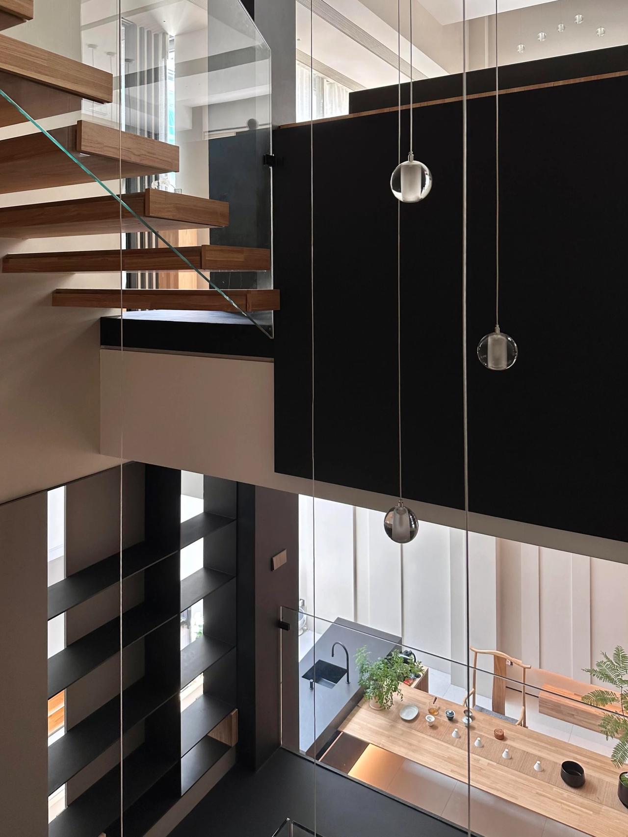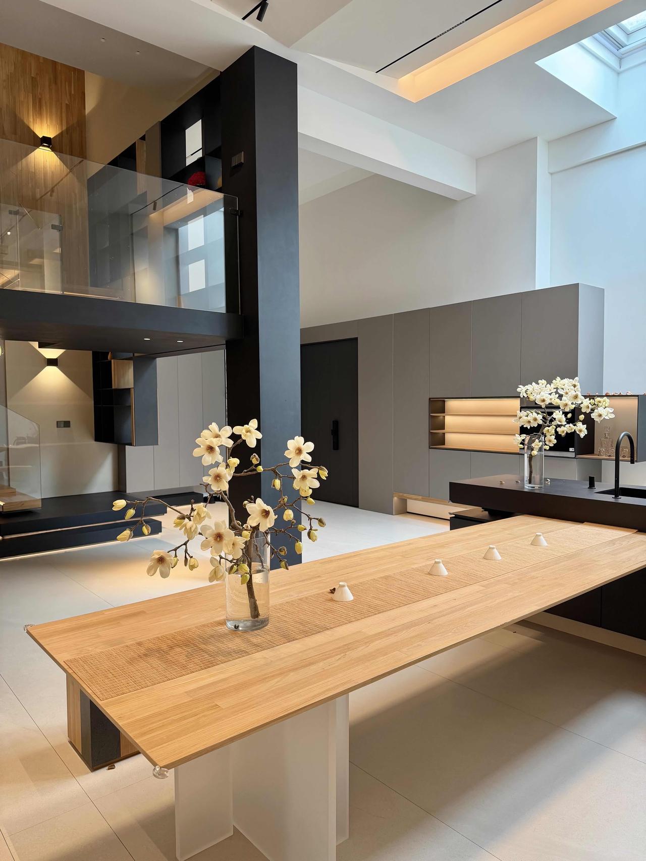 整个家以原木色打底,灰、白、黑穿插其中。大面积用玻璃,阳光从早到晚追着屋子跑,地下室是茶室和影音室,挑空区隔出保姆间和储物间。一楼是书房、客厅、开放式厨房。