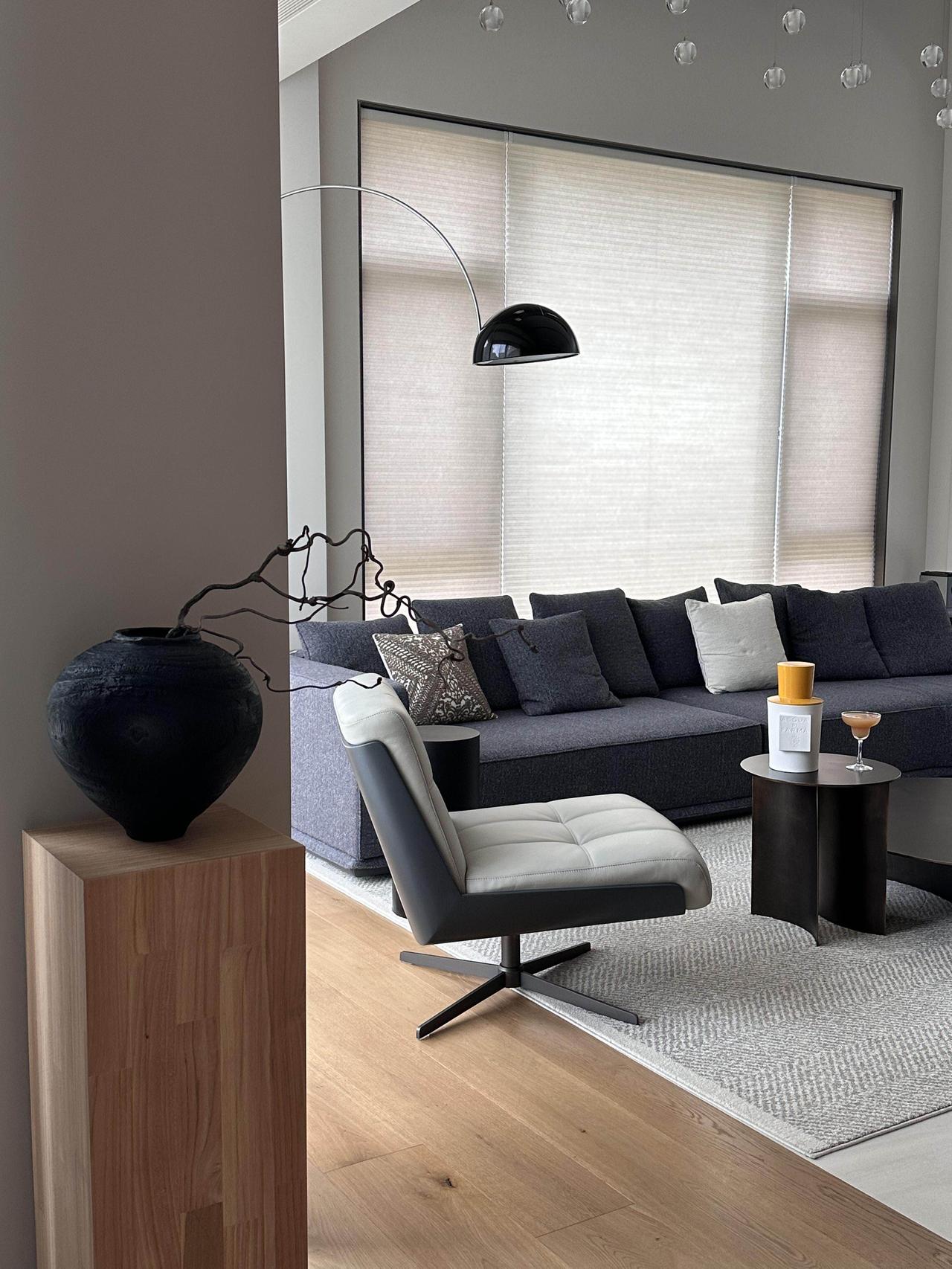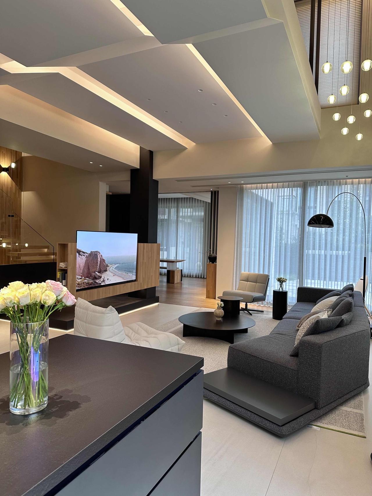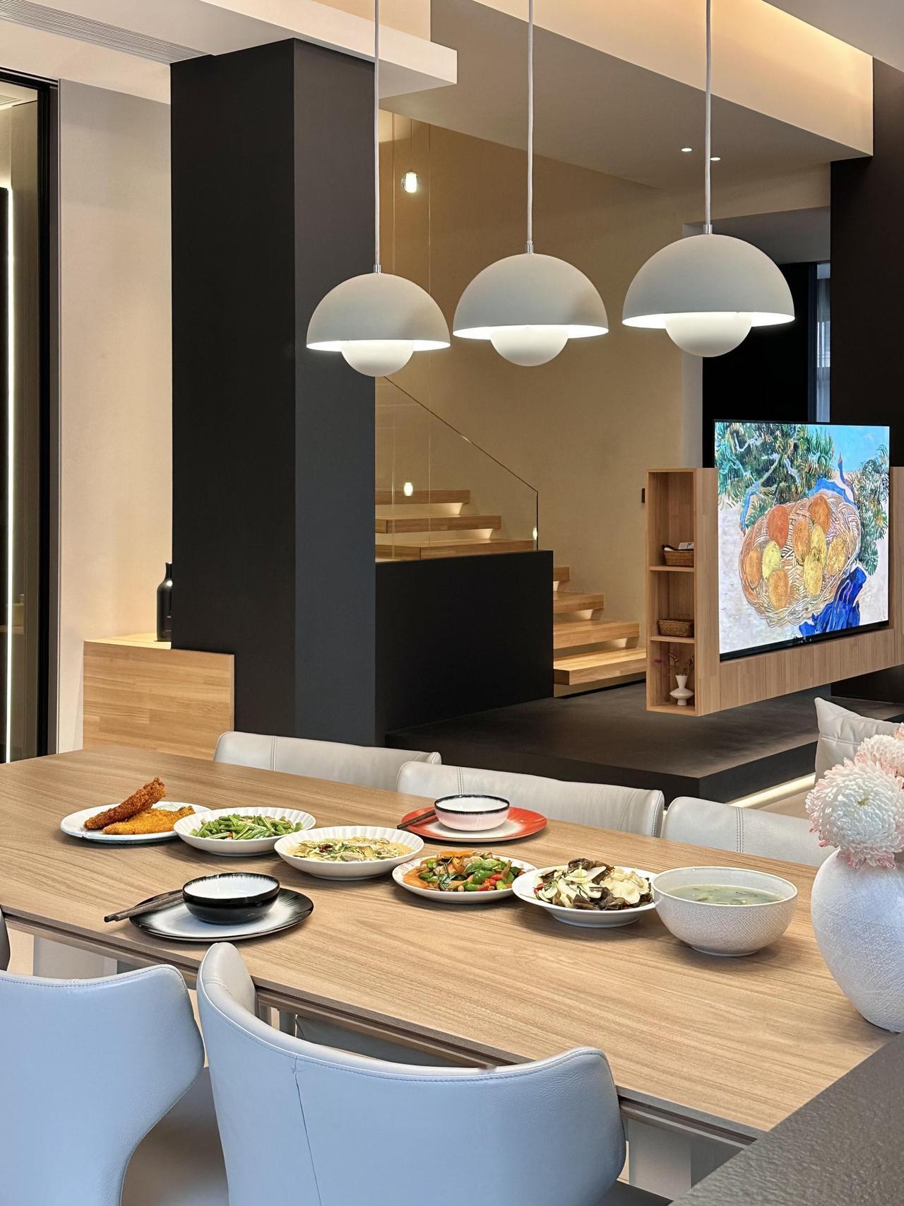 整个家以原木色打底,灰、白、黑穿插其中。大面积用玻璃,阳光从早到晚追着屋子跑,地下室是茶室和影音室,挑空区隔出保姆间和储物间。一楼是书房、客厅、开放式厨房。