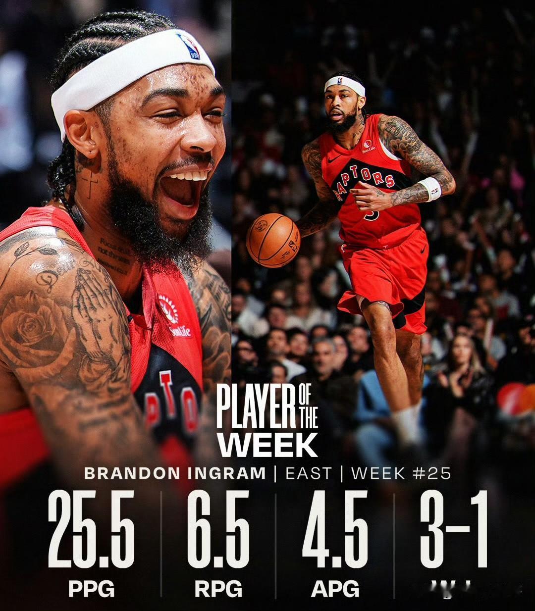 英格拉姆上周场均贡献25.5分6.5篮板4.5助攻,带队拿下了3胜1负的表现,而且猛龙最终以东部第五的身份进入了季后赛,首轮将对阵哈登和米切尔带领的骑士队。