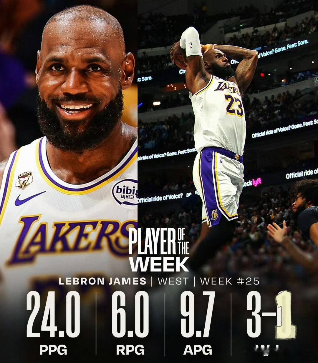 詹姆斯上周场均贡献24分6篮板9.7助攻,率领湖人3胜1负,并带领湖人最终以西部第四的身份进入季后赛,首轮将对阵杜兰特带领的火箭队。
