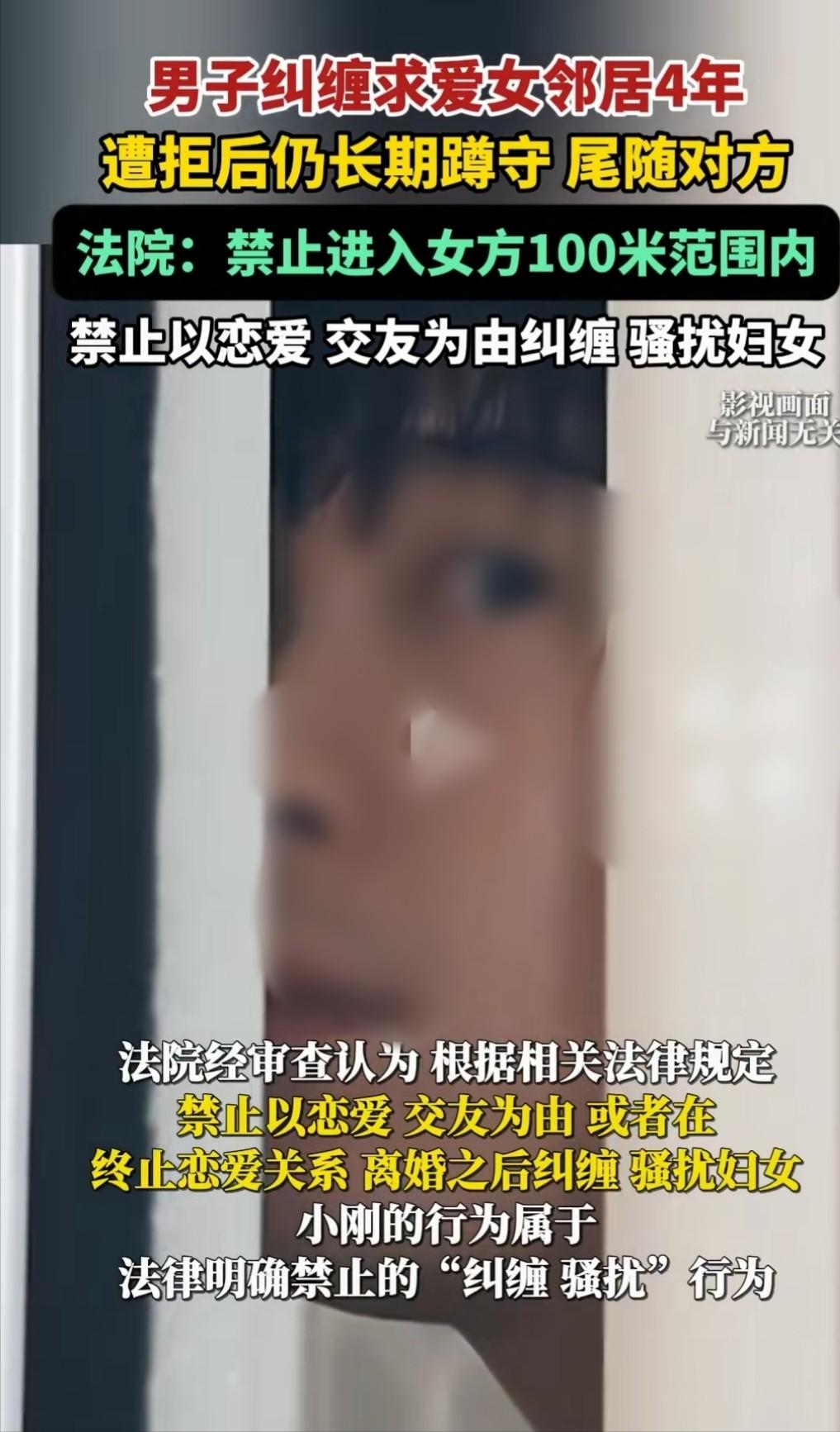 太变态!上海,男子觉得女邻居长的颇有姿色,就跟她求爱了。但人家瞧不上他,明确拒绝。求爱未果的男子,非常不服气,一直纠缠、蹲守、尾随女邻居长达4年之久,连她的父亲都不放过。女邻居多次报警,但被民警批评教育后,男子依旧我行我素。实在没办法,她只能把男子告了,法院:禁止进入女方100米范围内!