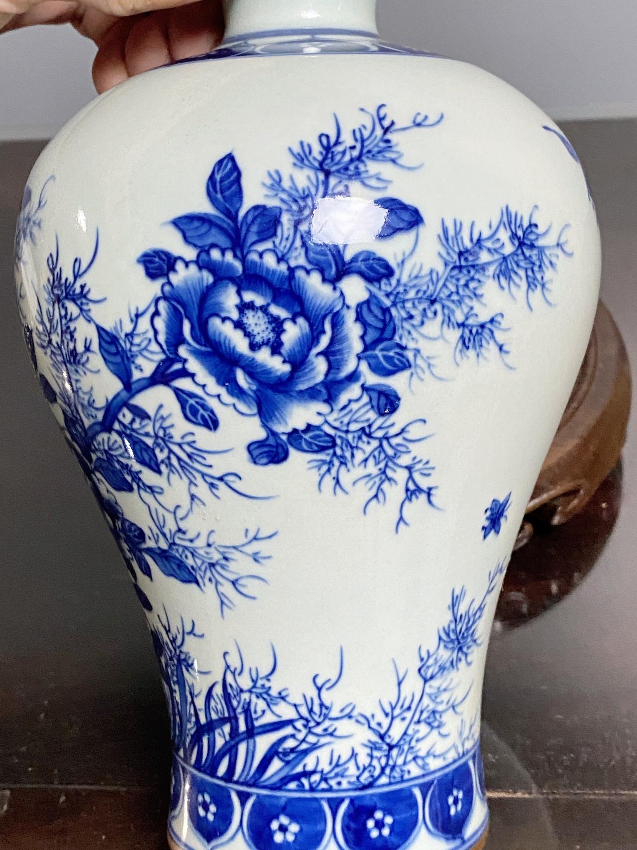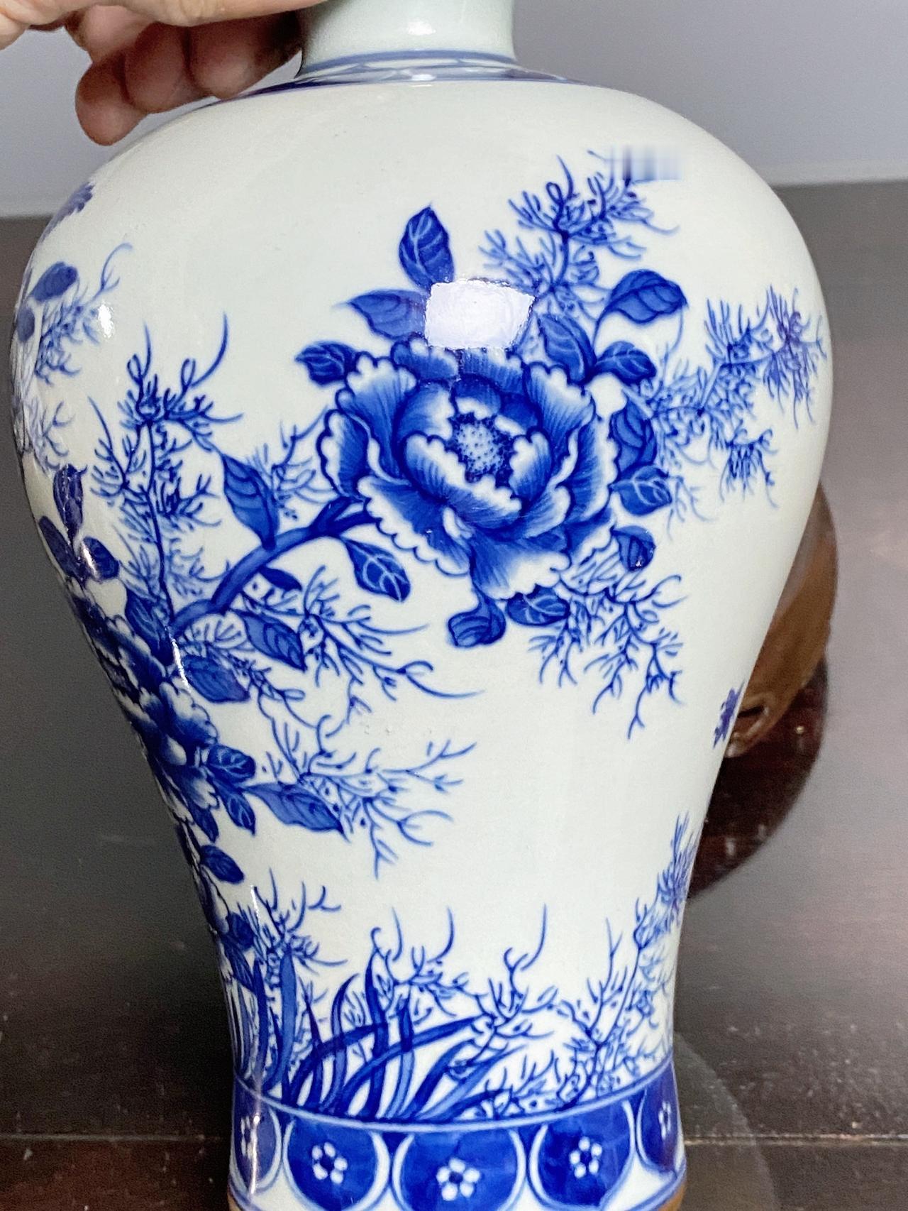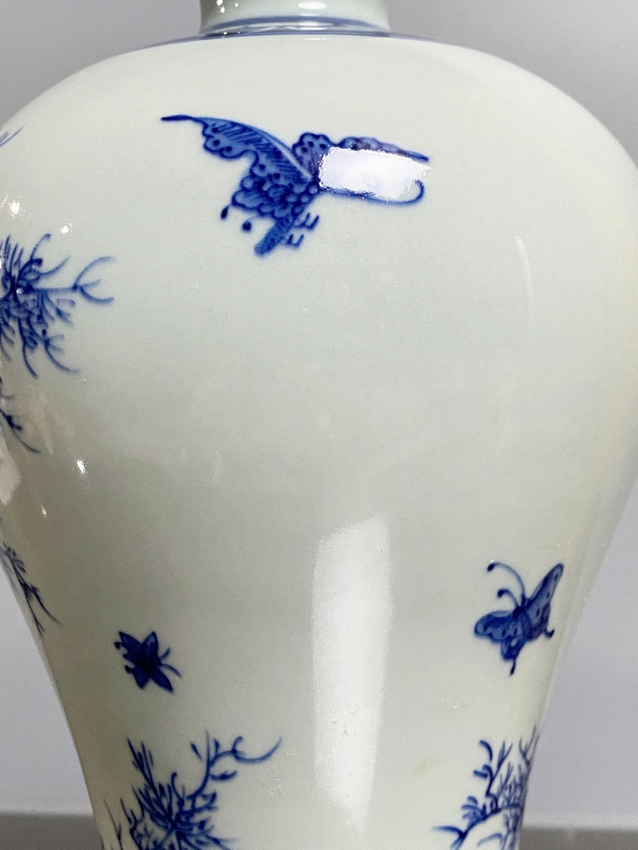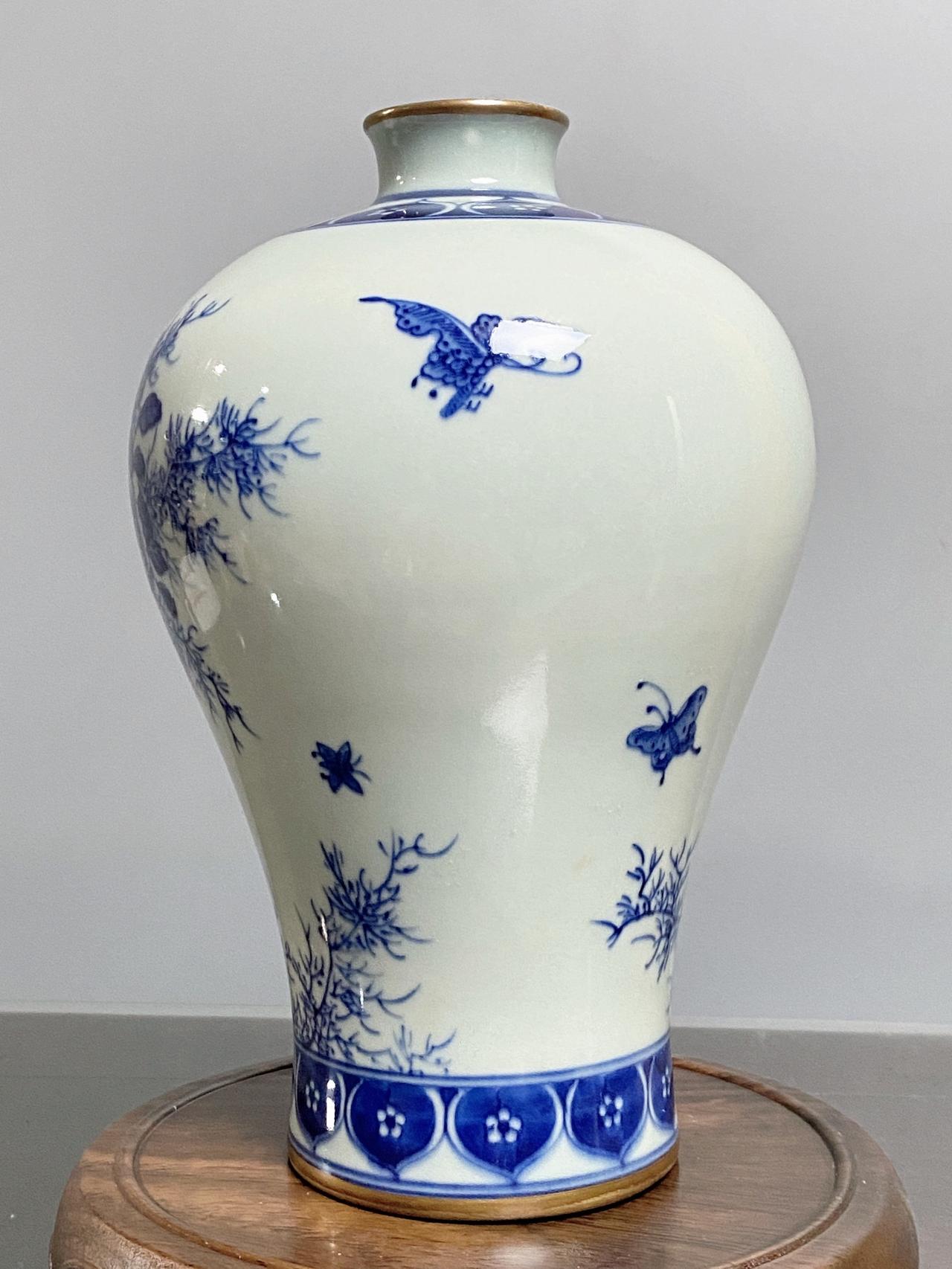 清康熙翠毛蓝花鸟纹梅瓶,典型的康熙青花发色;胎釉特征紧皮亮釉,很强的玻璃质感、大