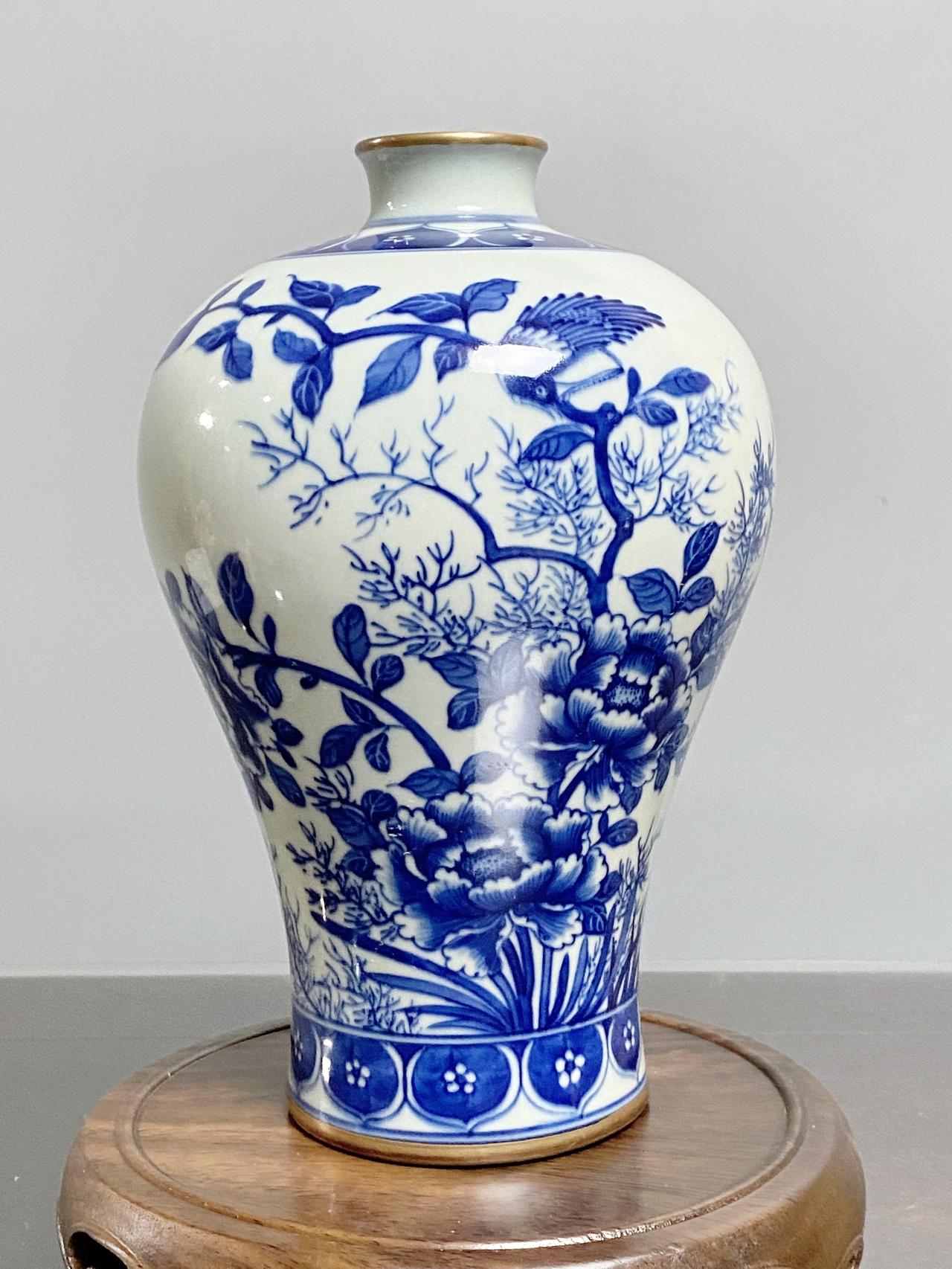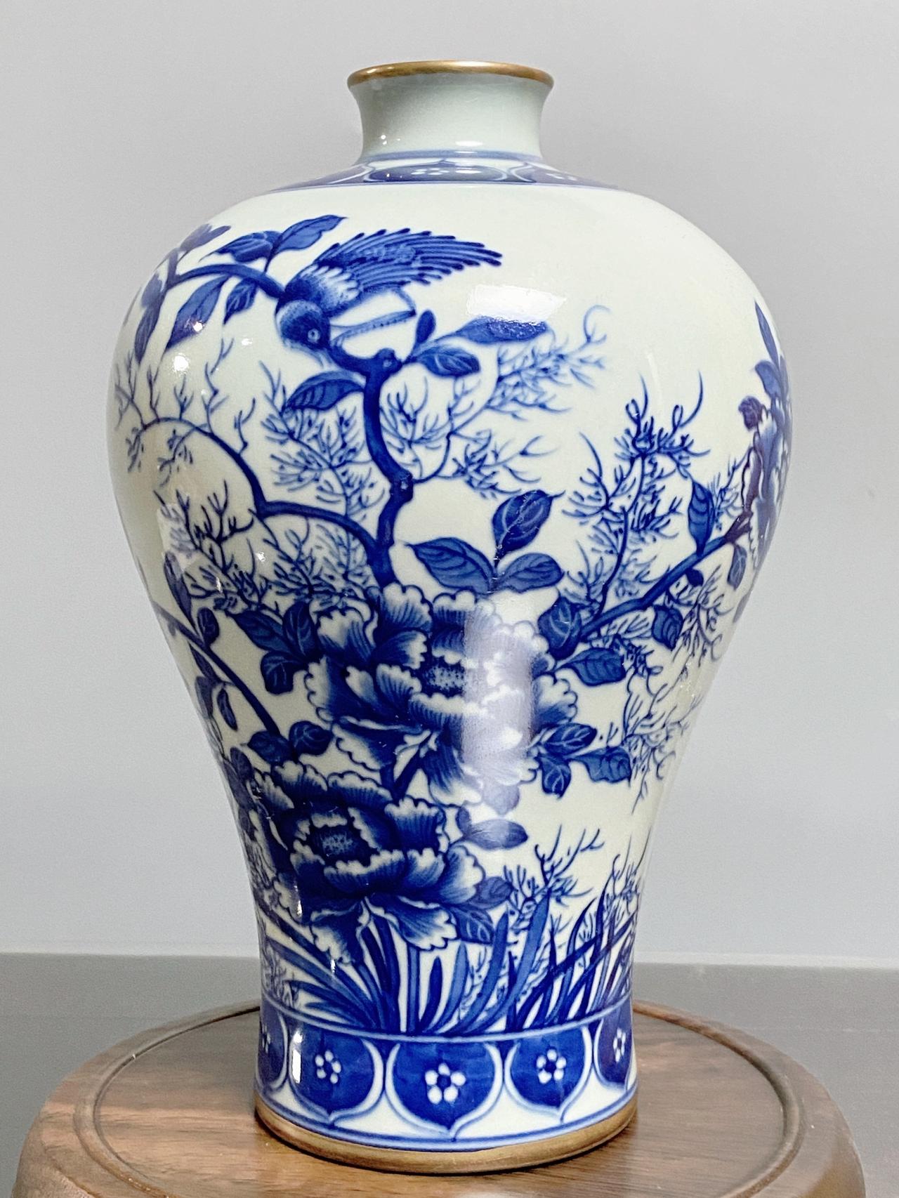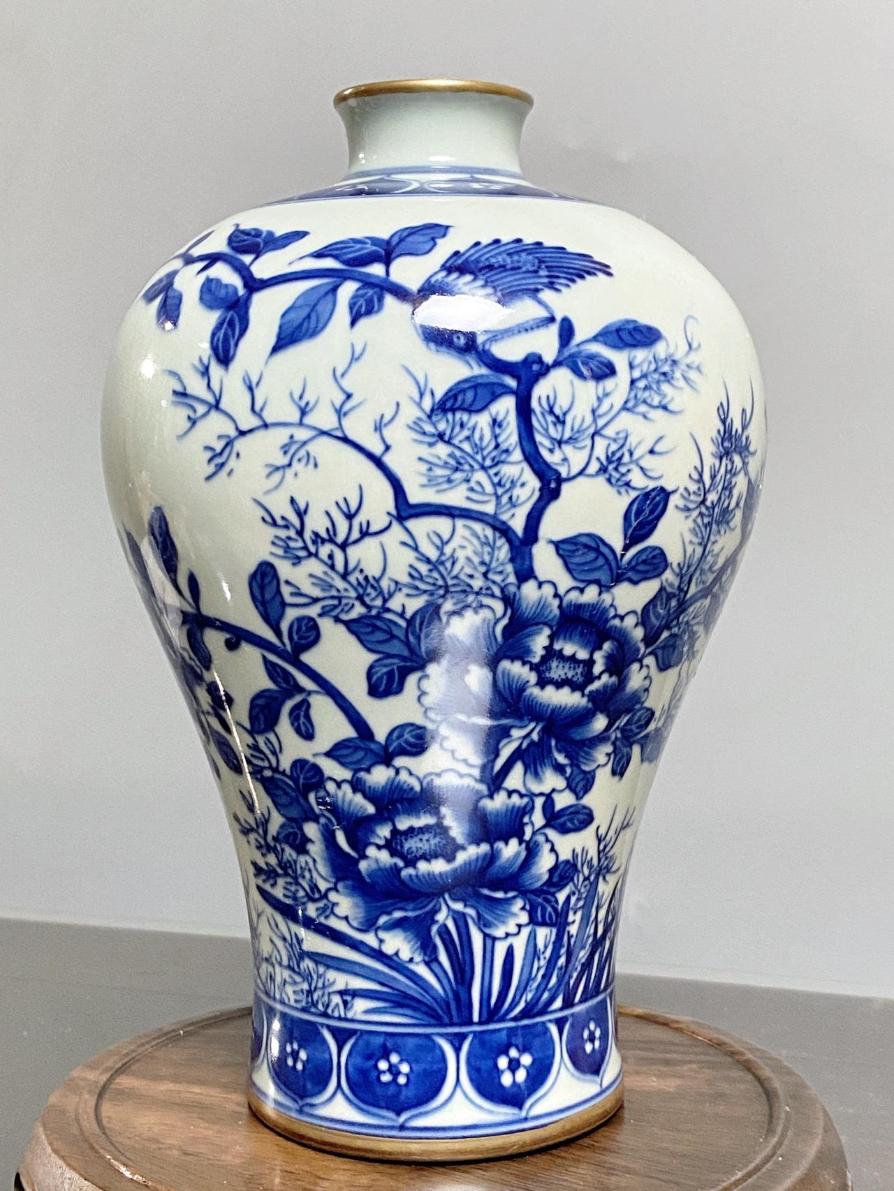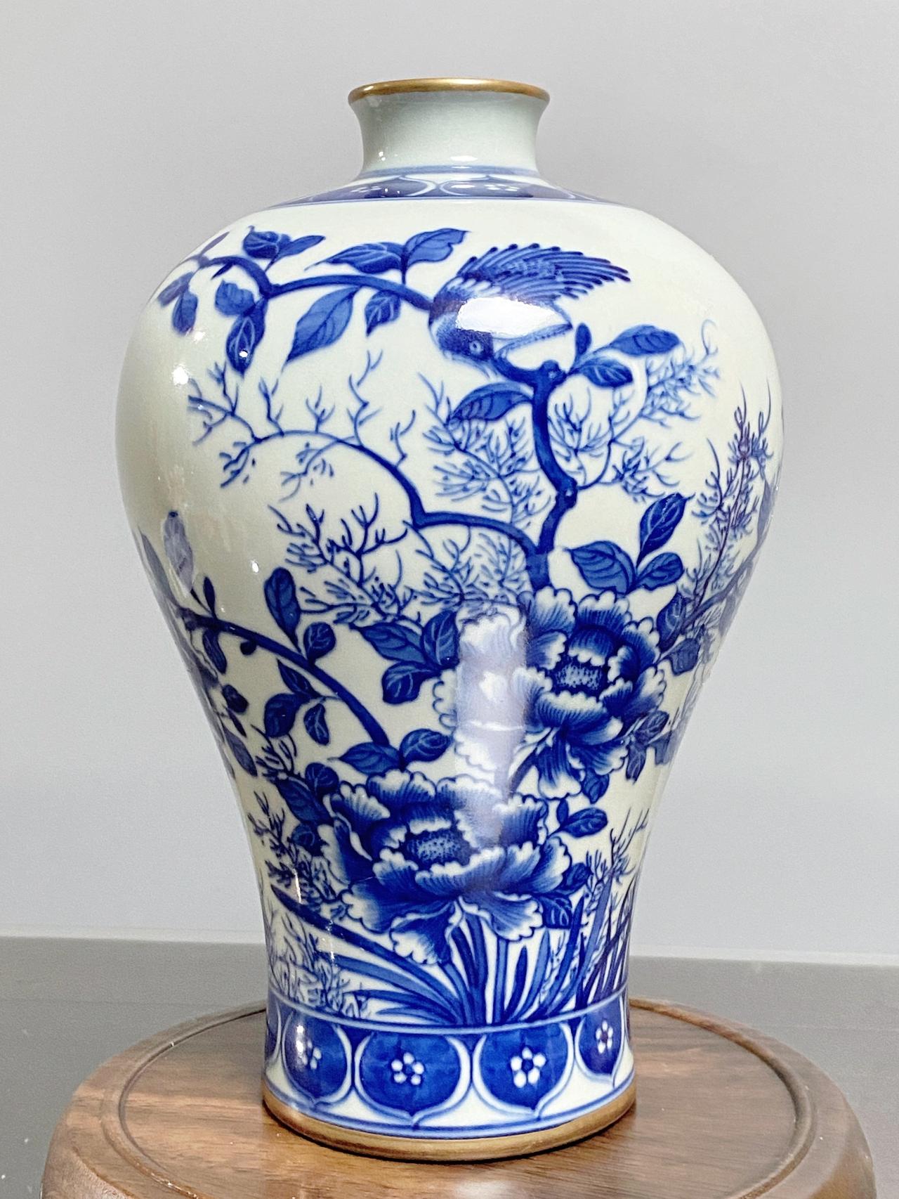 清康熙翠毛蓝花鸟纹梅瓶,典型的康熙青花发色;胎釉特征紧皮亮釉,很强的玻璃质感、大师级精美画工;此件藏品属于康熙官窑极品哦,而且属于大开门到代康熙官窑器!明清瓷器 官窑 瓷器 古董