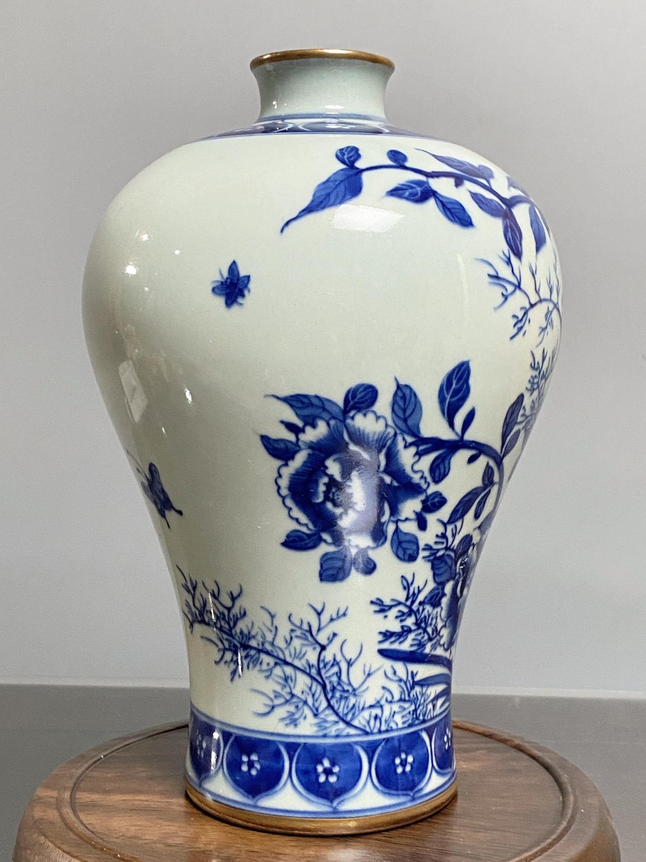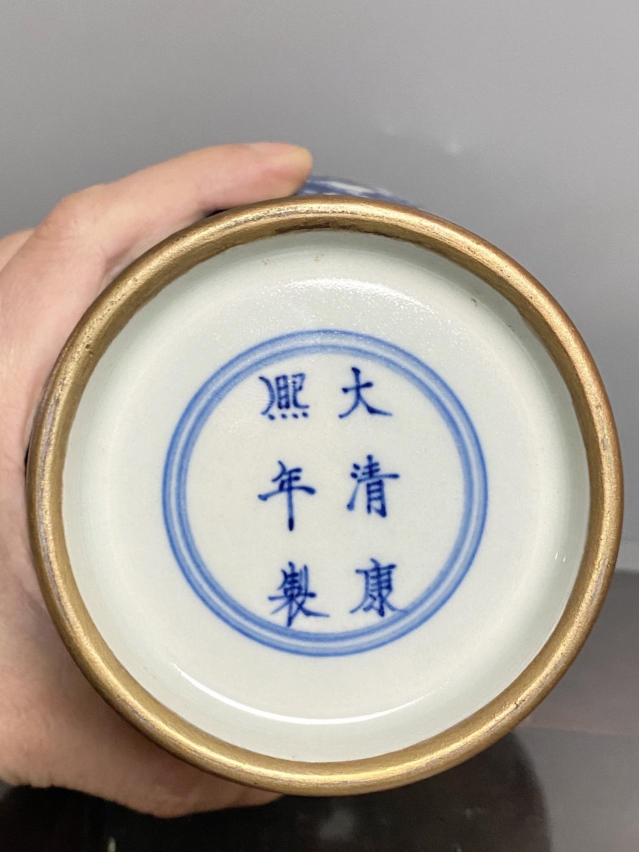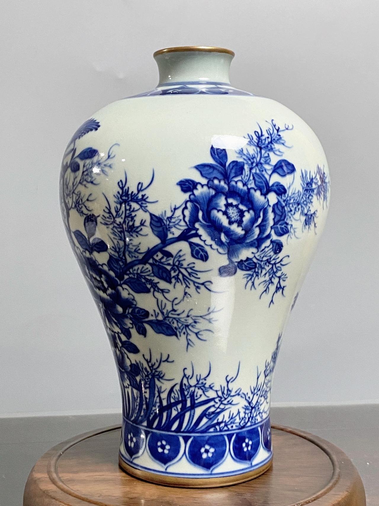 清康熙翠毛蓝花鸟纹梅瓶,典型的康熙青花发色;胎釉特征紧皮亮釉,很强的玻璃质感、大师级精美画工;此件藏品属于康熙官窑极品哦,而且属于大开门到代康熙官窑器!明清瓷器 官窑 瓷器 古董
