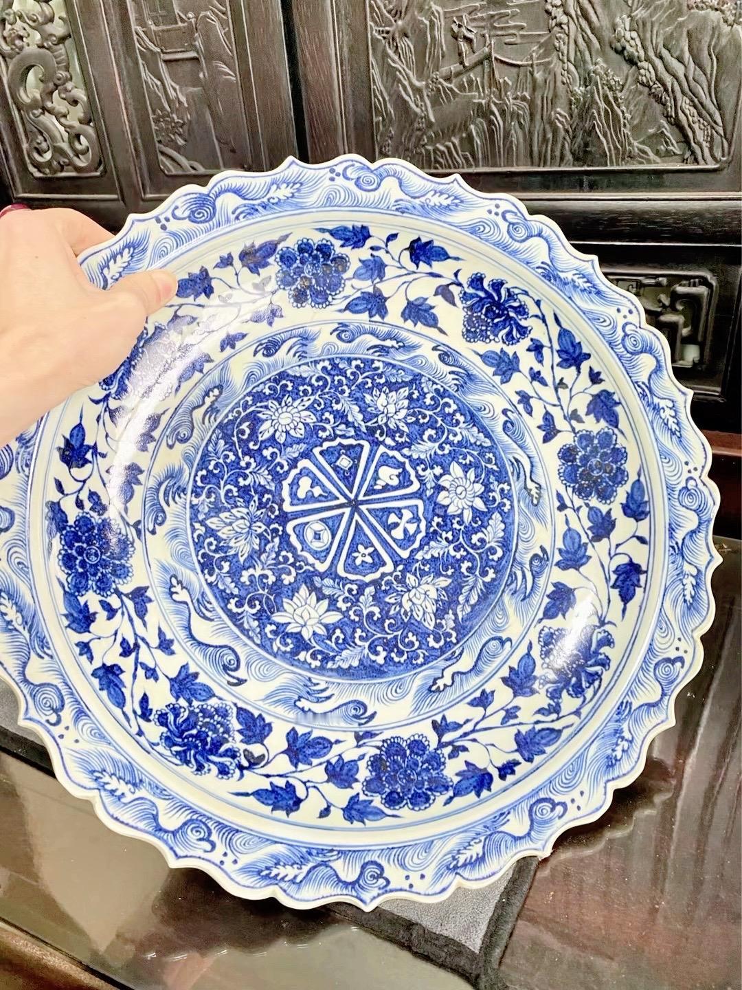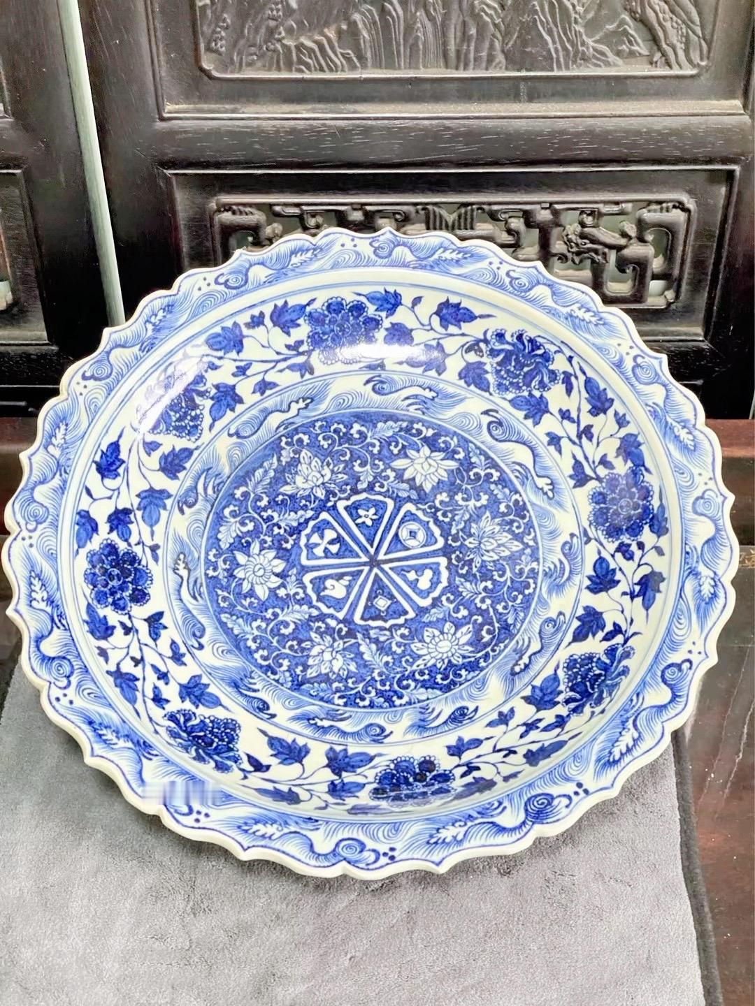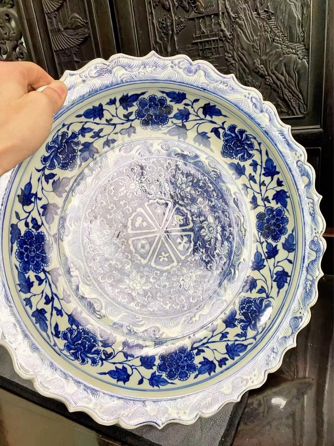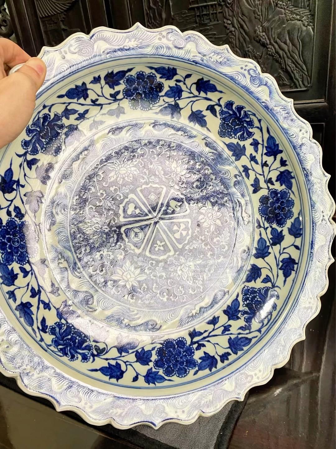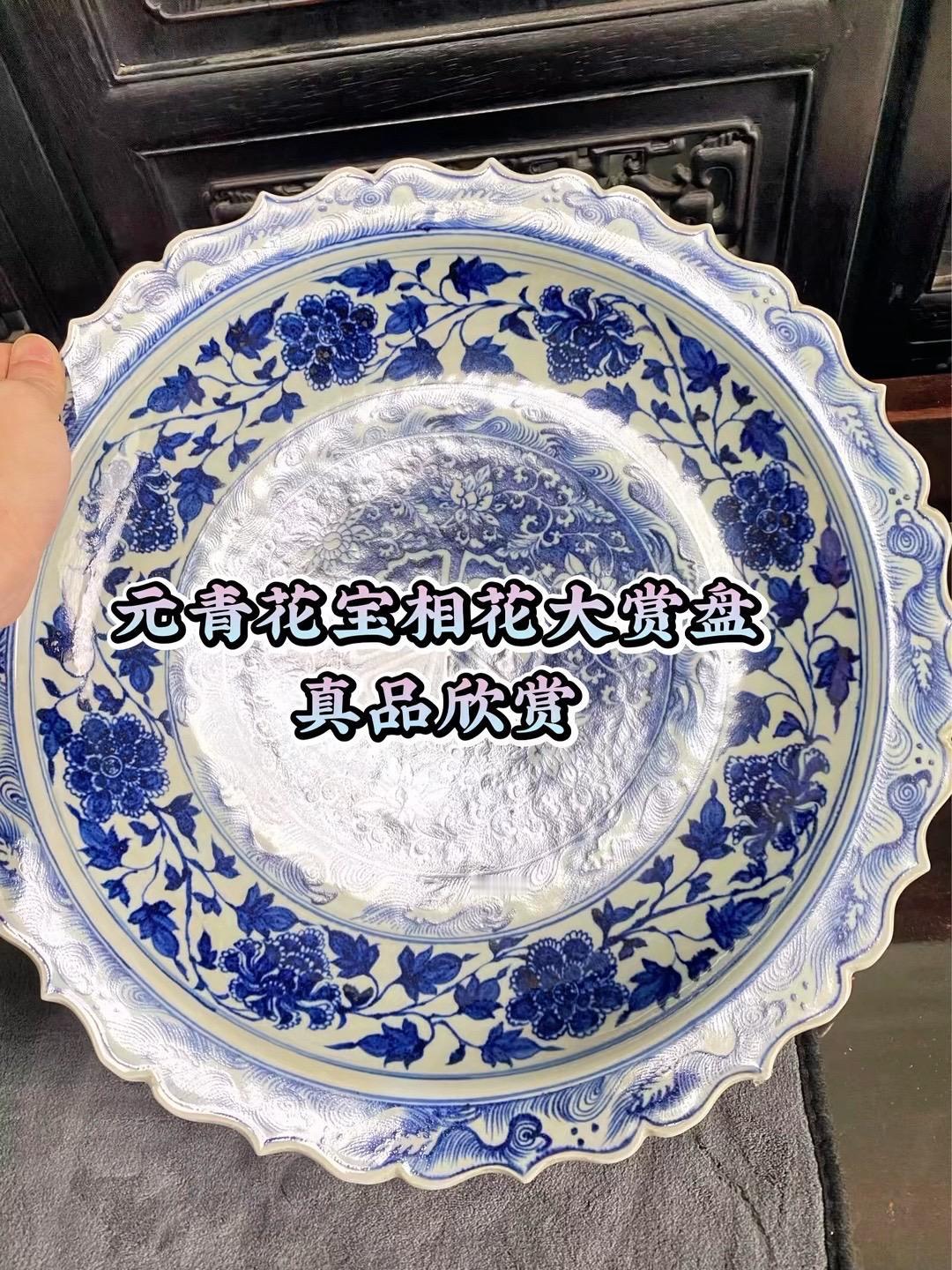 元青花缠枝牡丹纹宝相花菱口大赏盘欣赏:真正大开门的元青花精品,收藏几十年的一对宝物;青花发色蓝中泛紫,苏麻离青进口料特征开门、微观老化胎釉钙化结晶明显、气泡老化稀疏黑色褐色气泡;堪称真正大开门元青花到代真品!元青花 瓷器 古董