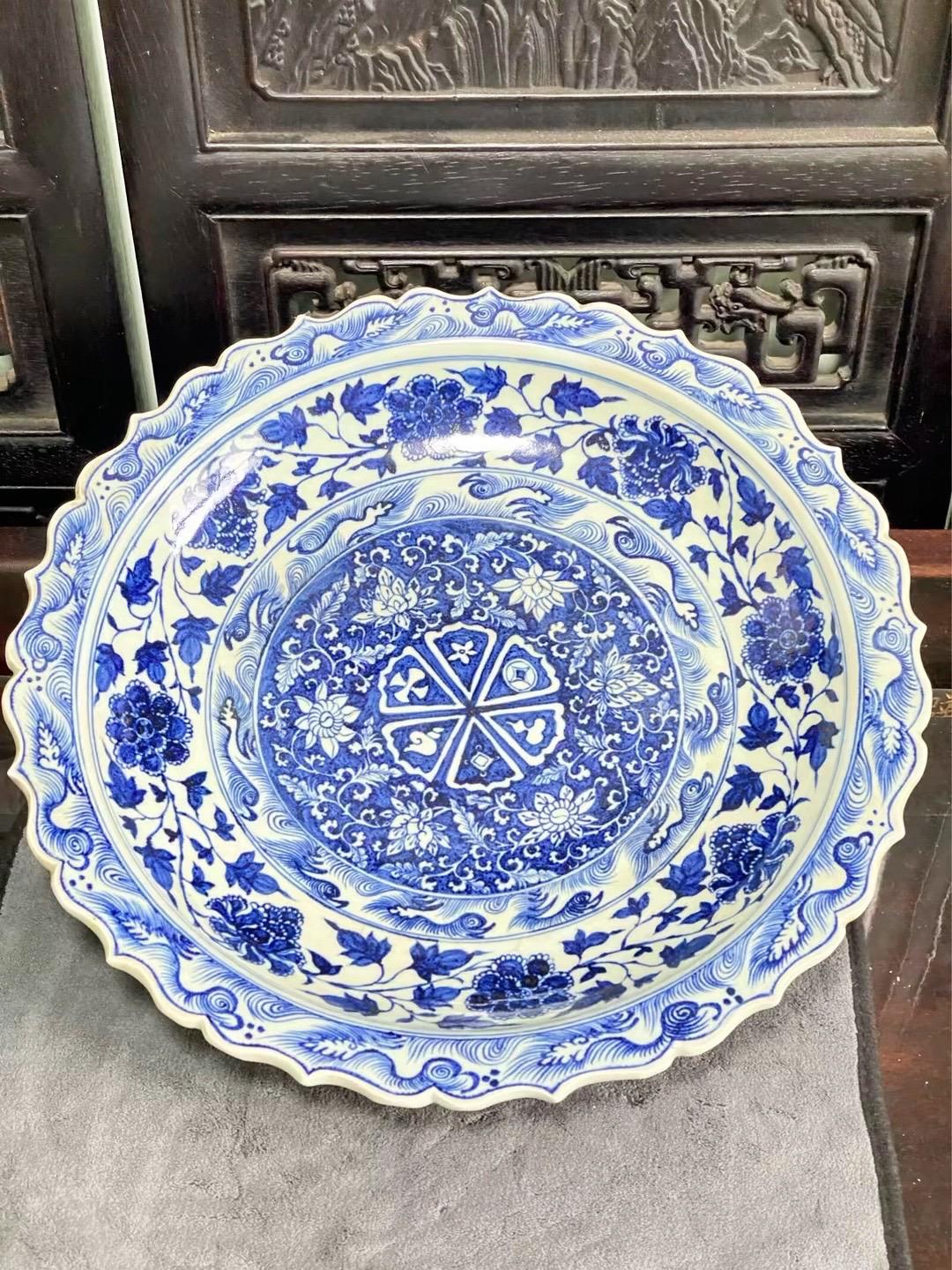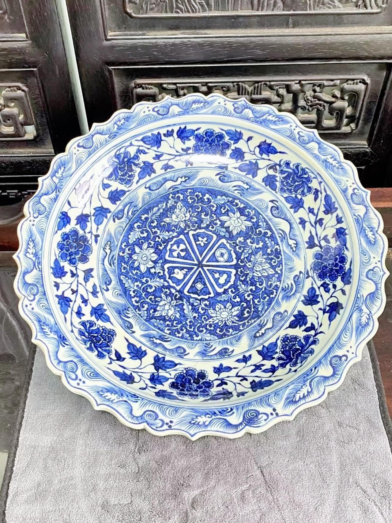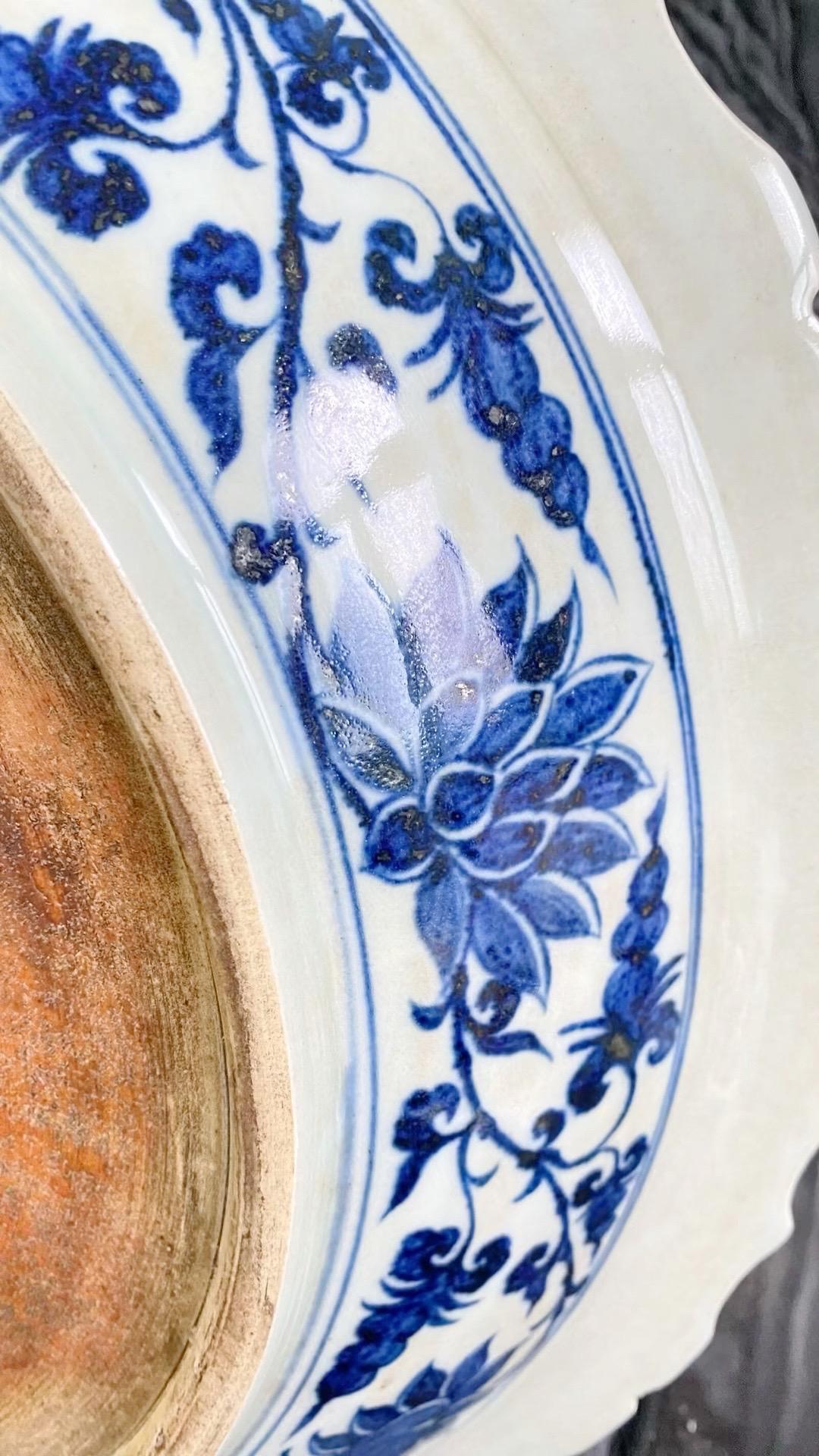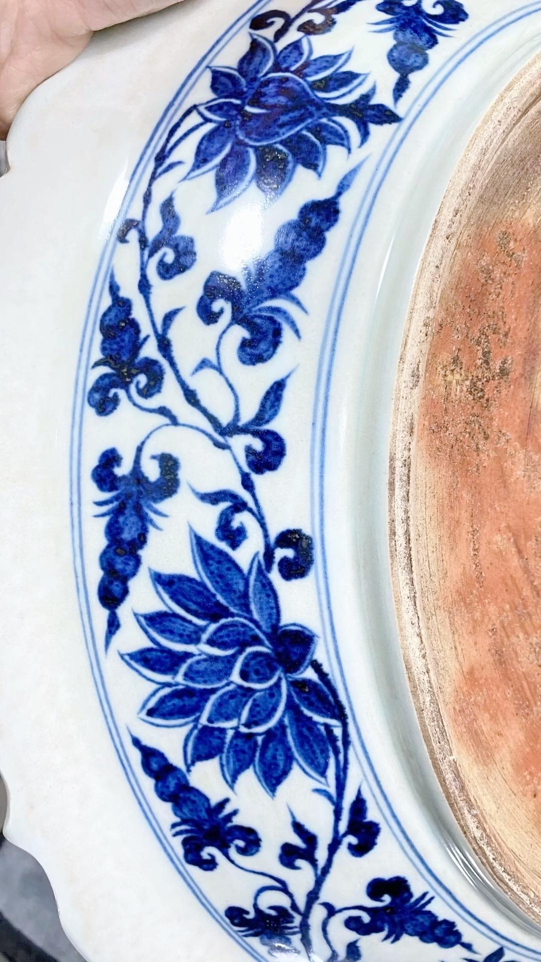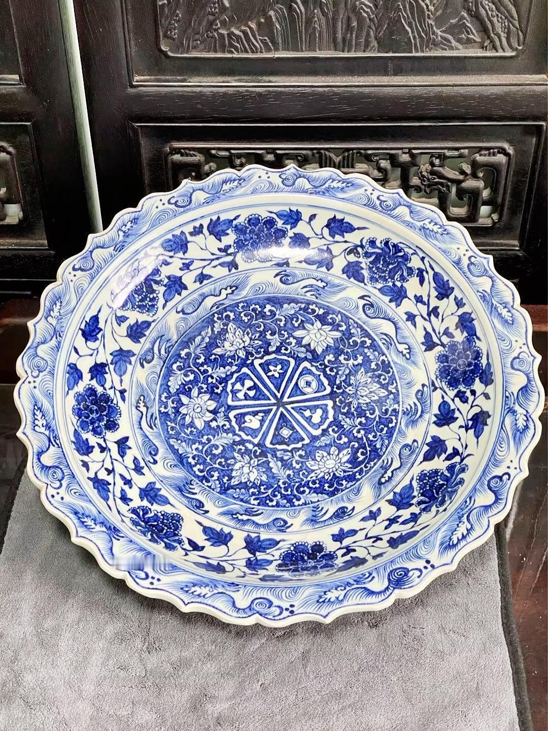 元青花缠枝牡丹纹宝相花菱口大赏盘欣赏:真正大开门的元青花精品,收藏几十年的一对宝物;青花发色蓝中泛紫,苏麻离青进口料特征开门、微观老化胎釉钙化结晶明显、气泡老化稀疏黑色褐色气泡;堪称真正大开门元青花到代真品!元青花 瓷器 古董