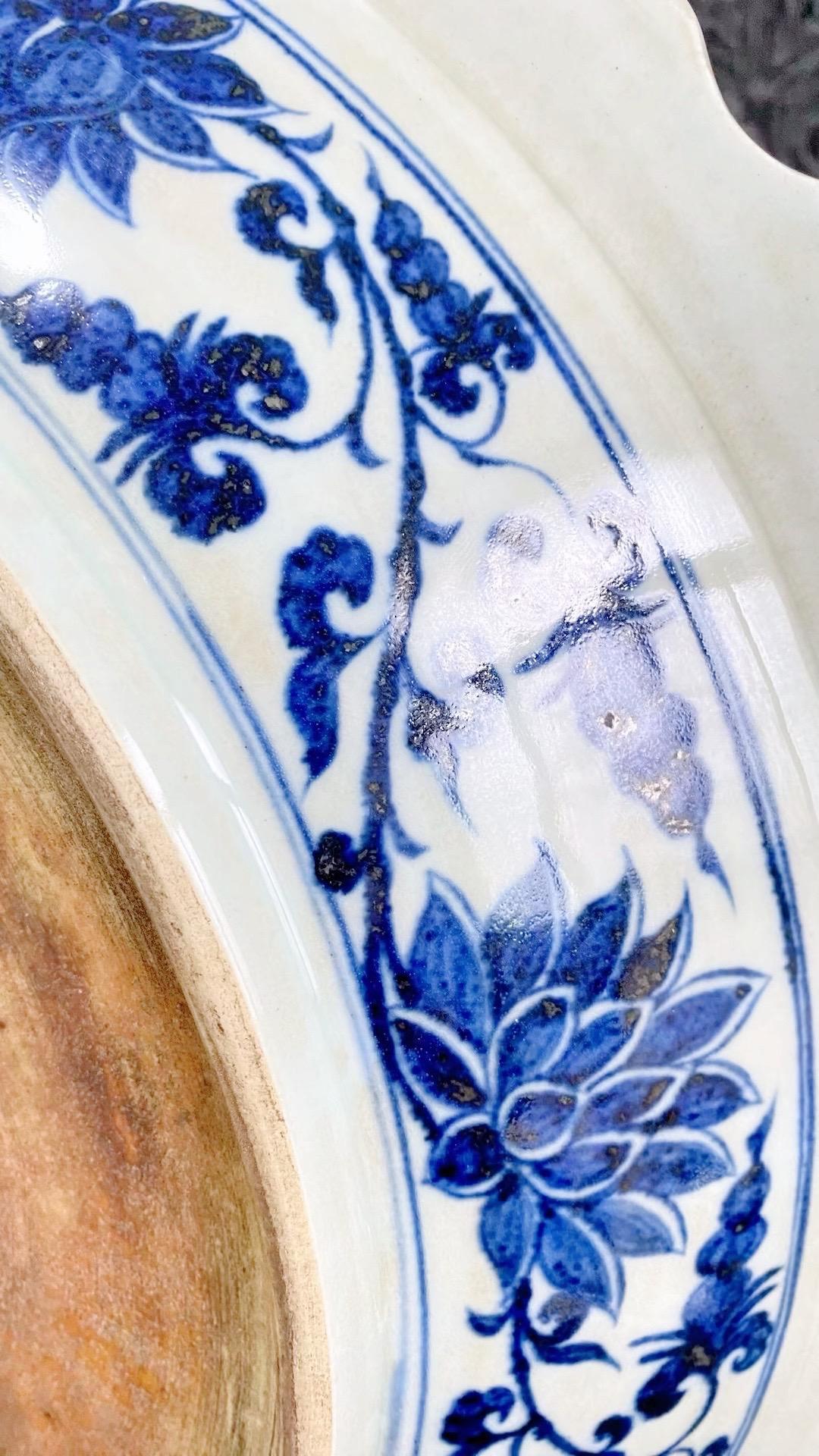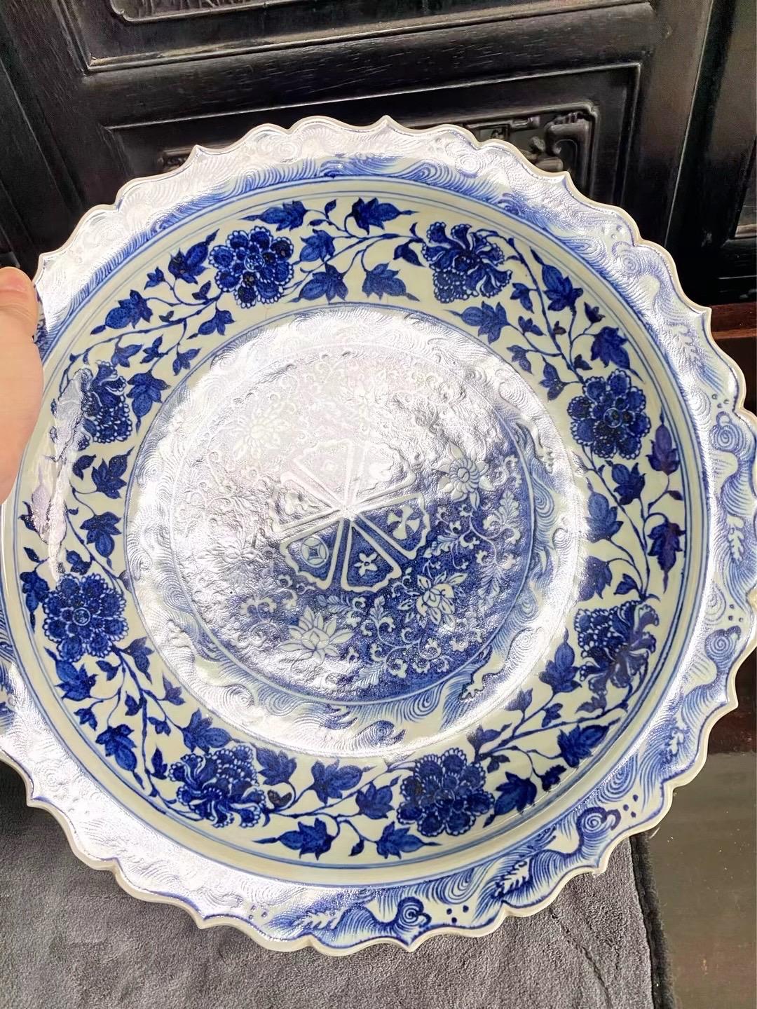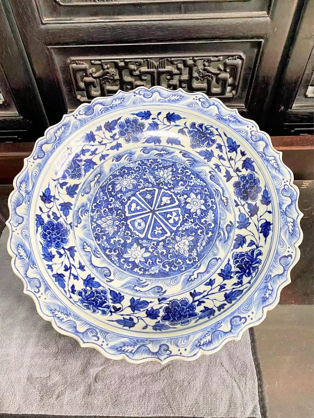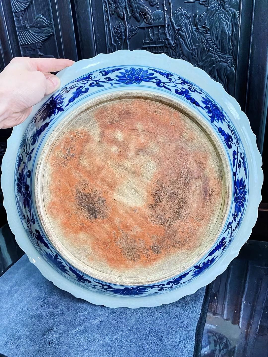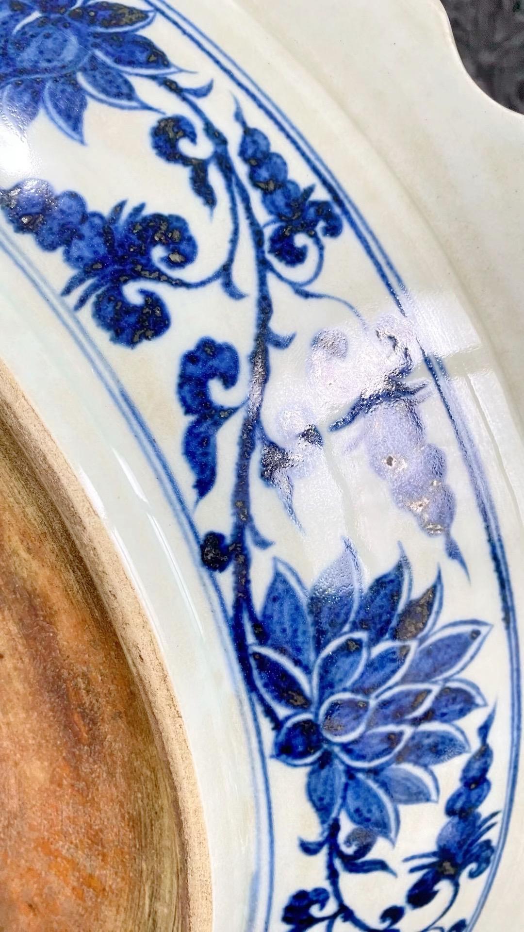 元青花缠枝牡丹纹宝相花菱口大赏盘欣赏:真正大开门的元青花精品,收藏几十年的一对宝物;青花发色蓝中泛紫,苏麻离青进口料特征开门、微观老化胎釉钙化结晶明显、气泡老化稀疏黑色褐色气泡;堪称真正大开门元青花到代真品!元青花 瓷器 古董