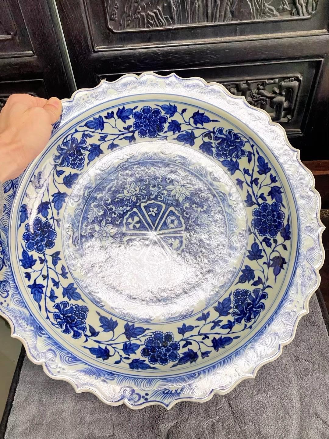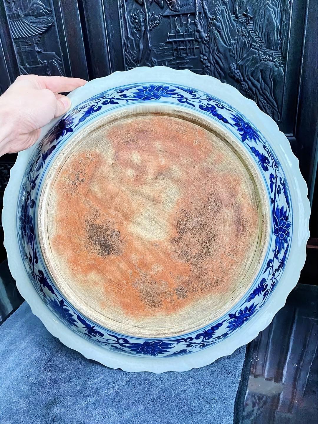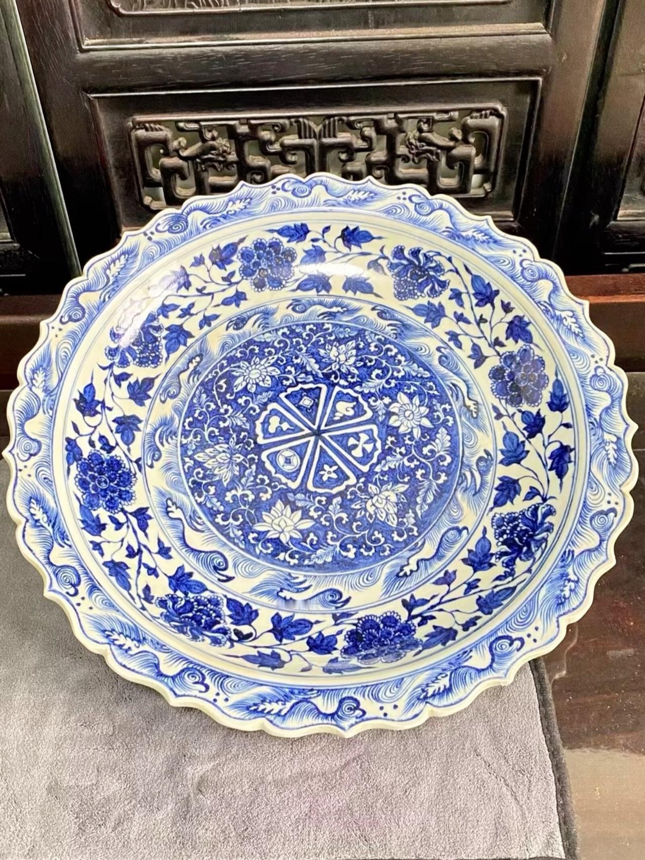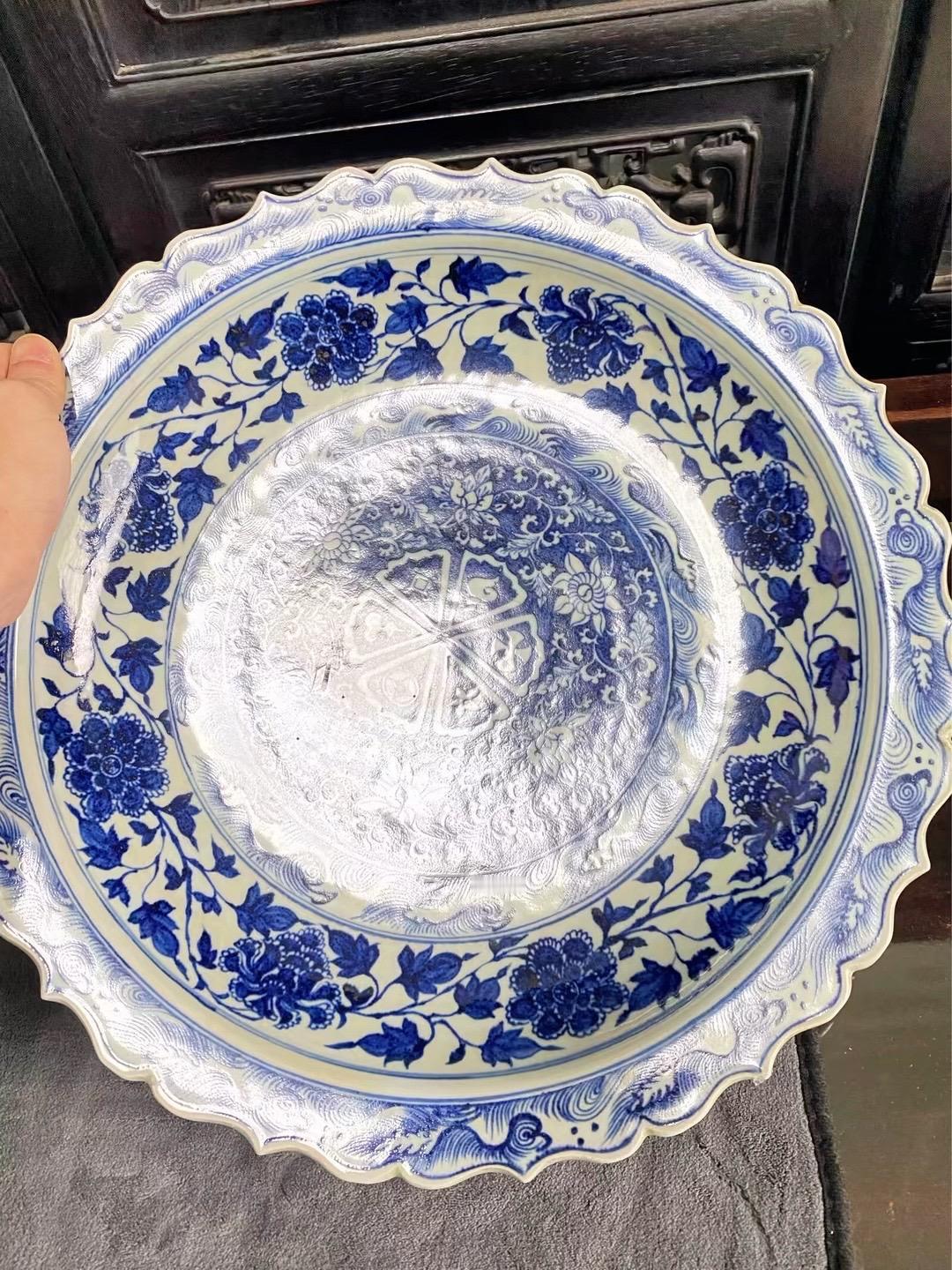 元青花缠枝牡丹纹宝相花菱口大赏盘欣赏:真正大开门的元青花精品,收藏几十年的一对宝物;青花发色蓝中泛紫,苏麻离青进口料特征开门、微观老化胎釉钙化结晶明显、气泡老化稀疏黑色褐色气泡;堪称真正大开门元青花到代真品!元青花 瓷器 古董