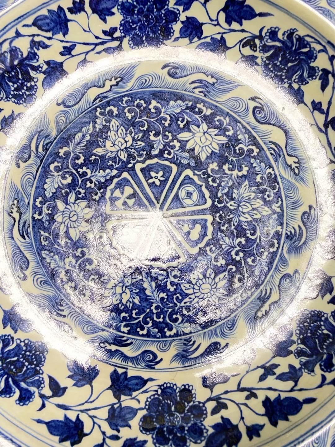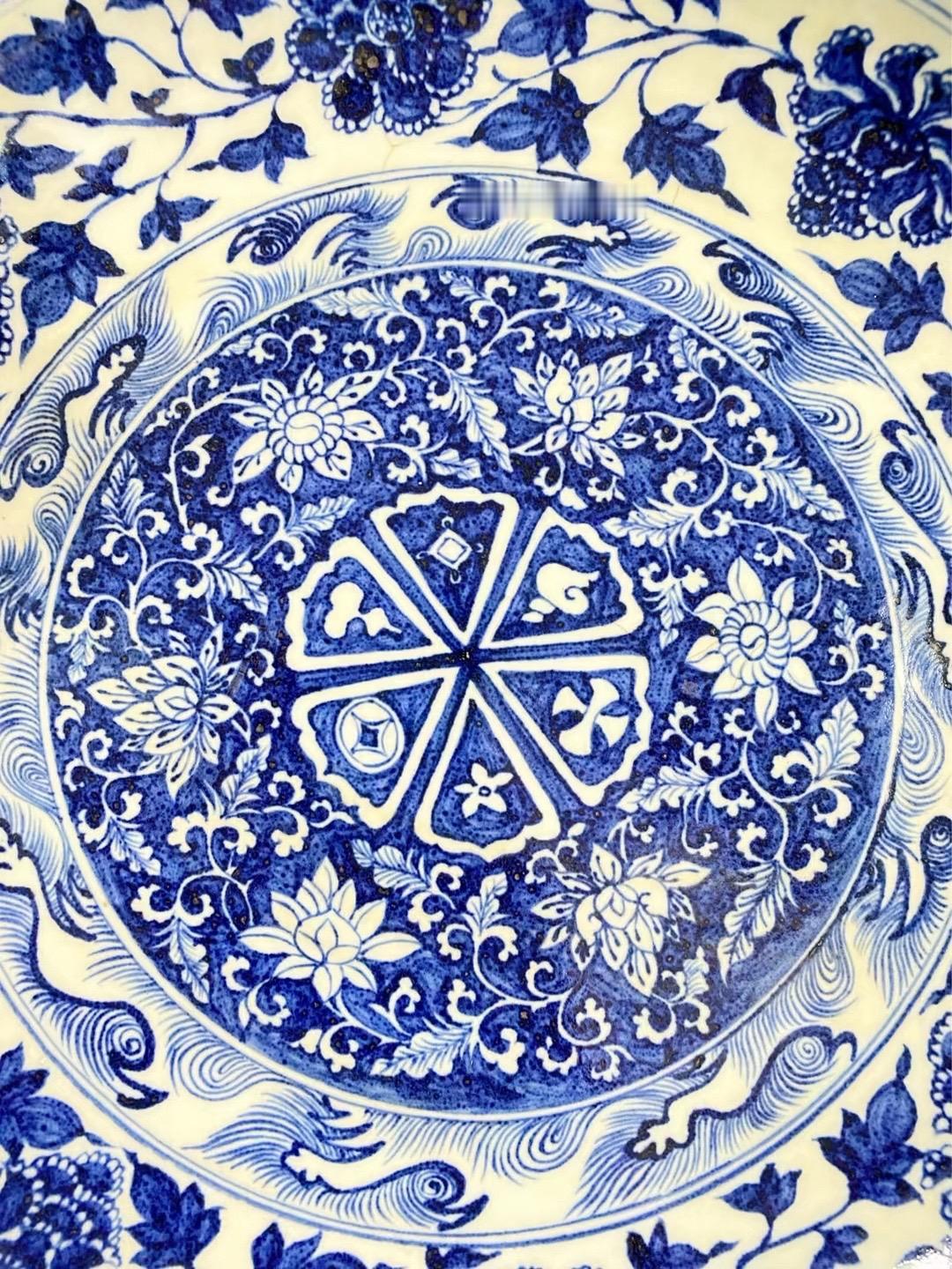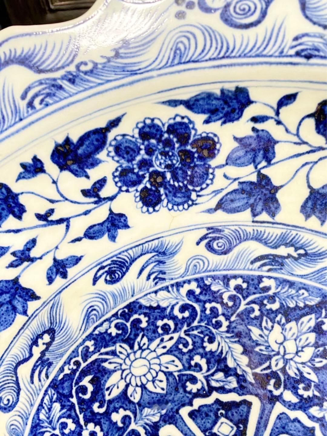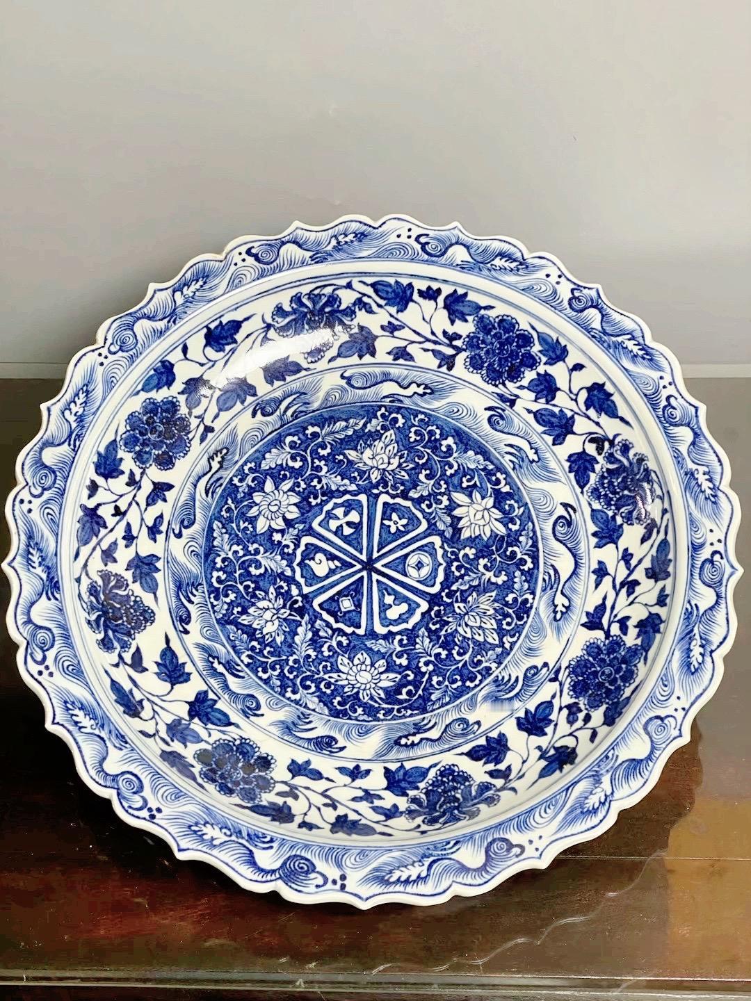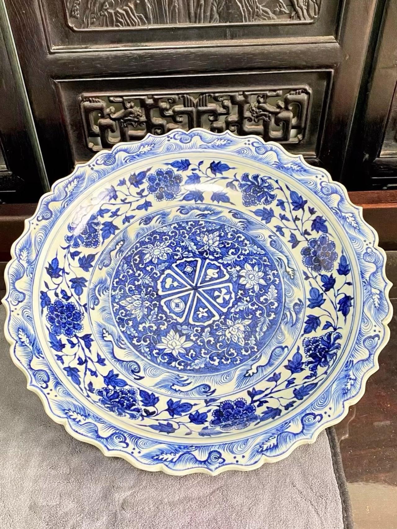 元青花缠枝牡丹纹宝相花菱口大赏盘欣赏:真正大开门的元青花精品,收藏几十年的一对宝物;青花发色蓝中泛紫,苏麻离青进口料特征开门、微观老化胎釉钙化结晶明显、气泡老化稀疏黑色褐色气泡;堪称真正大开门元青花到代真品!元青花 瓷器 古董