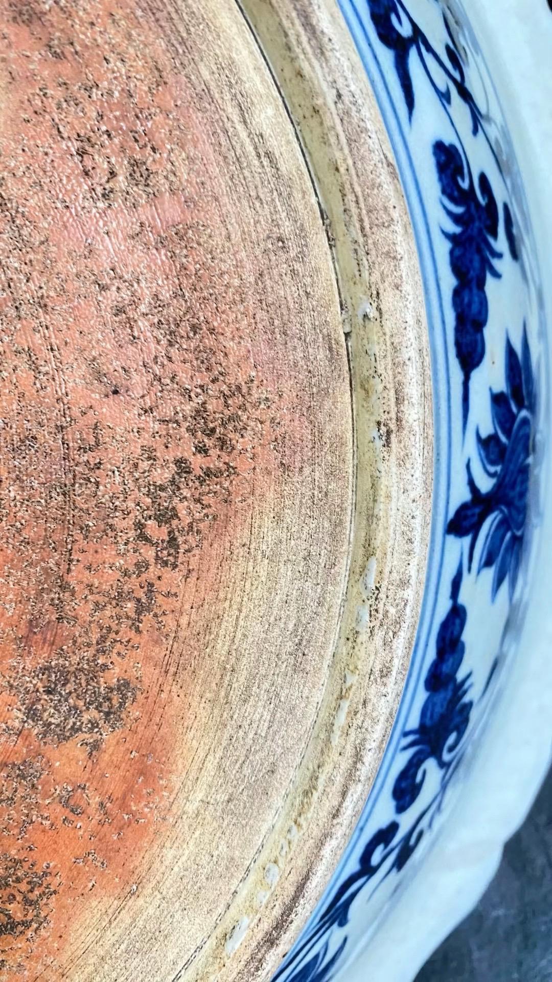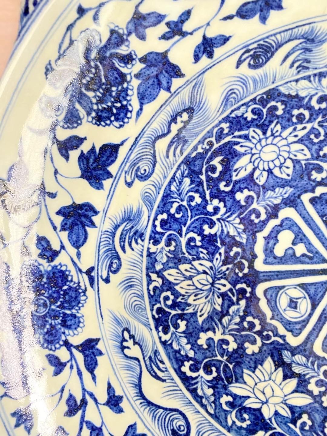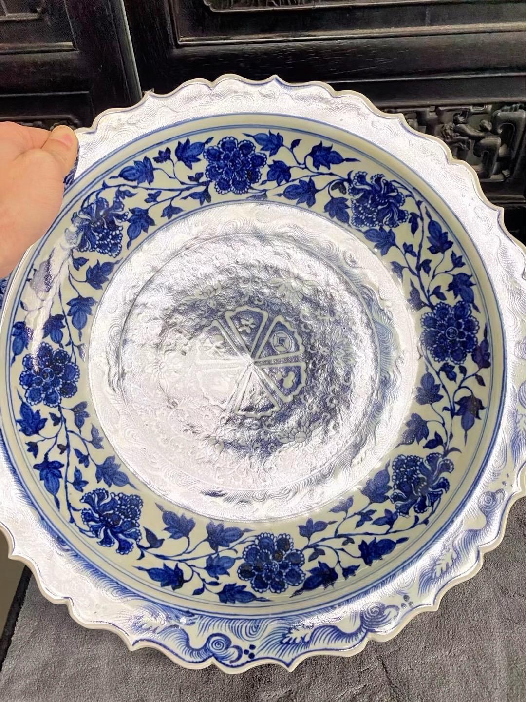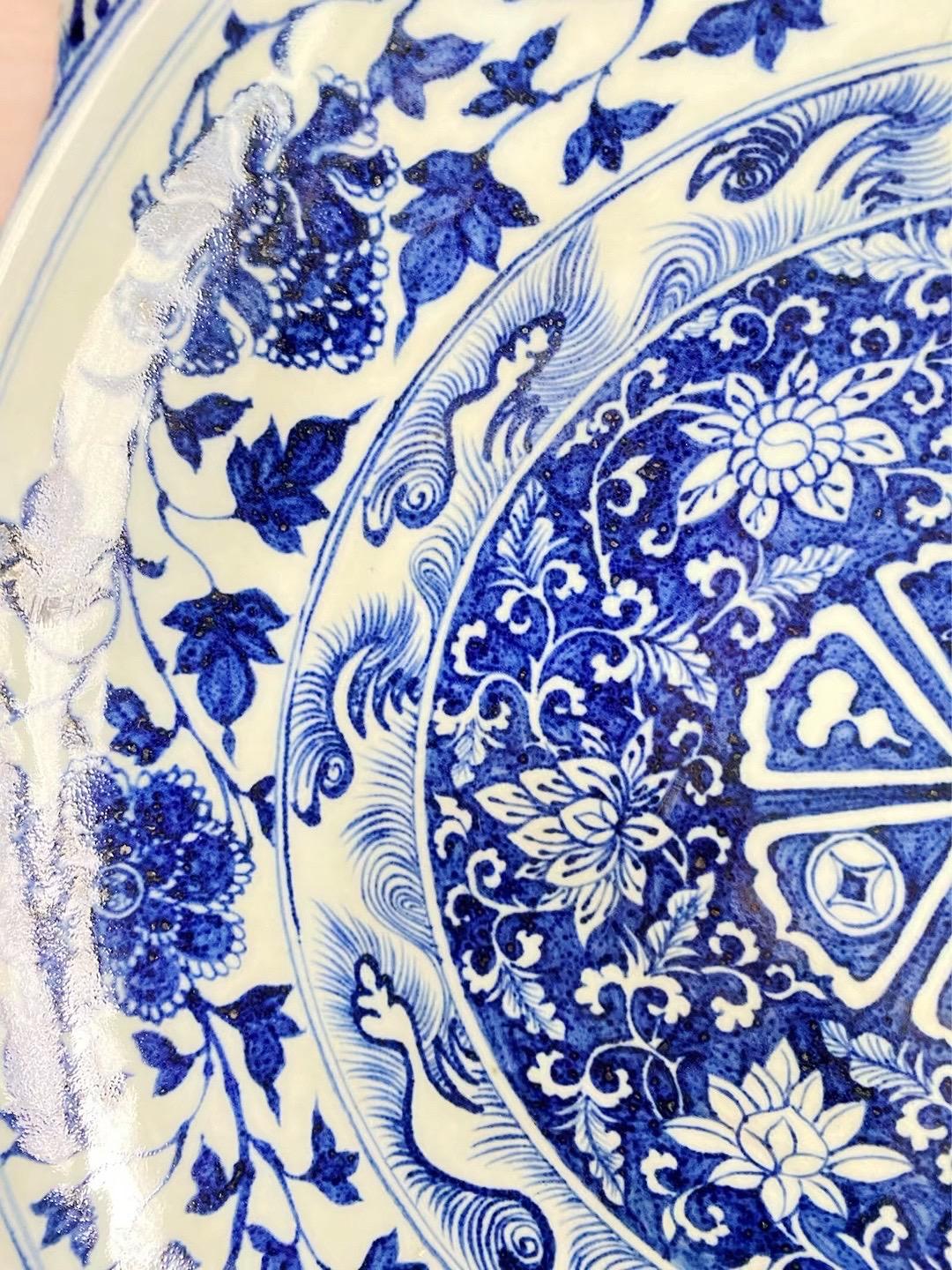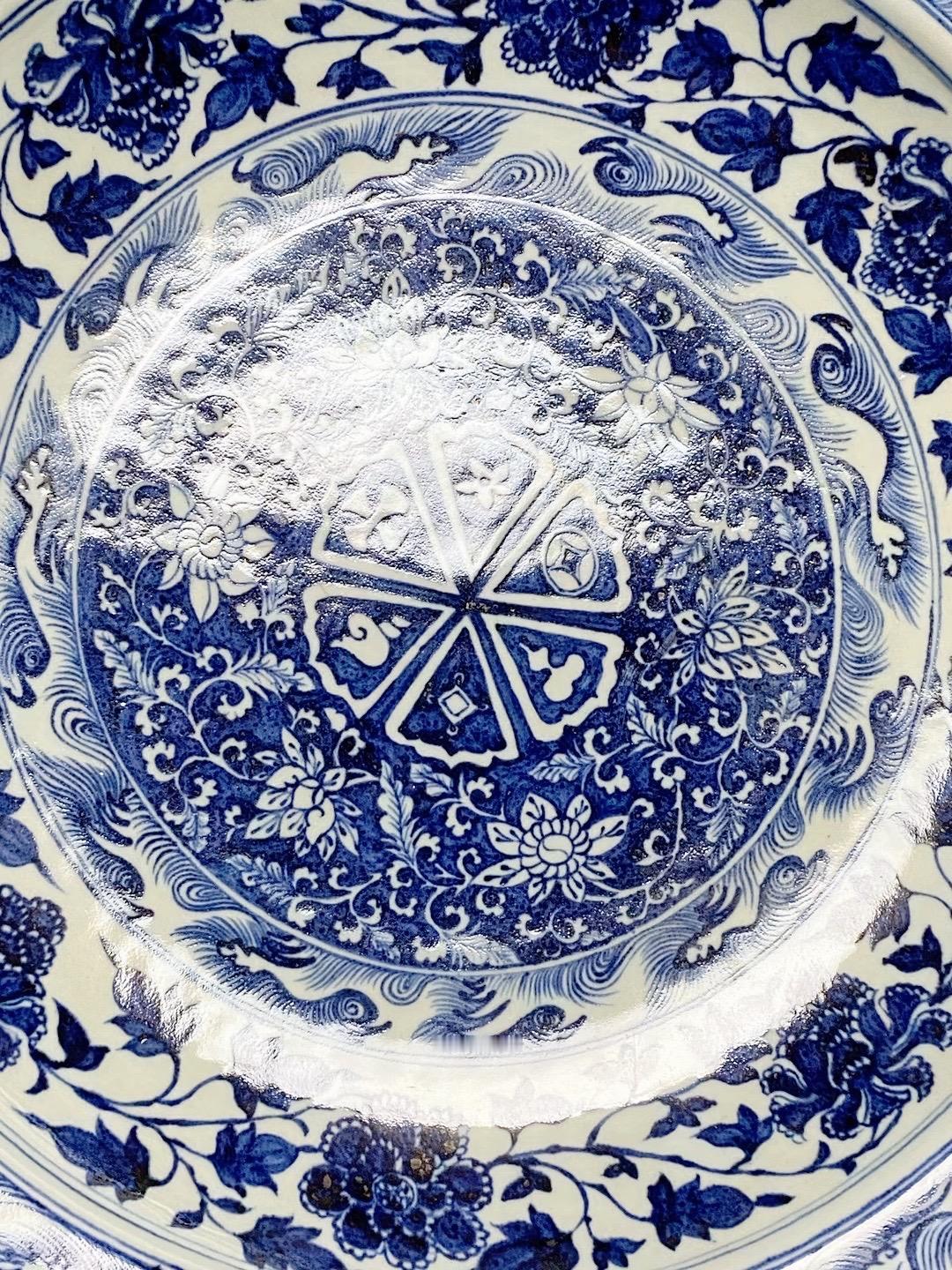 元青花缠枝牡丹纹宝相花菱口大赏盘欣赏:真正大开门的元青花精品,收藏几十年的一对宝物;青花发色蓝中泛紫,苏麻离青进口料特征开门、微观老化胎釉钙化结晶明显、气泡老化稀疏黑色褐色气泡;堪称真正大开门元青花到代真品!元青花 瓷器 古董