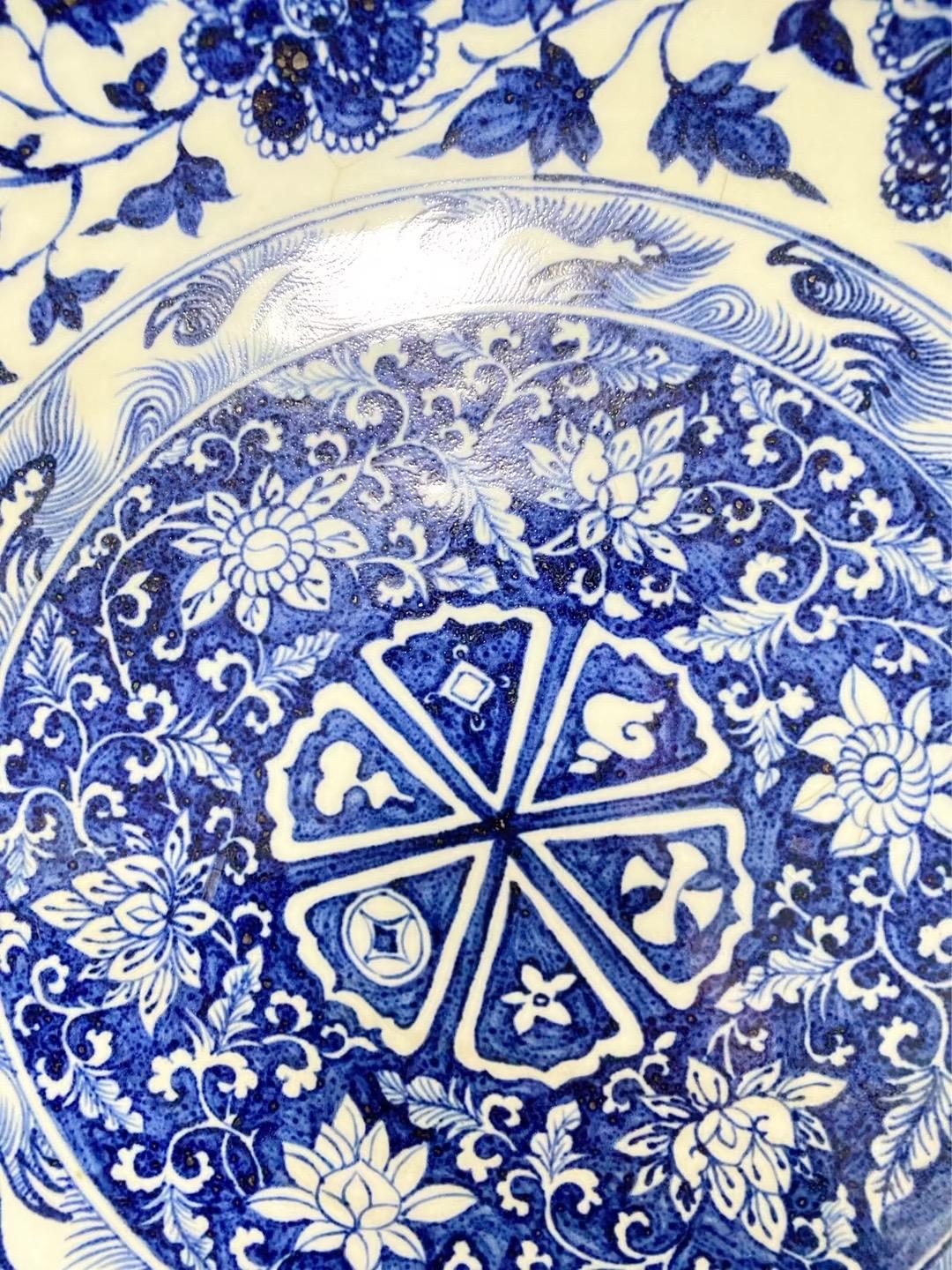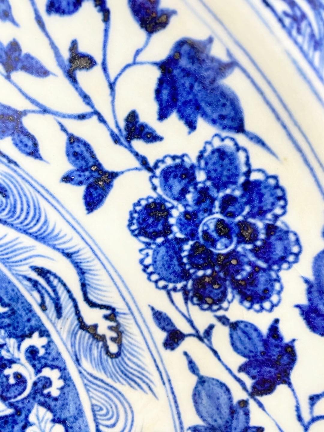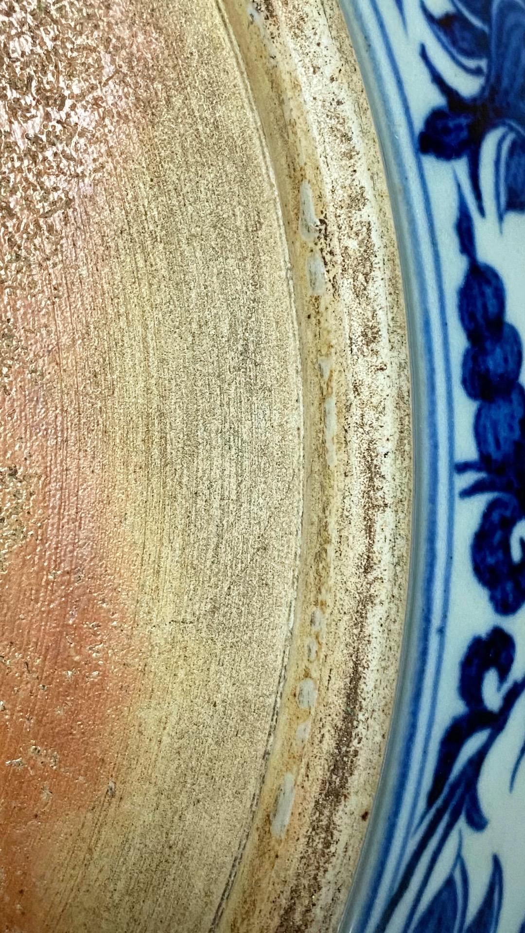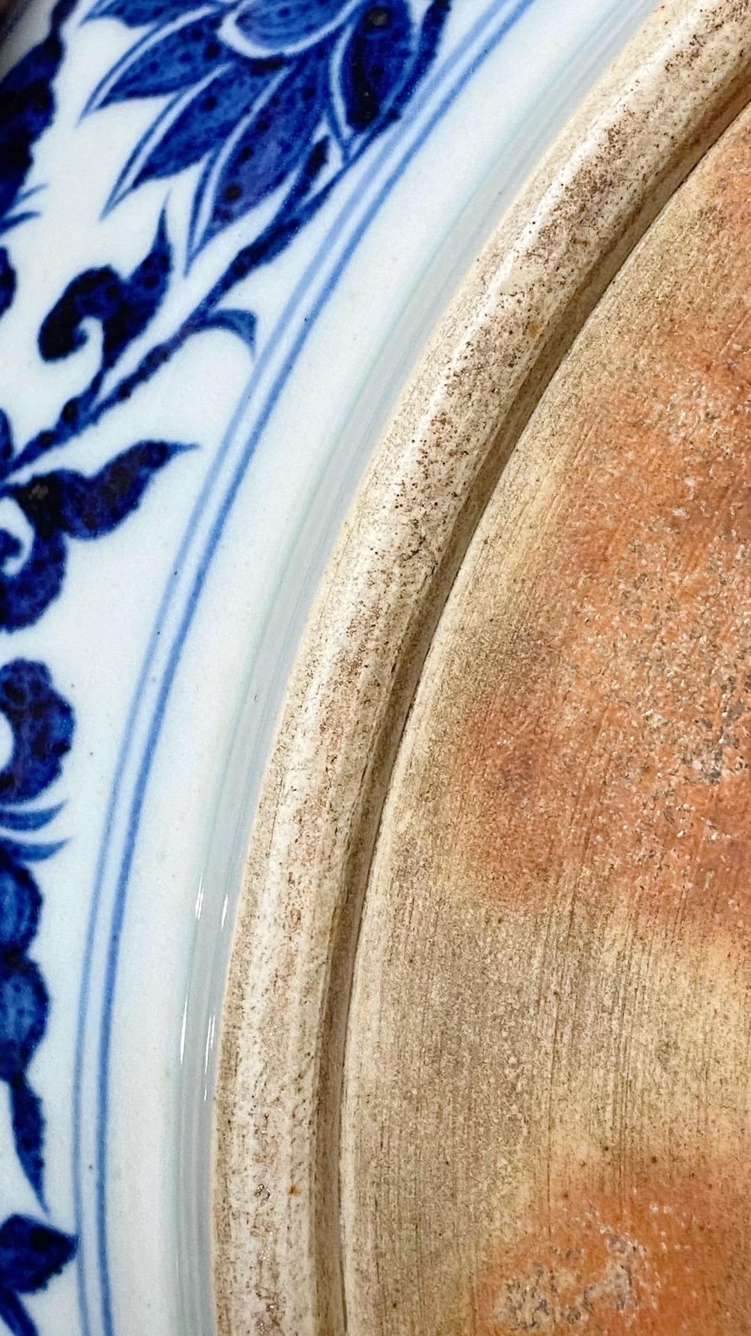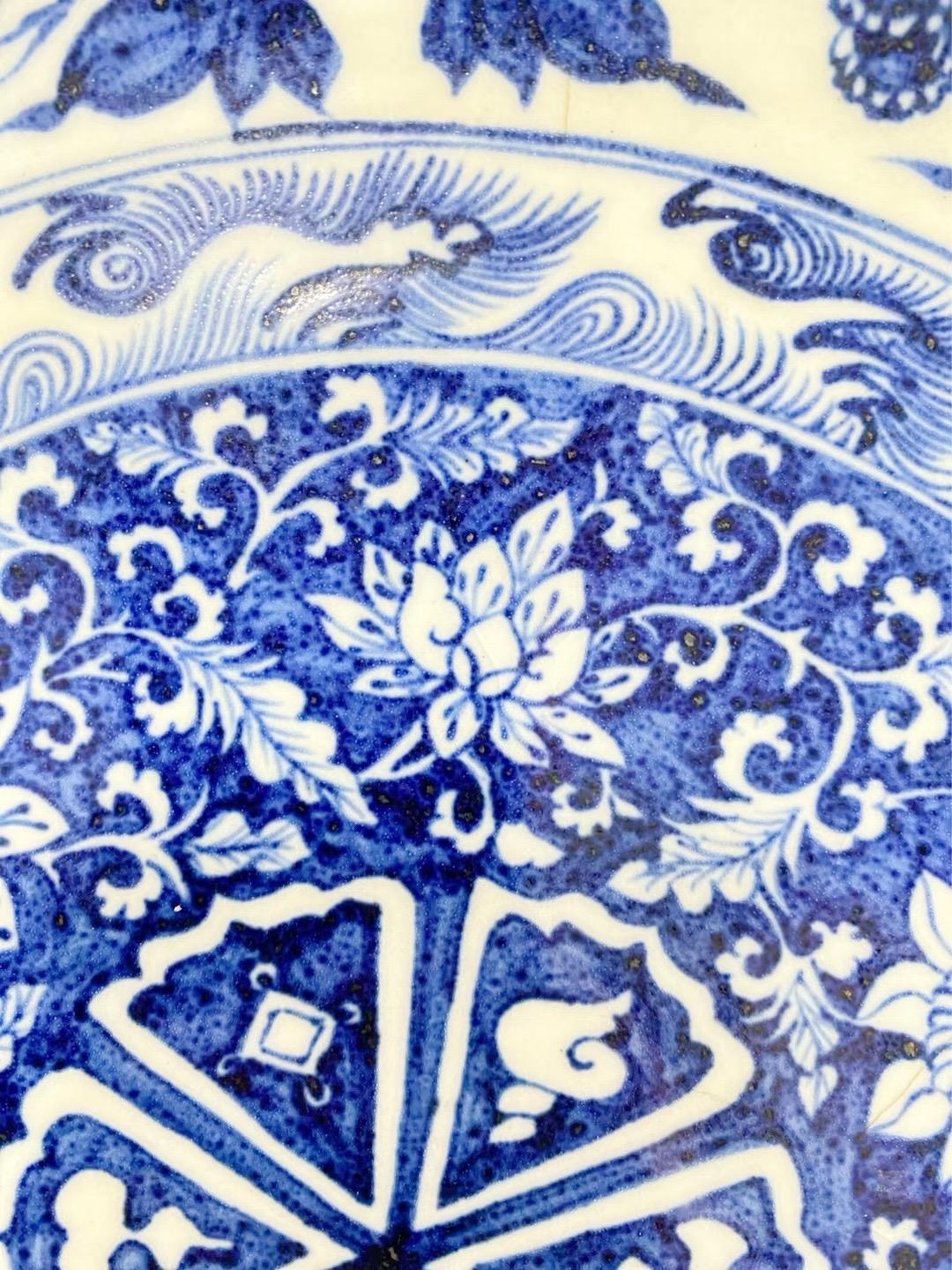 元青花缠枝牡丹纹宝相花菱口大赏盘欣赏:真正大开门的元青花精品,收藏几十年的一对宝物;青花发色蓝中泛紫,苏麻离青进口料特征开门、微观老化胎釉钙化结晶明显、气泡老化稀疏黑色褐色气泡;堪称真正大开门元青花到代真品!元青花 瓷器 古董