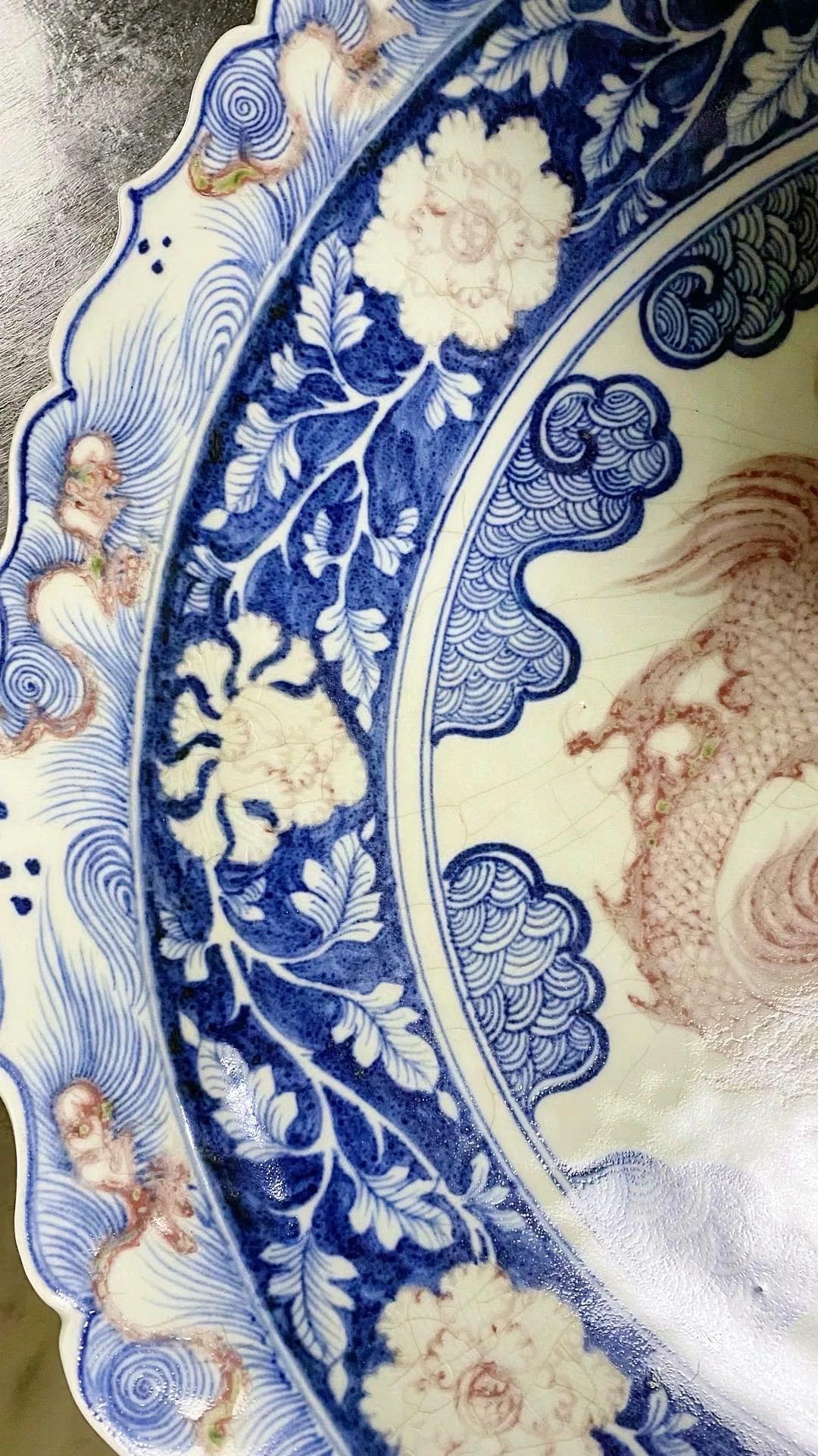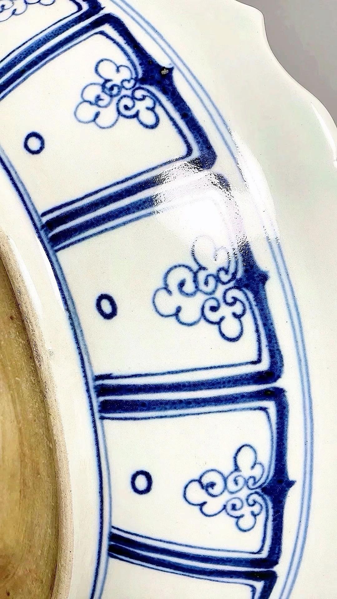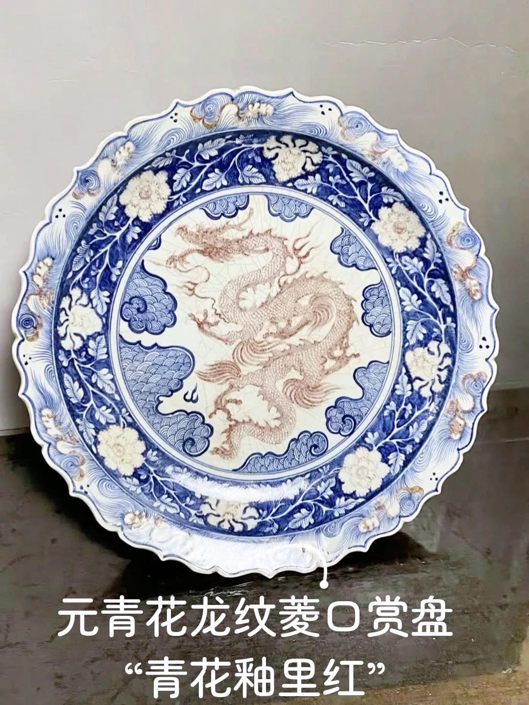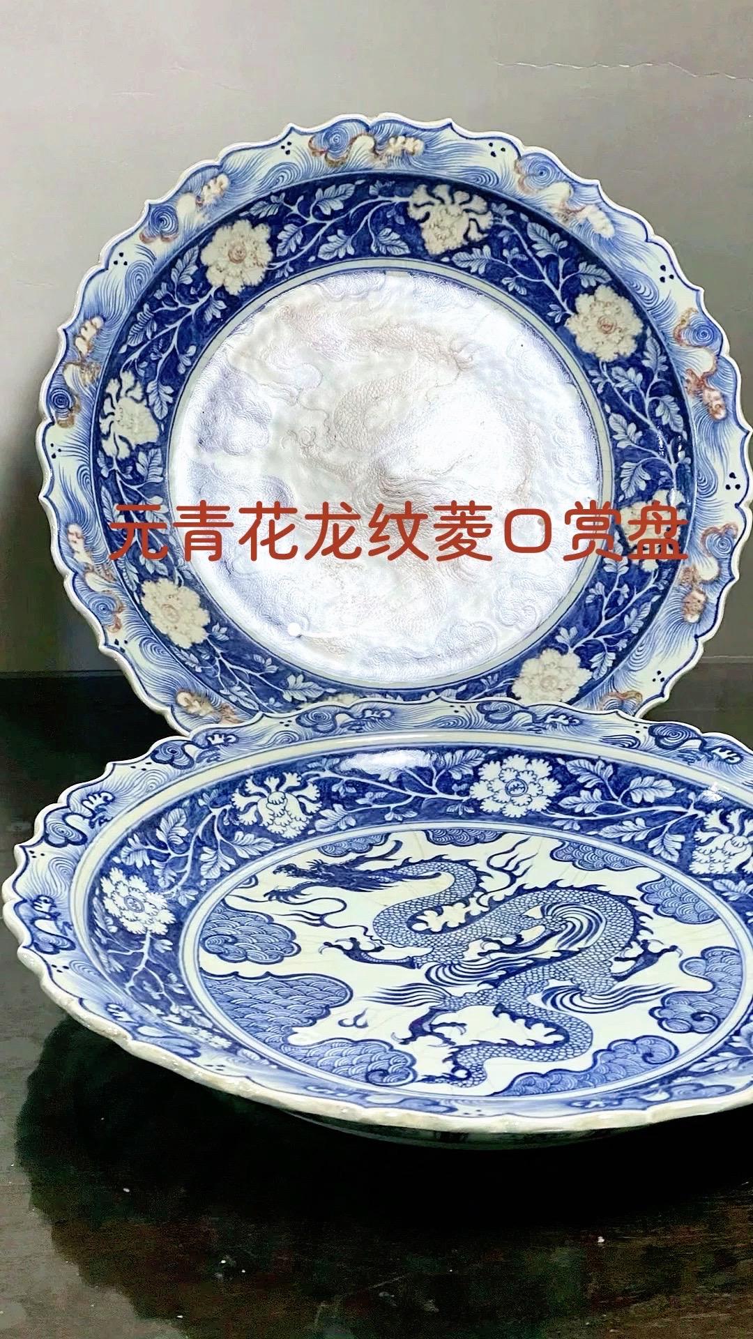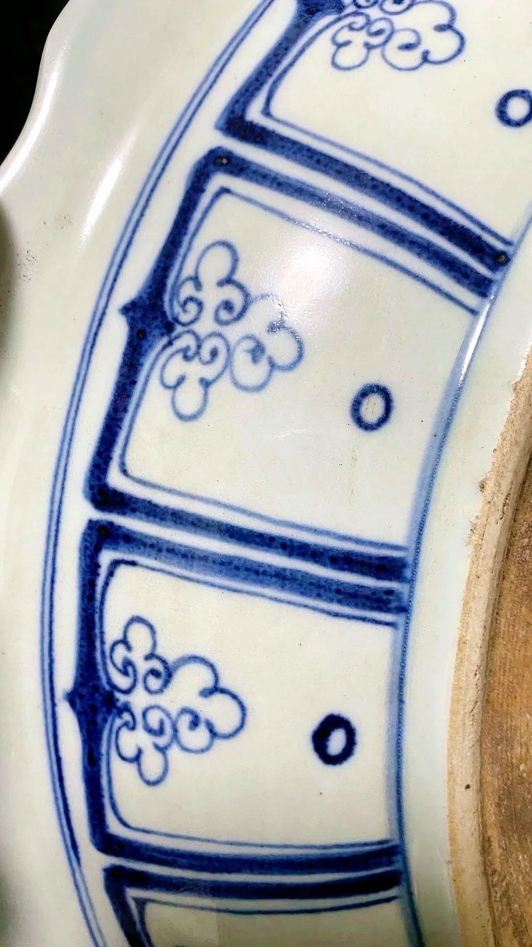 元青花龙纹菱口赏盘欣赏,真正大开门元青花真品;苏麻离青进口料陈胎感明显,宝光笼罩釉水肥厚、胎釉表面细腻棕眼;局部稀疏土沁大开片,微观老化密集的黑色、褐色气泡老化;麻仓土胎土老化明显,真正大开门的元青花瓷器鉴赏!元青花 瓷器 古董 收藏