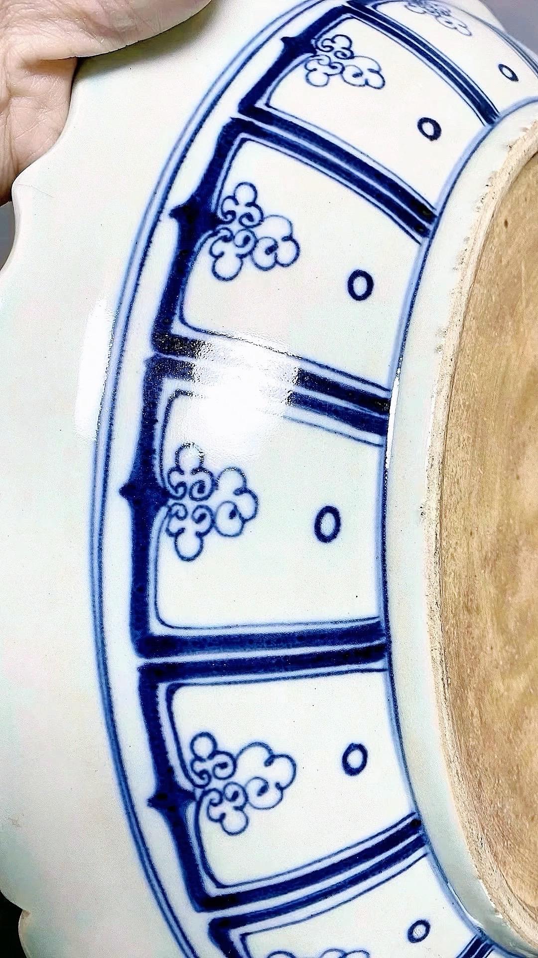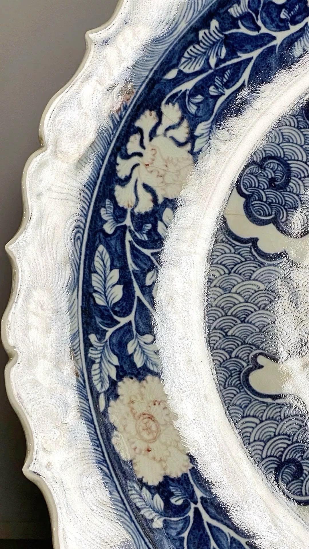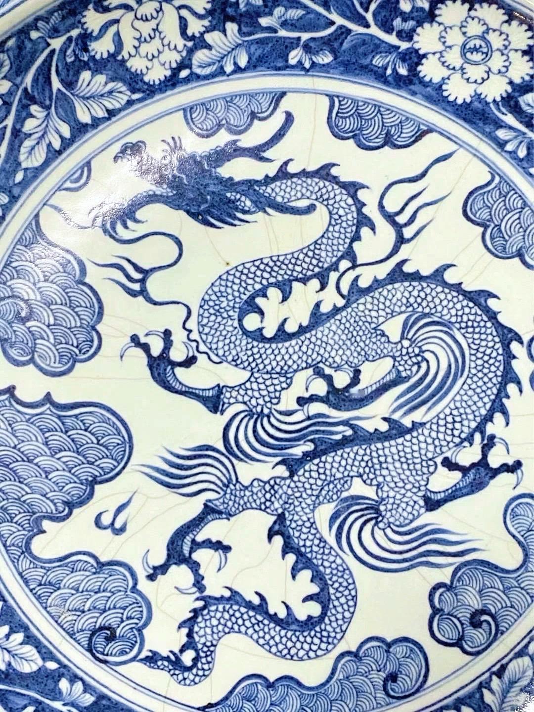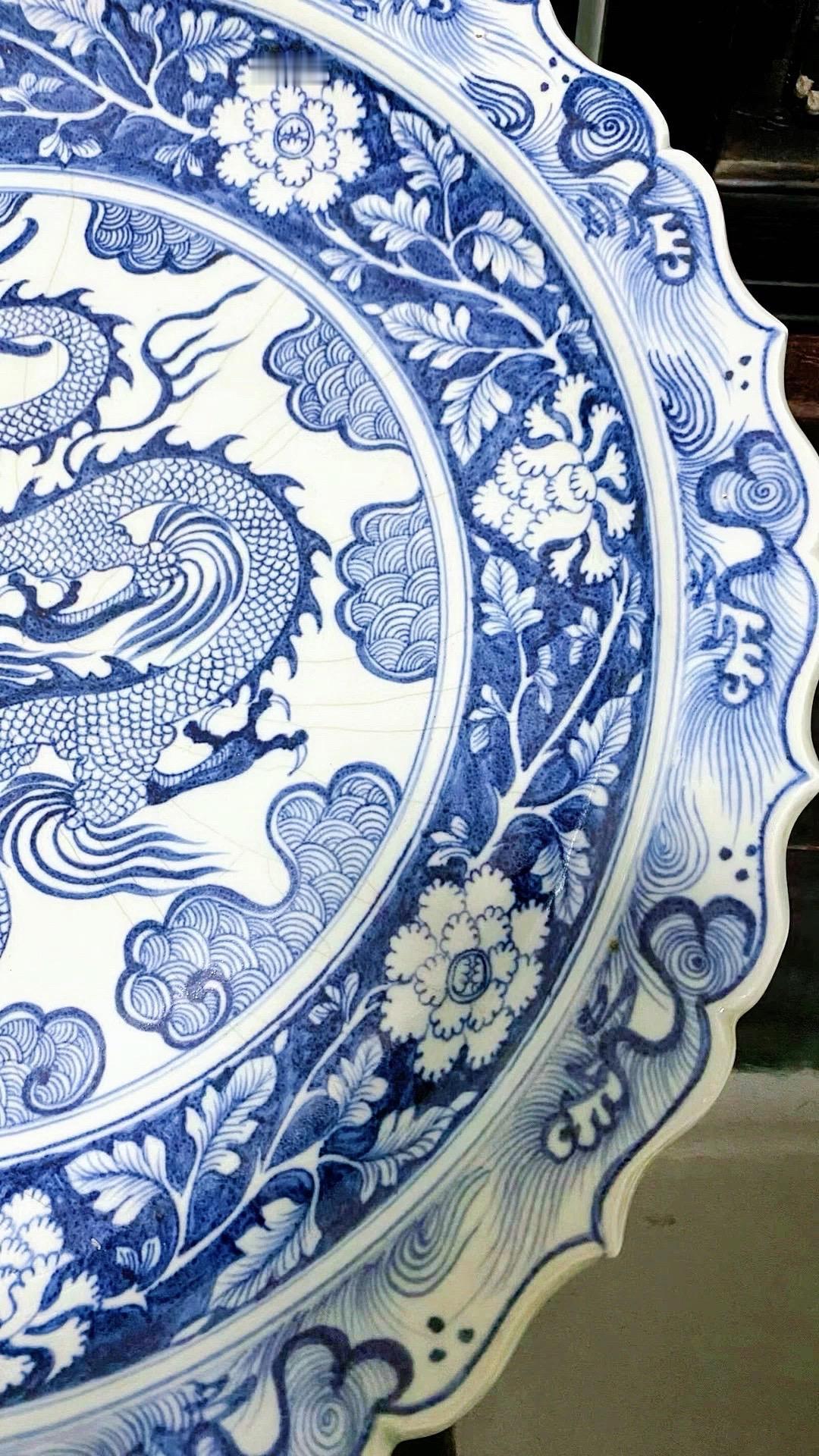 元青花龙纹菱口赏盘欣赏,真正大开门元青花真品;苏麻离青进口料陈胎感明显,宝光笼罩釉水肥厚、胎釉表面细腻棕眼;局部稀疏土沁大开片,微观老化密集的黑色、褐色气泡老化;麻仓土胎土老化明显,真正大开门的元青花瓷器鉴赏!元青花 瓷器 古董 收藏