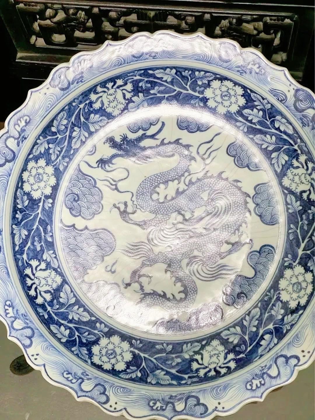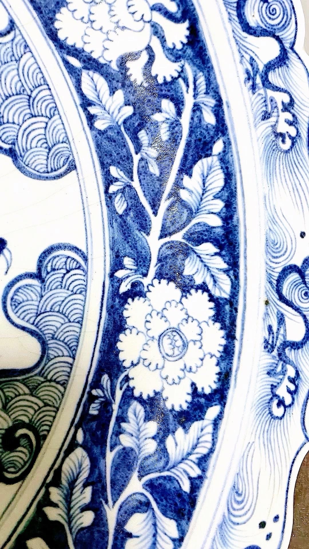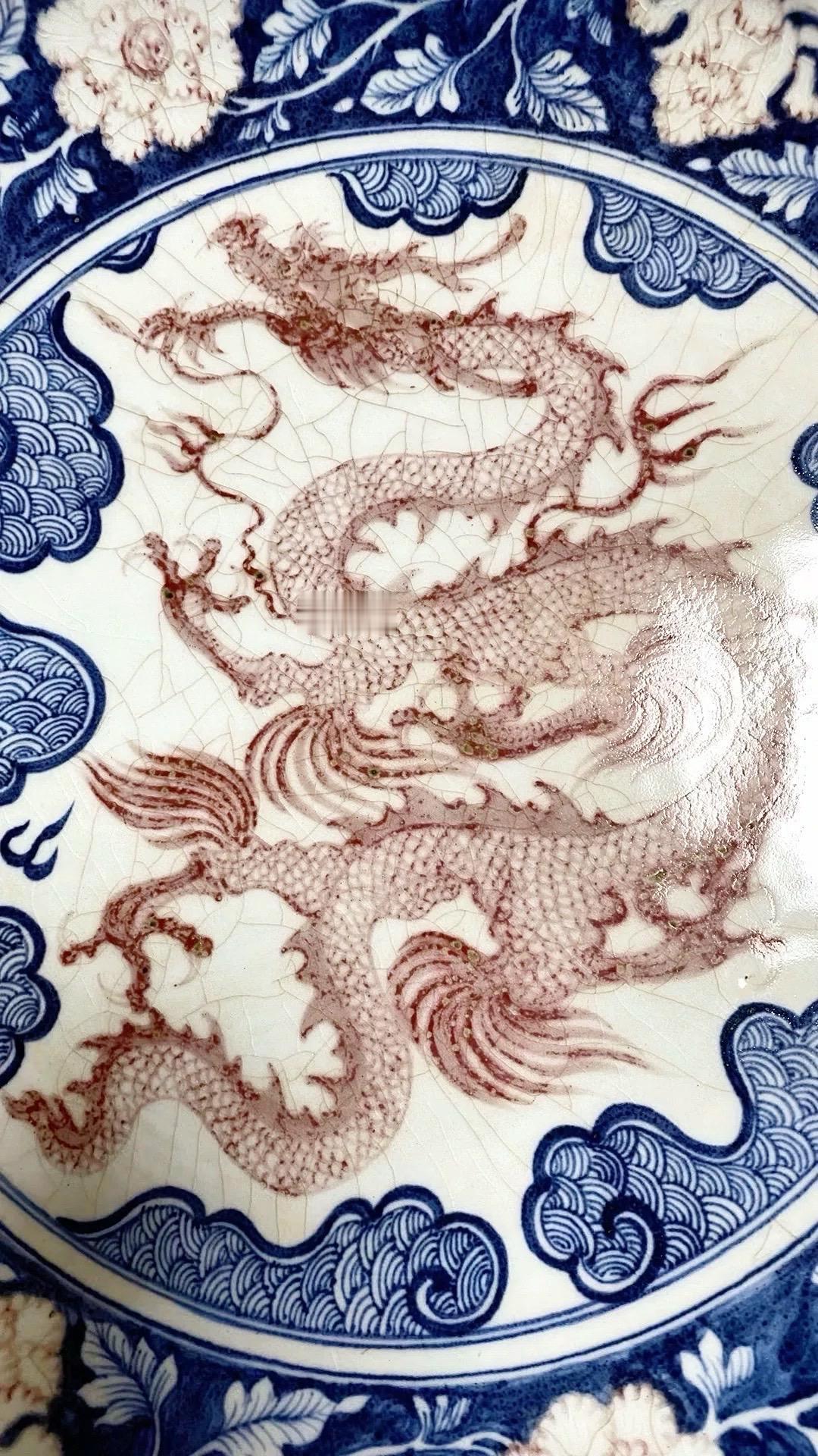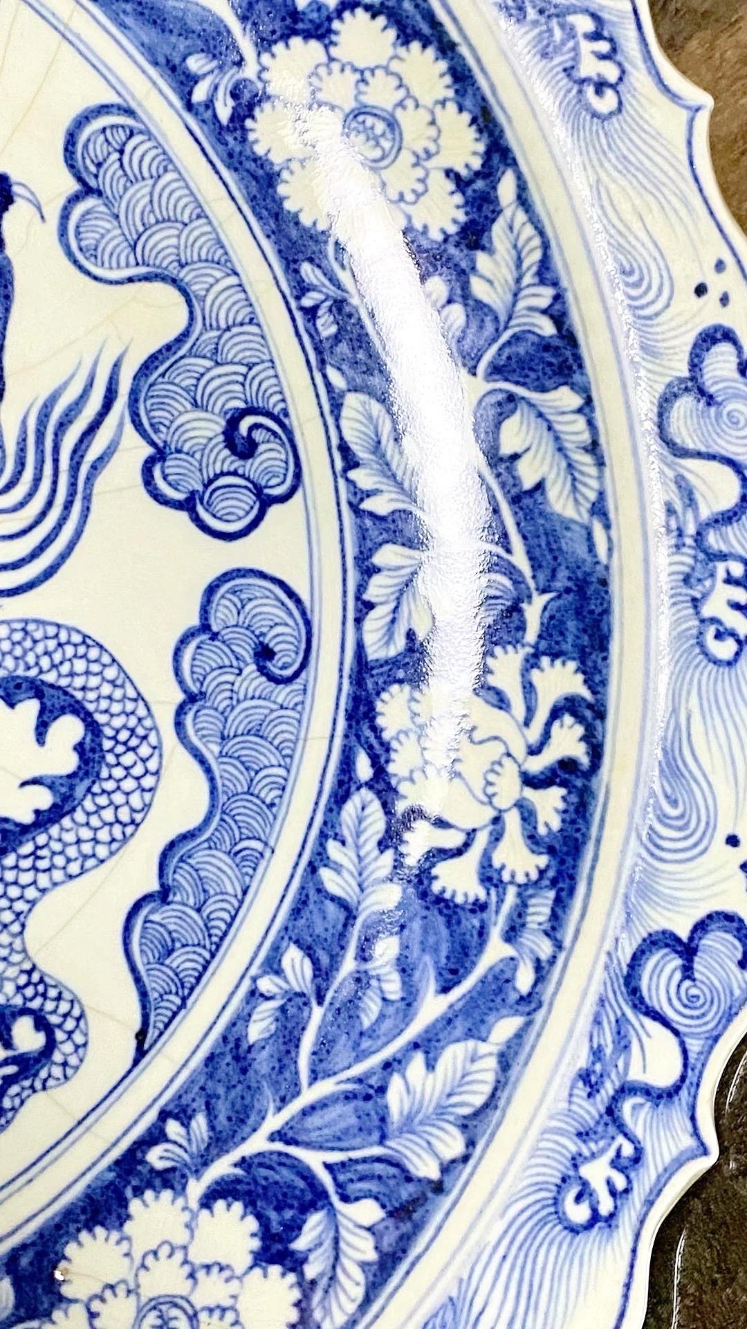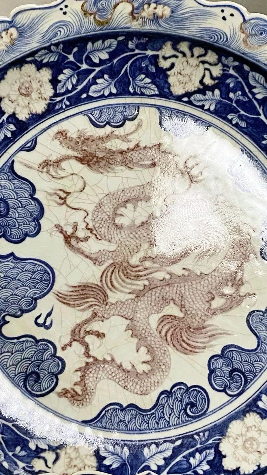 元青花龙纹菱口赏盘欣赏,真正大开门元青花真品;苏麻离青进口料陈胎感明显,宝光笼罩釉水肥厚、胎釉表面细腻棕眼;局部稀疏土沁大开片,微观老化密集的黑色、褐色气泡老化;麻仓土胎土老化明显,真正大开门的元青花瓷器鉴赏!元青花 瓷器 古董 收藏