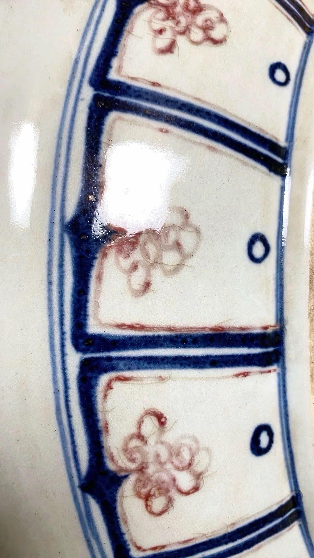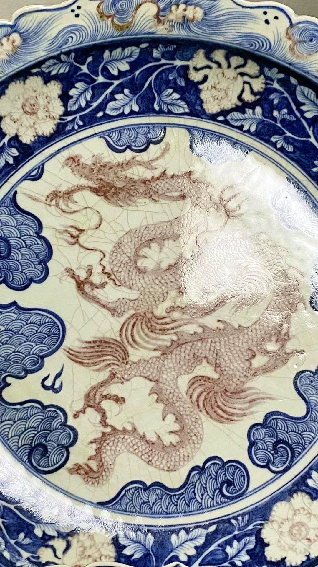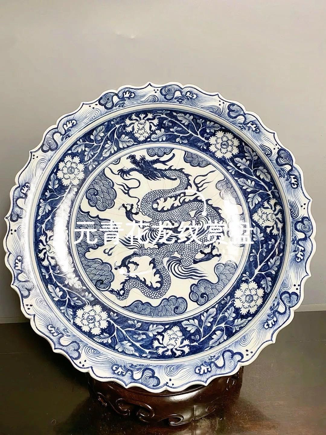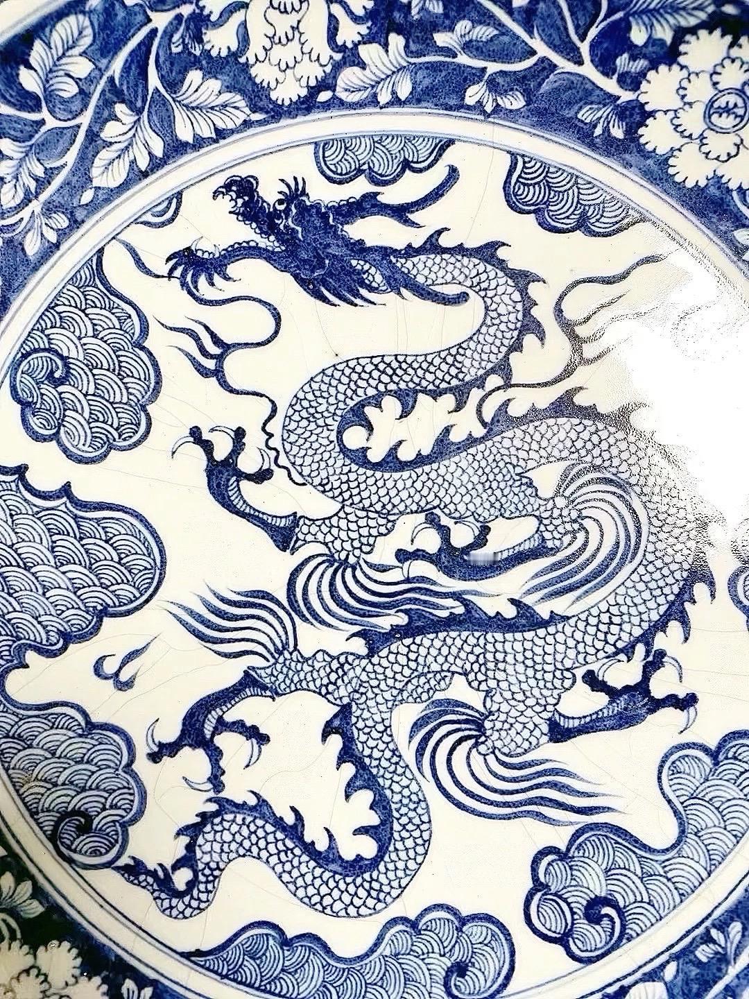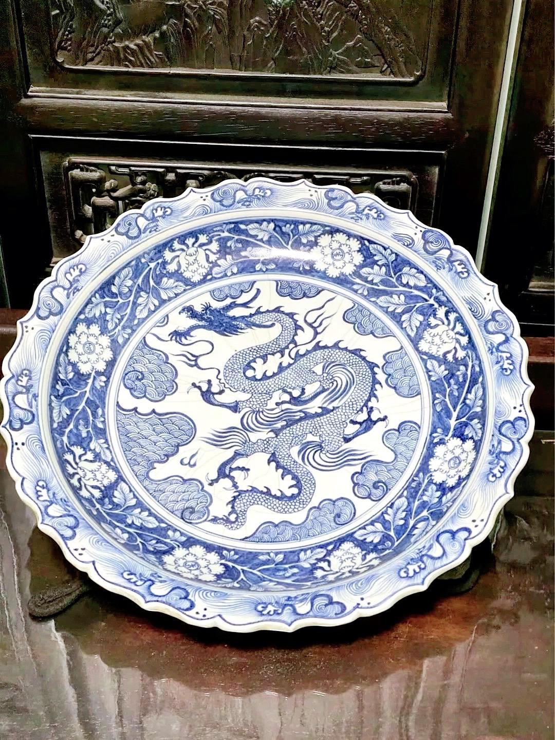 元青花龙纹菱口赏盘欣赏,真正大开门元青花真品;苏麻离青进口料陈胎感明显,宝光笼罩釉水肥厚、胎釉表面细腻棕眼;局部稀疏土沁大开片,微观老化密集的黑色、褐色气泡老化;麻仓土胎土老化明显,真正大开门的元青花瓷器鉴赏!元青花 瓷器 古董 收藏