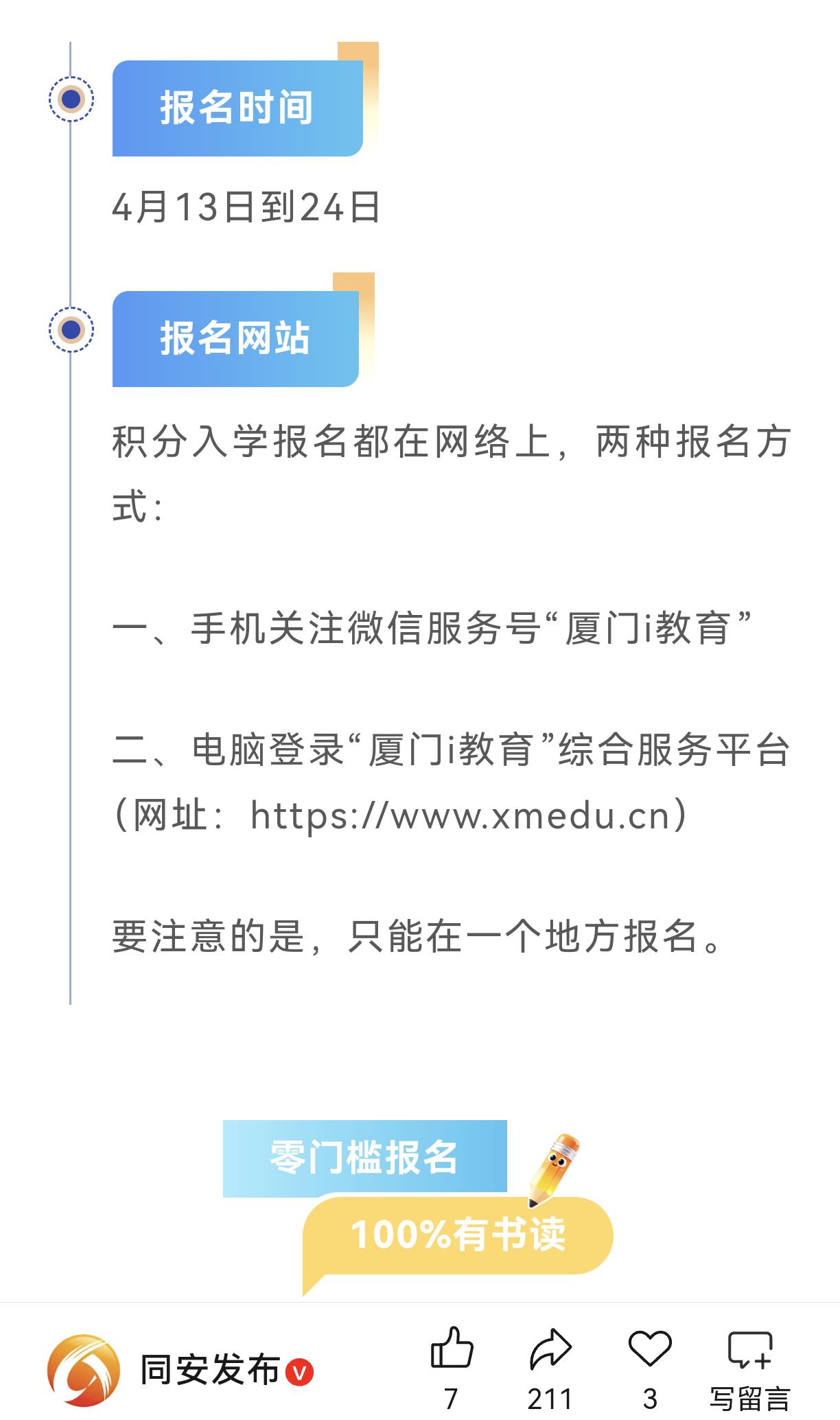 厦门积分入学开始报名了,现在实现了零门槛报名,100%有书读。外来务工人员,就不用担心小孩没有小学可读了。