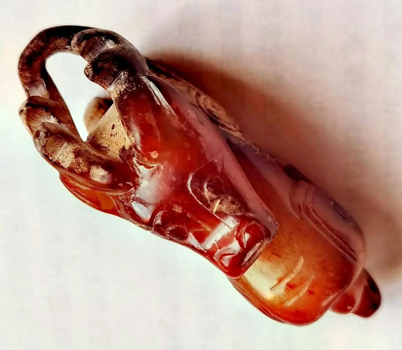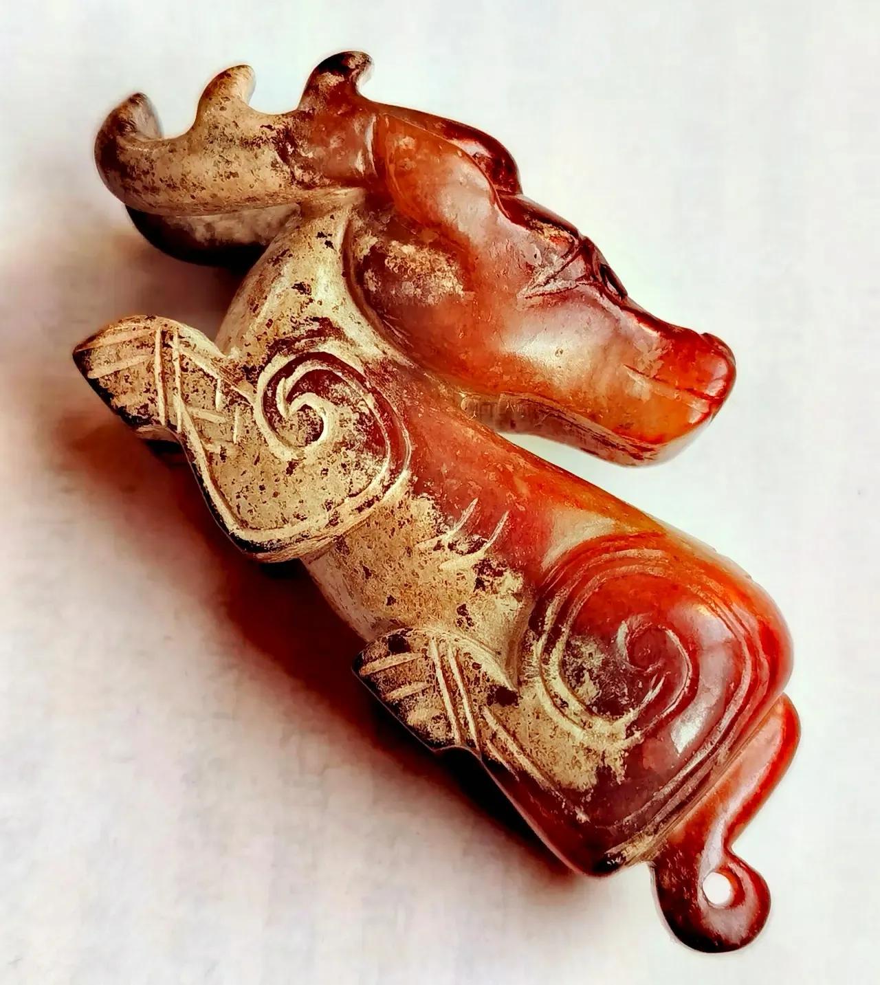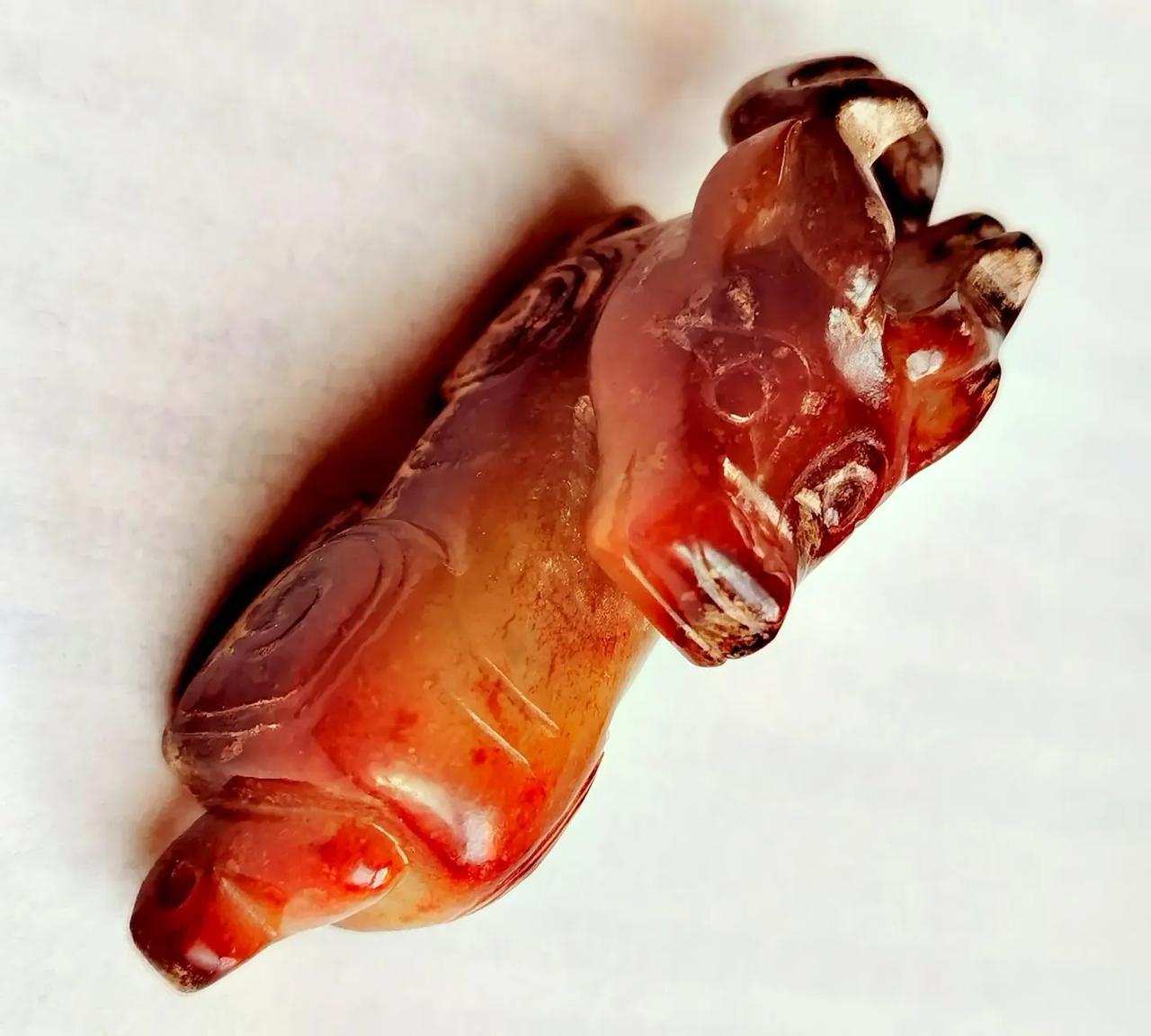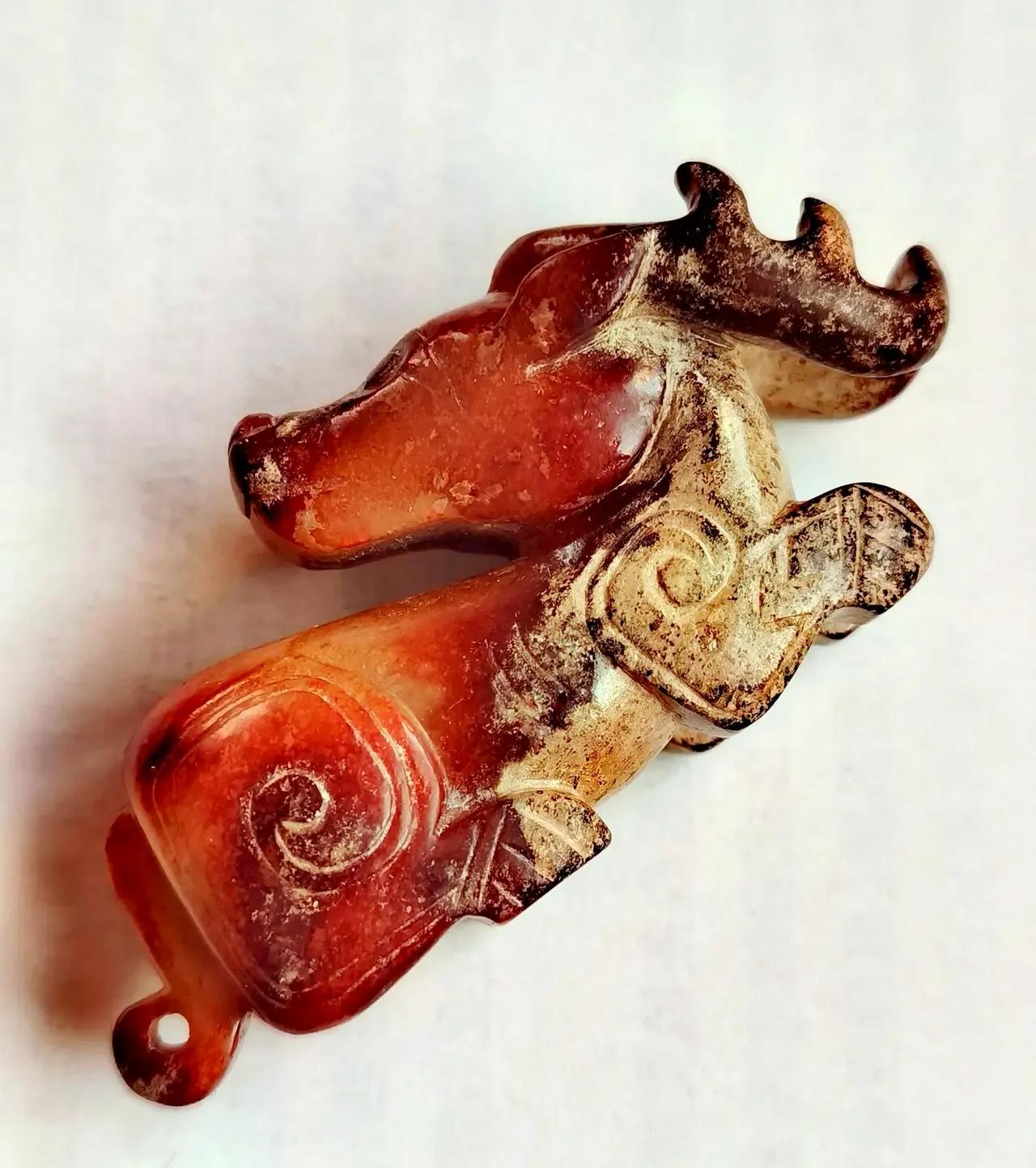 商晚期玉伏鹿。 伏鹿者, 福禄也。 古玉挂红, 价值连城。 从造型、工艺、纹饰、