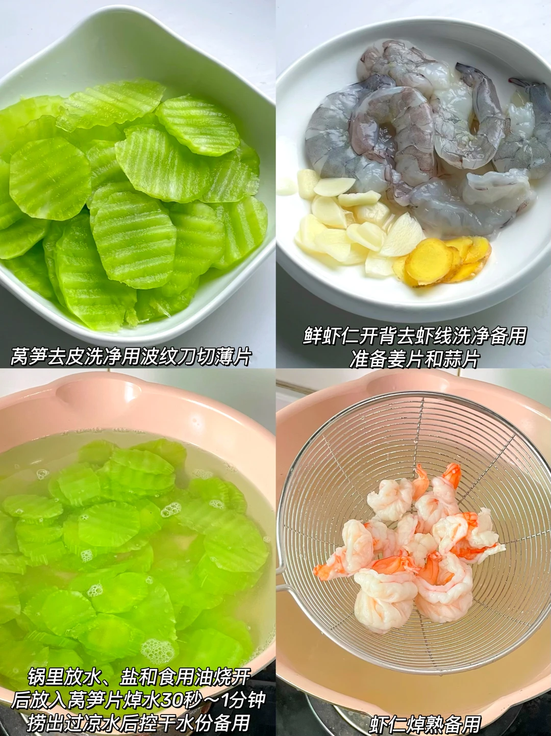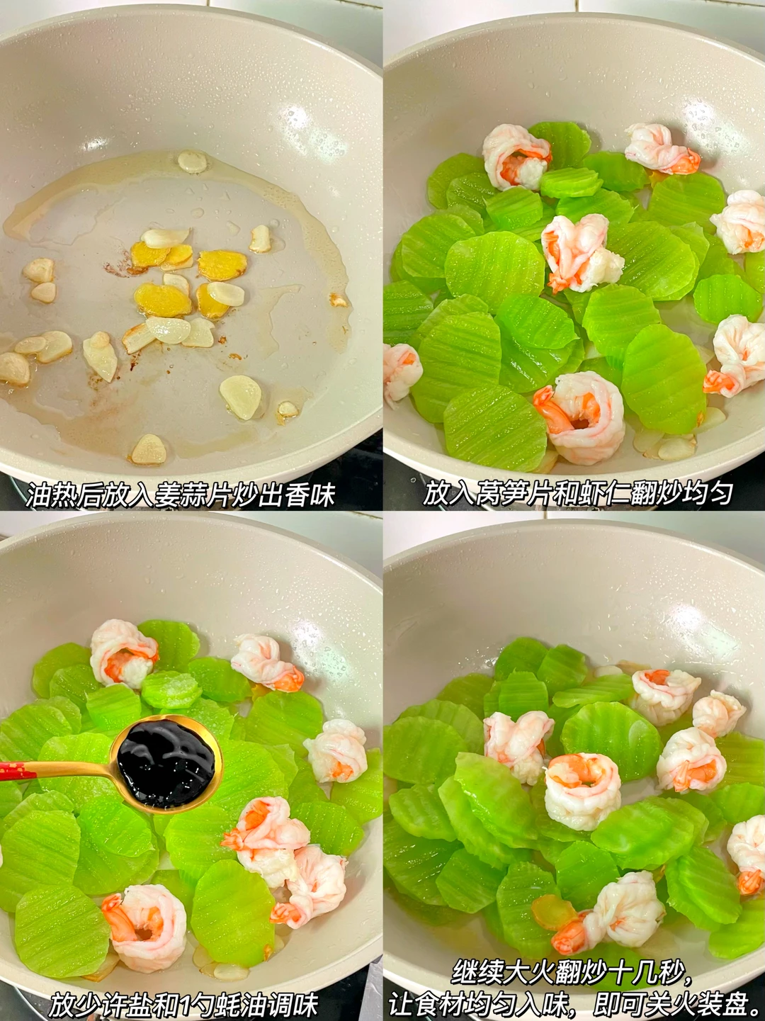 新鲜莴笋1根(削去外皮,洗净后用波纹刀切成均匀的薄片,这样切出来的莴笋片不仅好看,还能更好地吸附汤汁,口感也更脆鲜虾仁200克(开背后洗净备用),姜蒜片适量食用盐少许、蚝油1勺、食用油适量