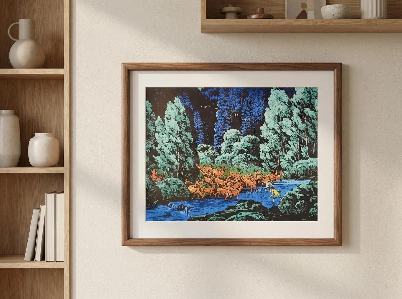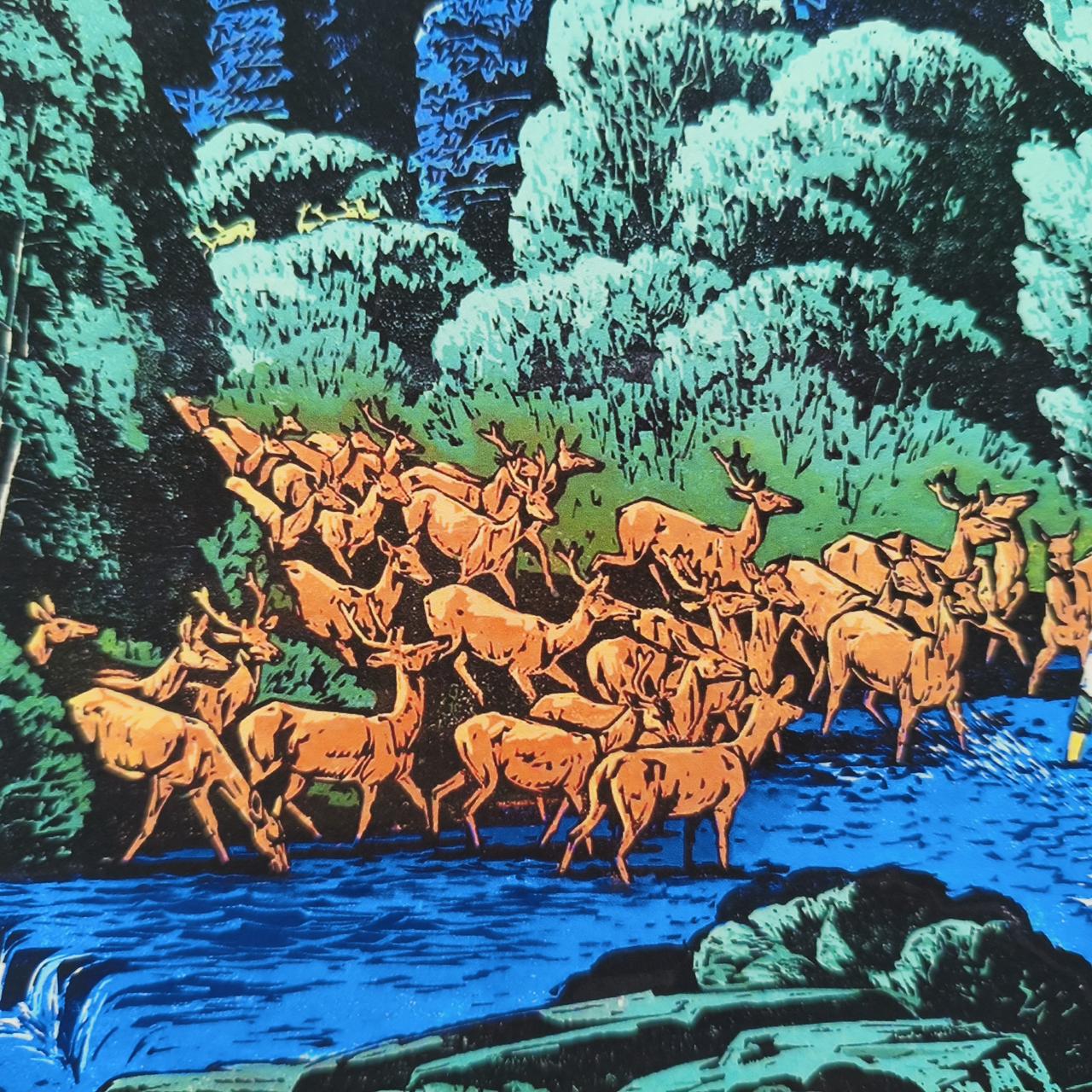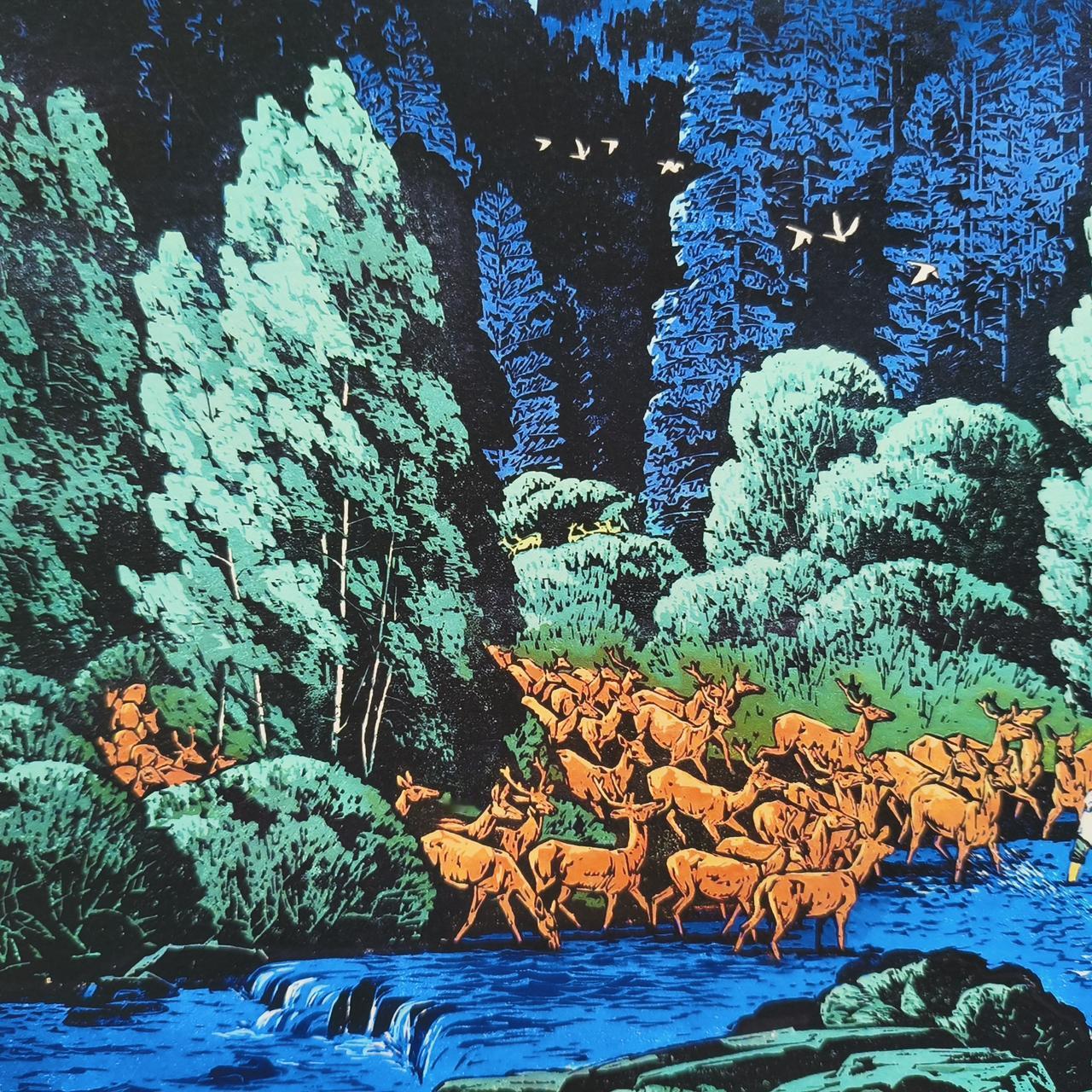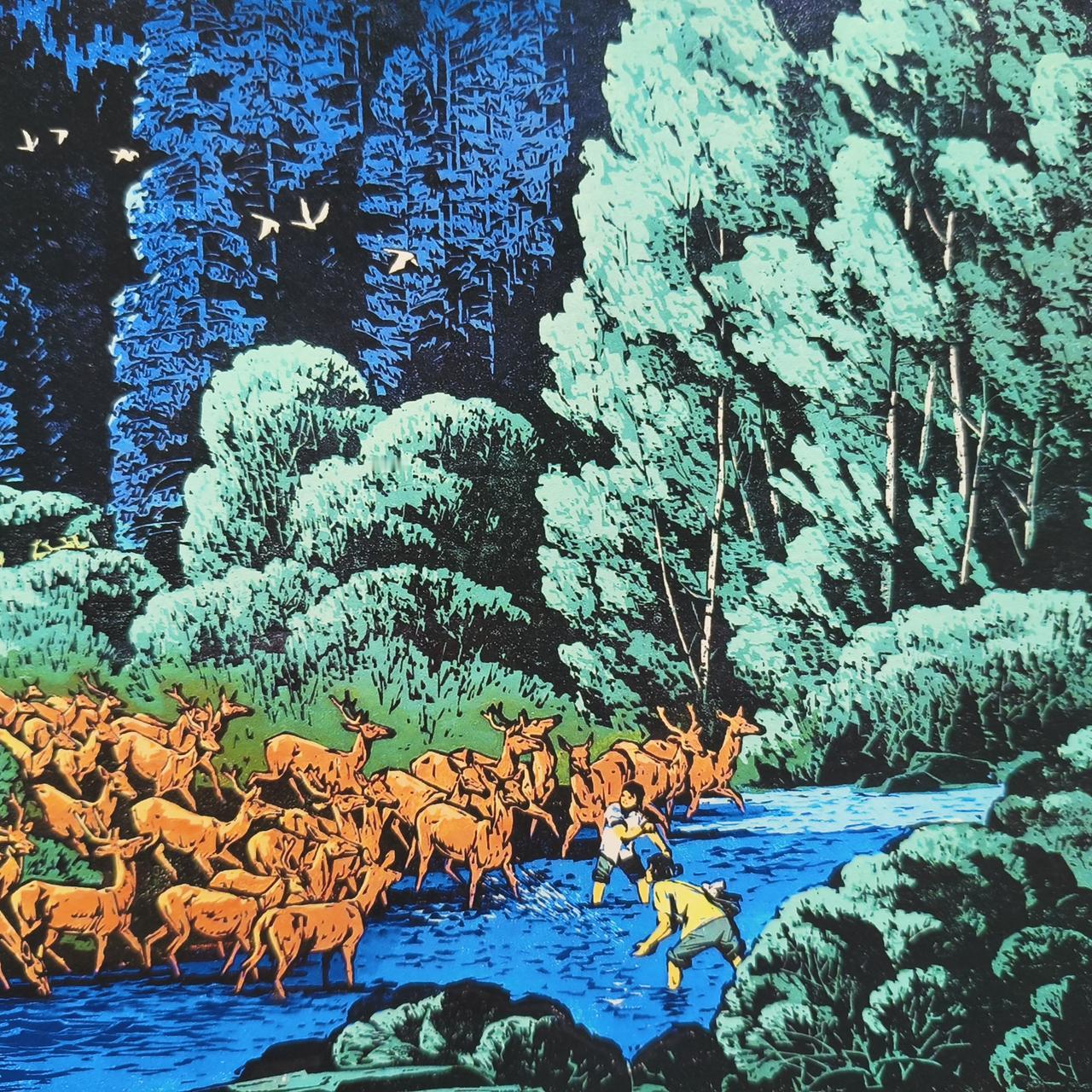 作为北大荒版画的代表性作品之一,这幅画在构图、色彩与刀味上都相当成熟。画面以北方林区为背景,冷色调的山林形成沉稳开阔的基底,鹿群与人物以暖色块提亮,动静相生,人与自然的关系处理得含蓄而诗意。木刻肌理清晰,线条硬朗,既有时代气息,又不失抒情性,是中国现代版画中很耐看的一件经典小品。