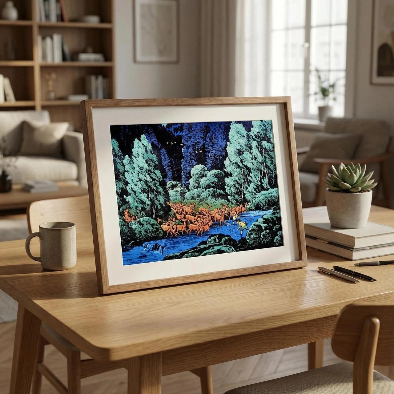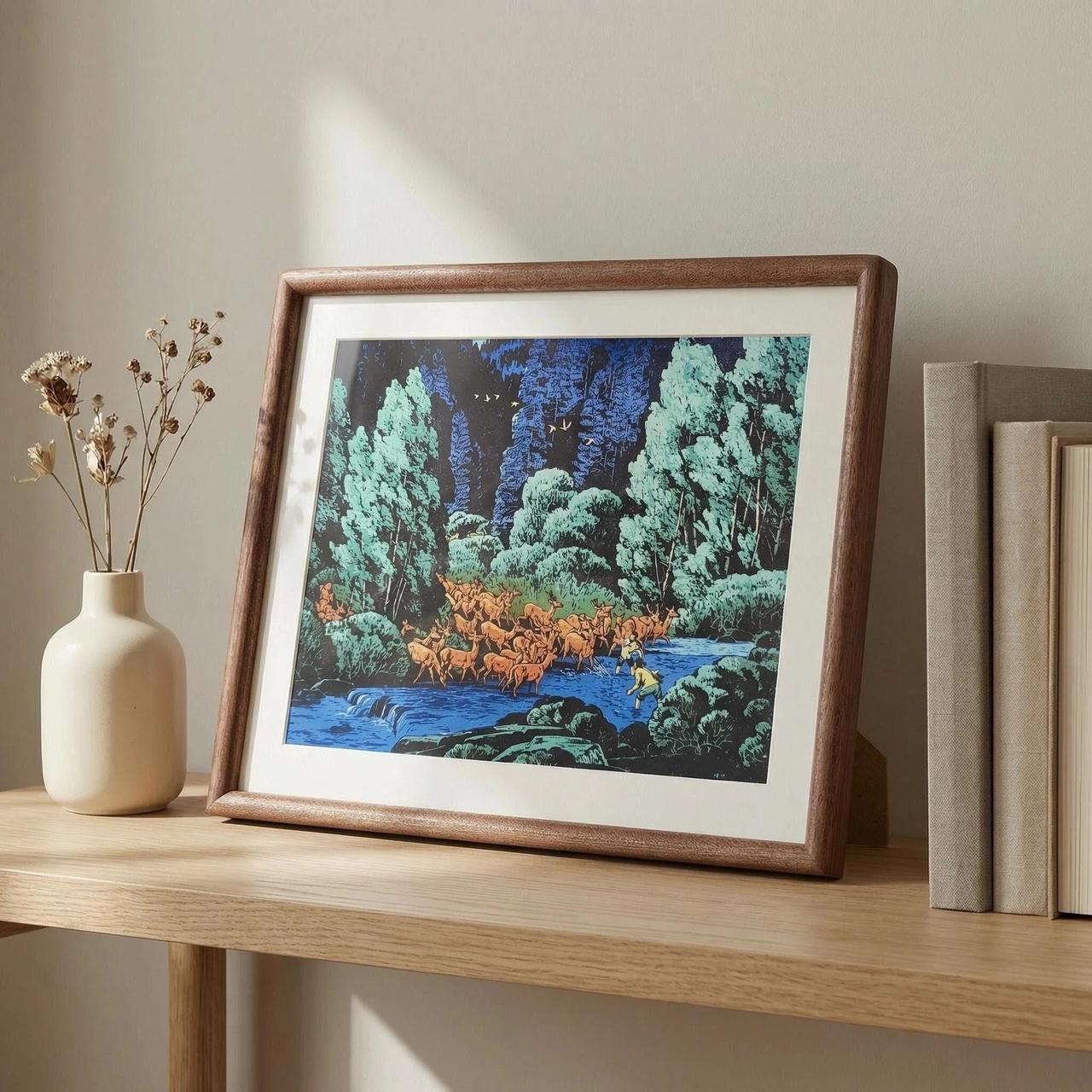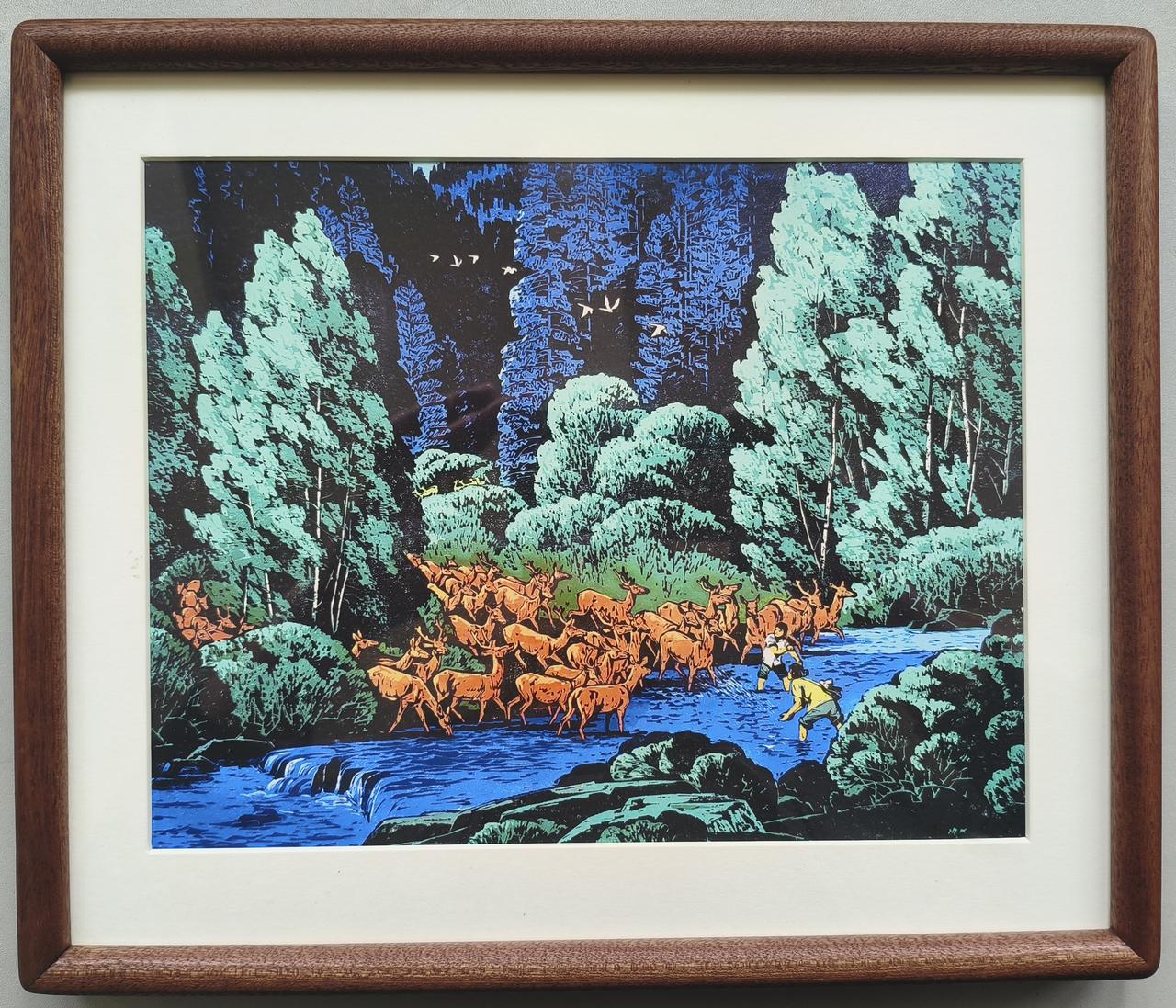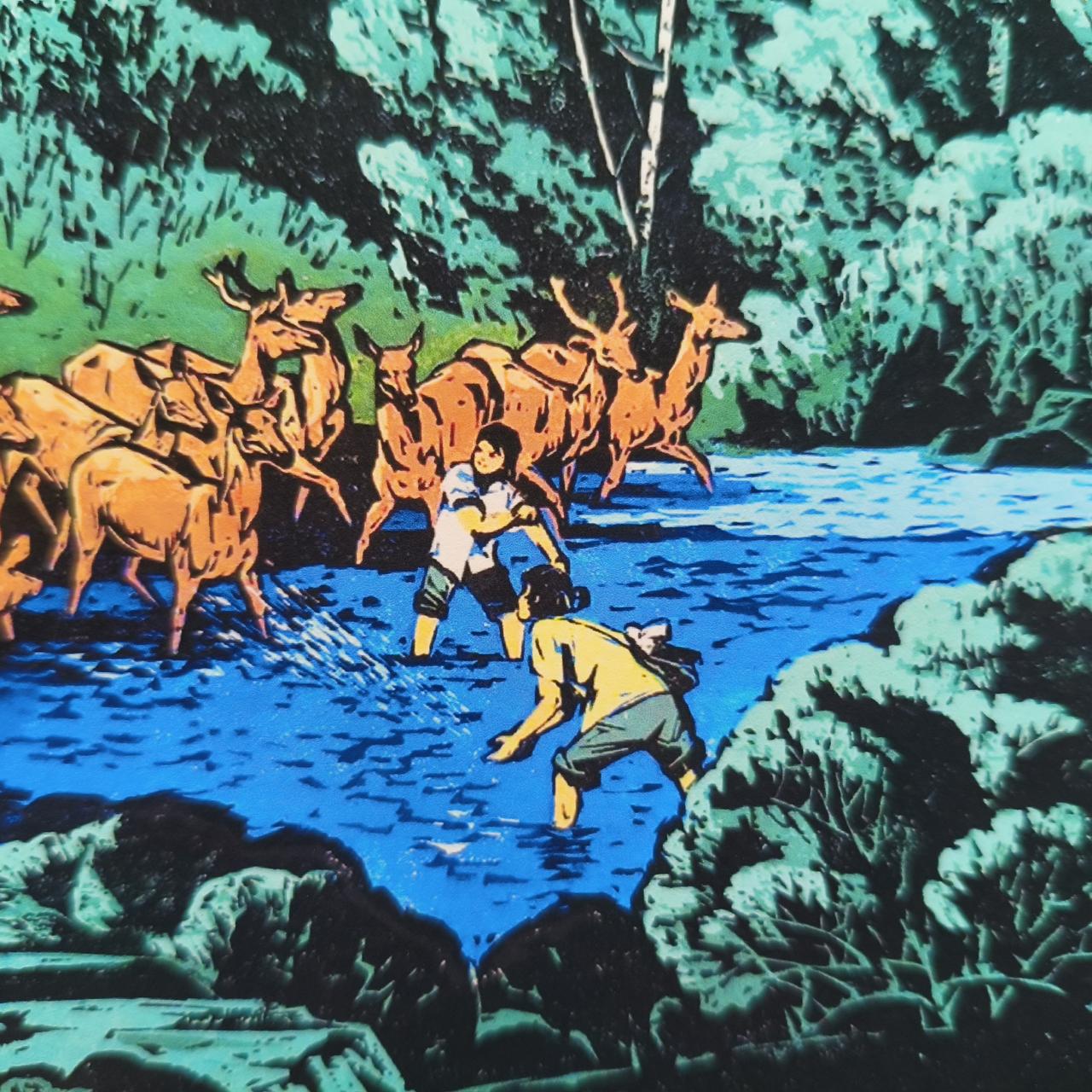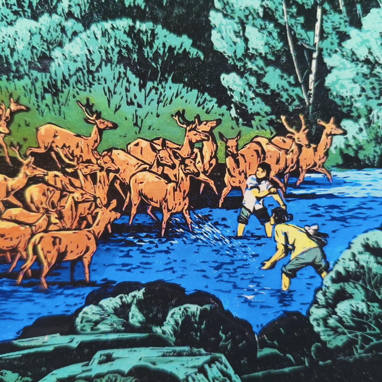 作为北大荒版画的代表性作品之一,这幅画在构图、色彩与刀味上都相当成熟。画面以北方林区为背景,冷色调的山林形成沉稳开阔的基底,鹿群与人物以暖色块提亮,动静相生,人与自然的关系处理得含蓄而诗意。木刻肌理清晰,线条硬朗,既有时代气息,又不失抒情性,是中国现代版画中很耐看的一件经典小品。