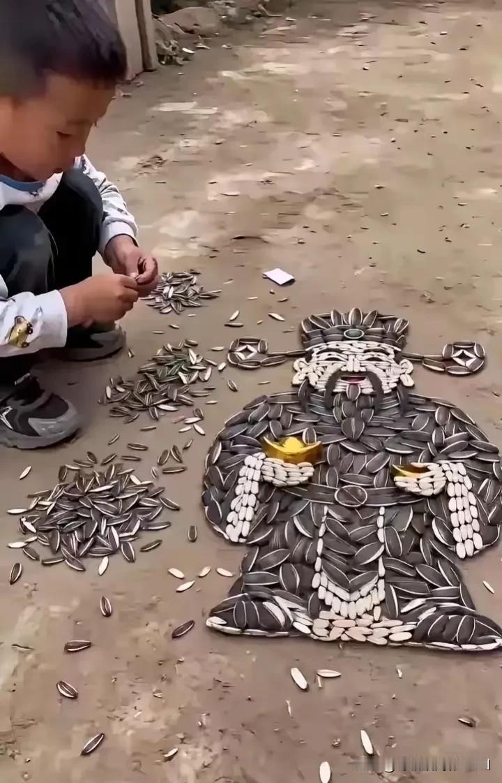 傍晚在门口和邻居聊天,邻居家的小男孩拿着两只假的金元宝在玩耍。我拿了一袋瓜子给他吃,并开玩笑的对他说:金元宝是财神爷才能拿着的哦。我和邻居只顾聊天,没想到男孩拿到瓜子没有吃,真的用瓜子在地上拼了一个财神爷。邻居嫌男孩糟蹋了一袋瓜子,气的要揍他,被我拦下来了。