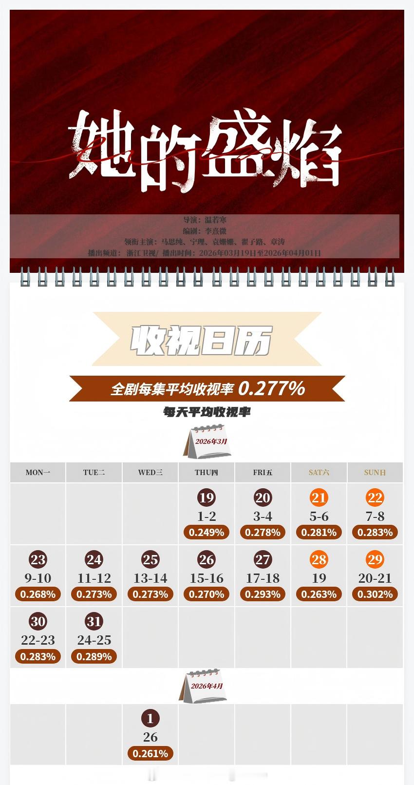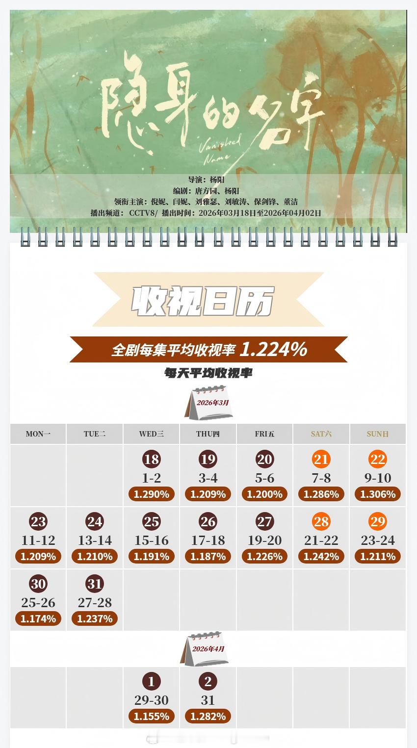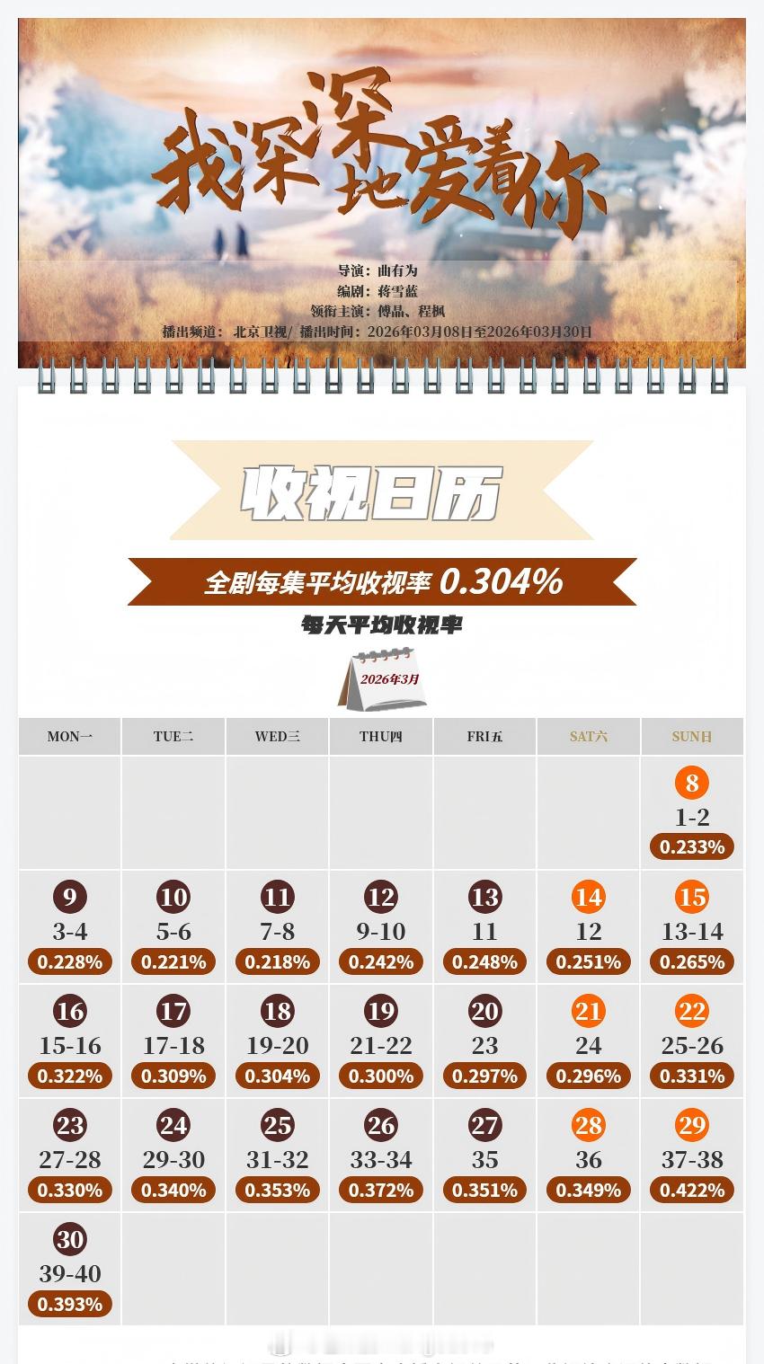 中国视听大数据CVB收视日历白宇 / 章若楠 / 林允 / 王彦霖 冬去春来 傅晶 / 程枫 我深深地爱着你 平均收视率1.864%,最高单日2.280%(央八完结剧年季) 倪妮 / 闫妮 / 刘雅瑟 / 刘敏涛 / 保剑锋 / 董洁 隐身的名字 平均收视率1.224%,最高单日1.306%傅晶 / 程枫 我深深地爱着你 平均收视率0.304%,最高单日0.422%(北京卫视完结剧年亚) 马思纯 / 宁理 / 袁姗姗 / 翟子路 / 章涛 她的盛焰 平均收视率0.277%,最高单日0.302%(浙江卫视完结剧年季)