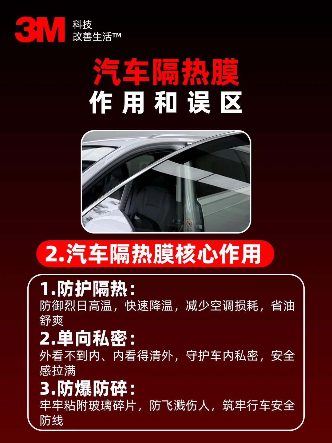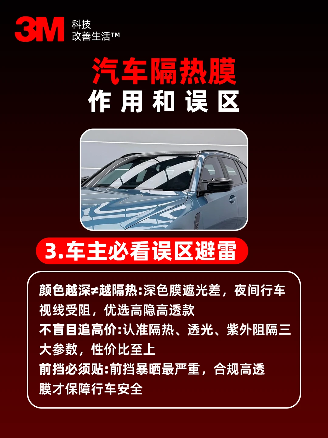 🚫 误区三:前挡随便贴贴。前挡是阳光射入的重灾区,请务必选择符合标准的透光膜材,这样才能在化解热量的同时,确保驾驶视野的通透。