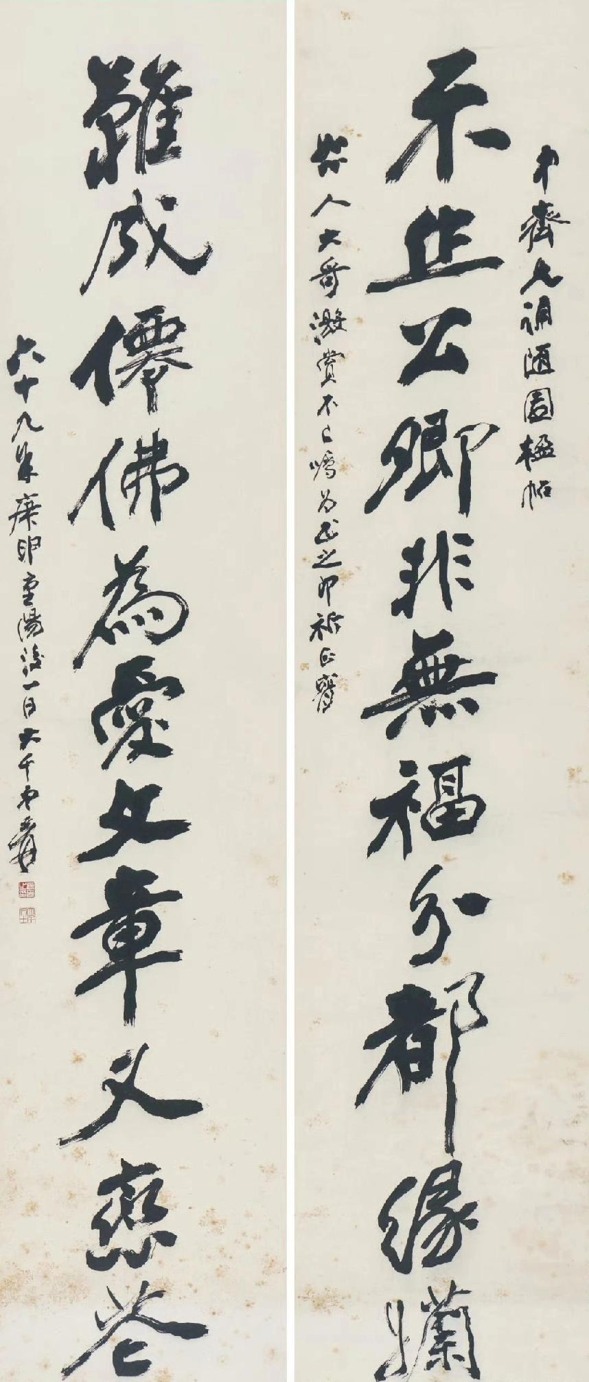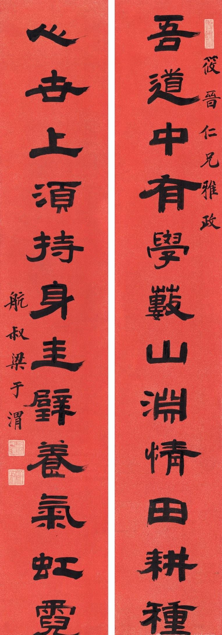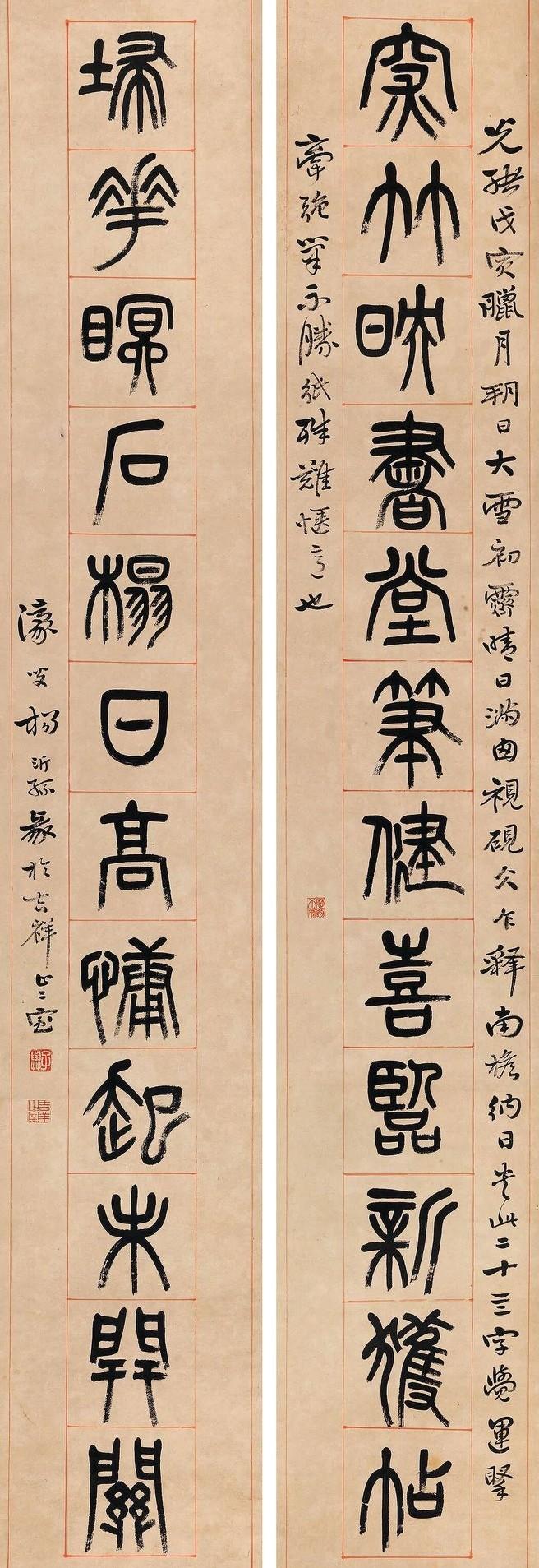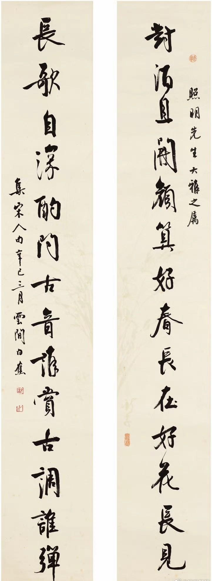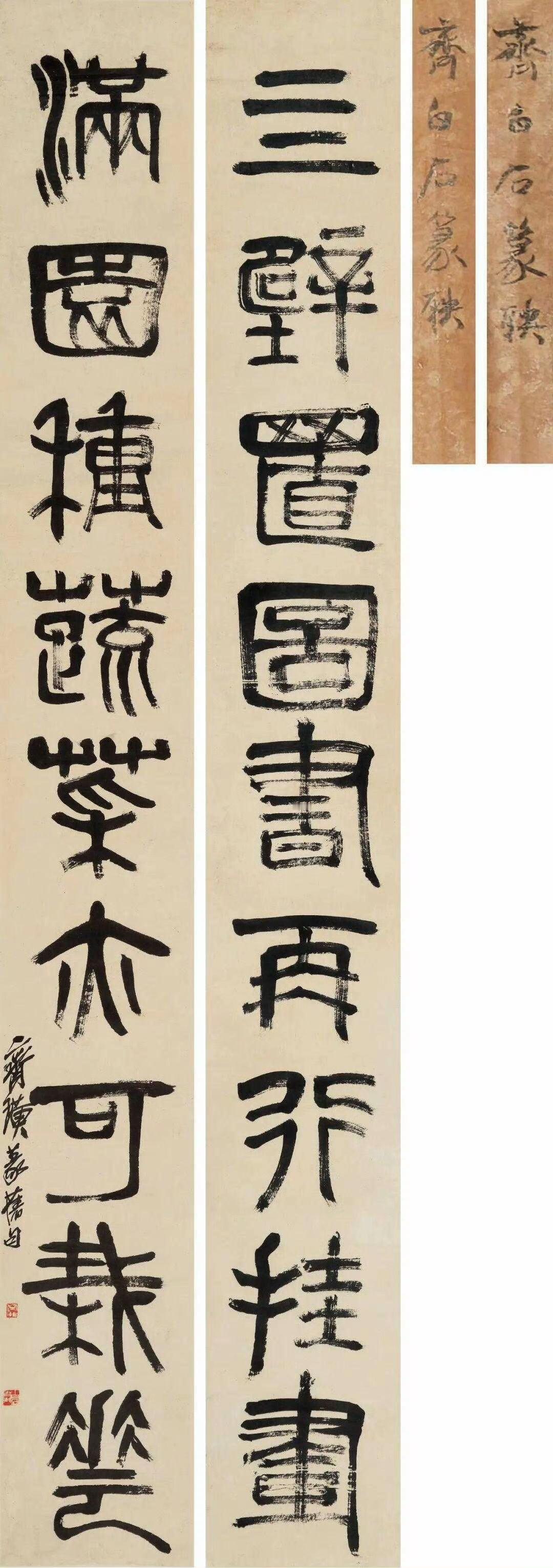 吴昌硕 篆书九言联 “恨无十年暇熟读奇书,幸有两眼明广交益友。” 白蕉 行书 十