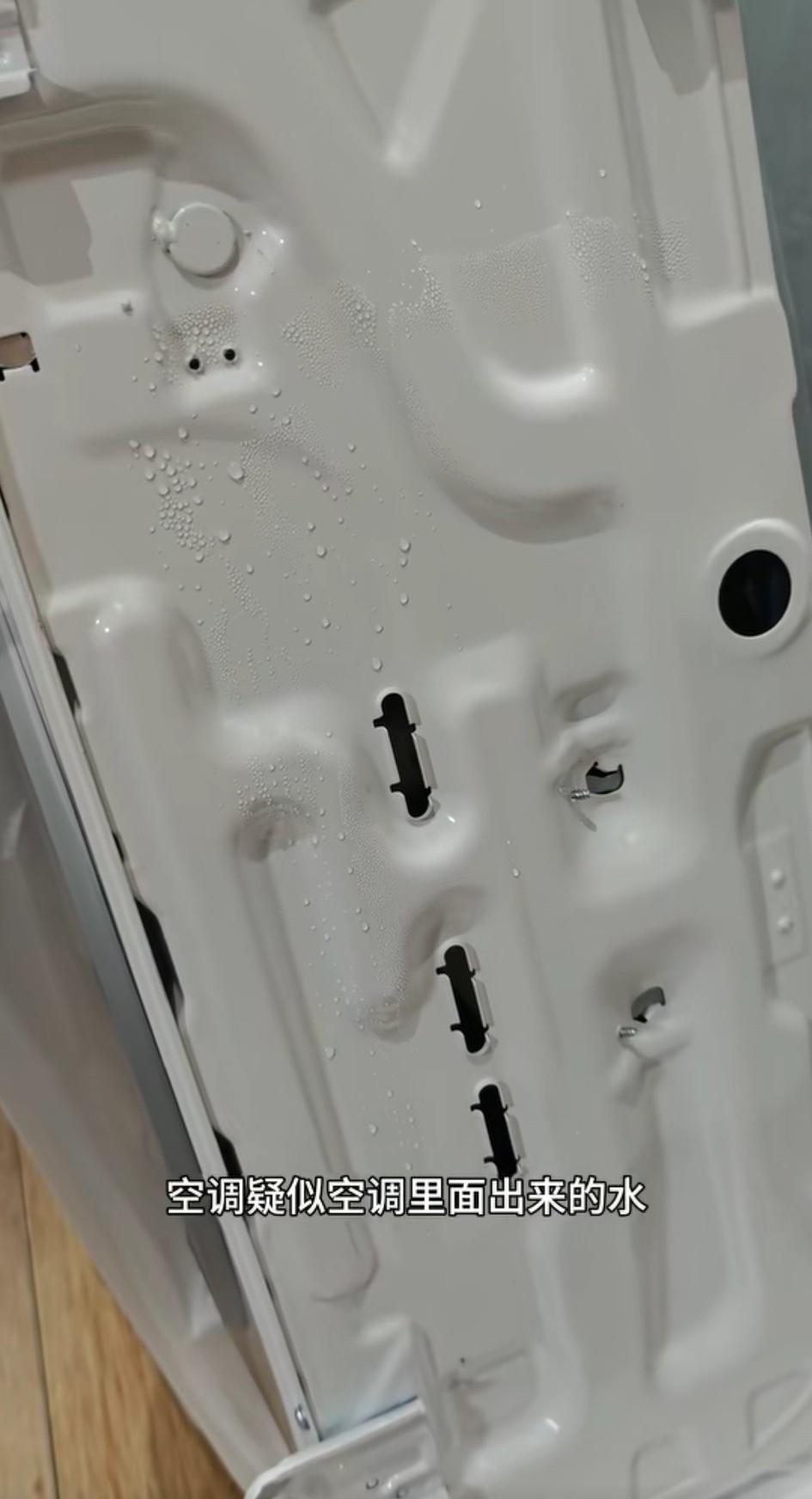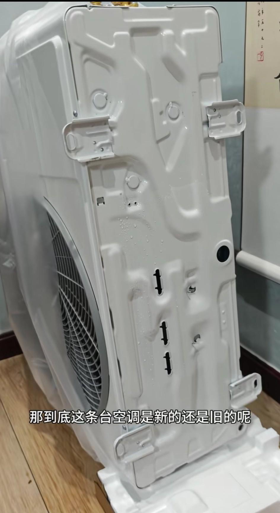 重庆,男子发视频称:买了一台某网红品牌的空调,发过来就看到外包装的纸壳是湿的,就录了一个开箱视频,打开包装一看,发现有疑似空调里面的水流出来,发现底座有疑似安装过的痕迹。