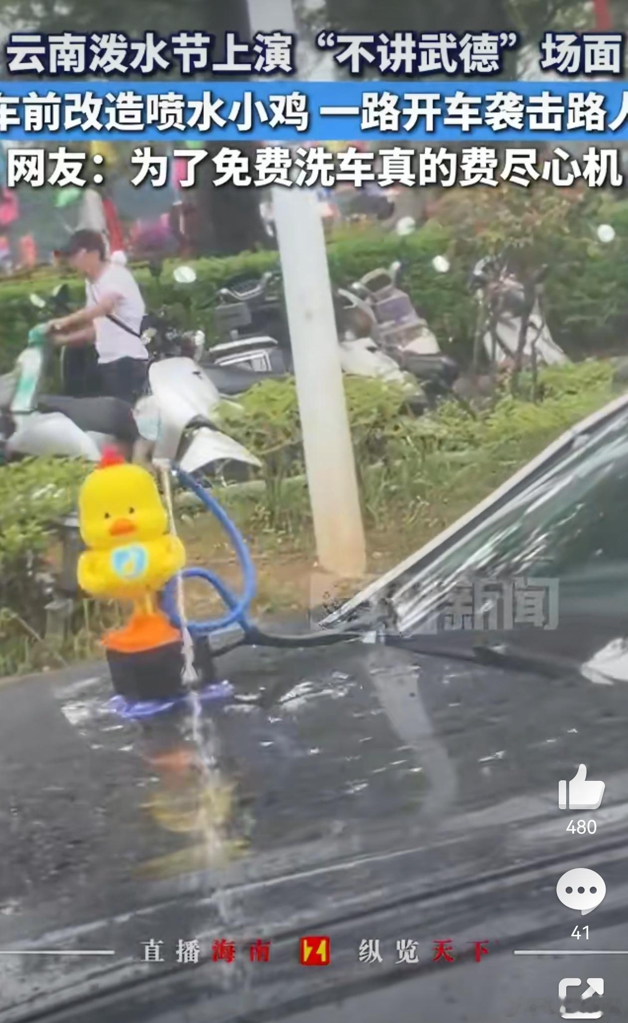 云南泼水节车前喷水小鸡袭击路人对于这种不讲武德的车主,我很想说句:你的喷水小鸡?