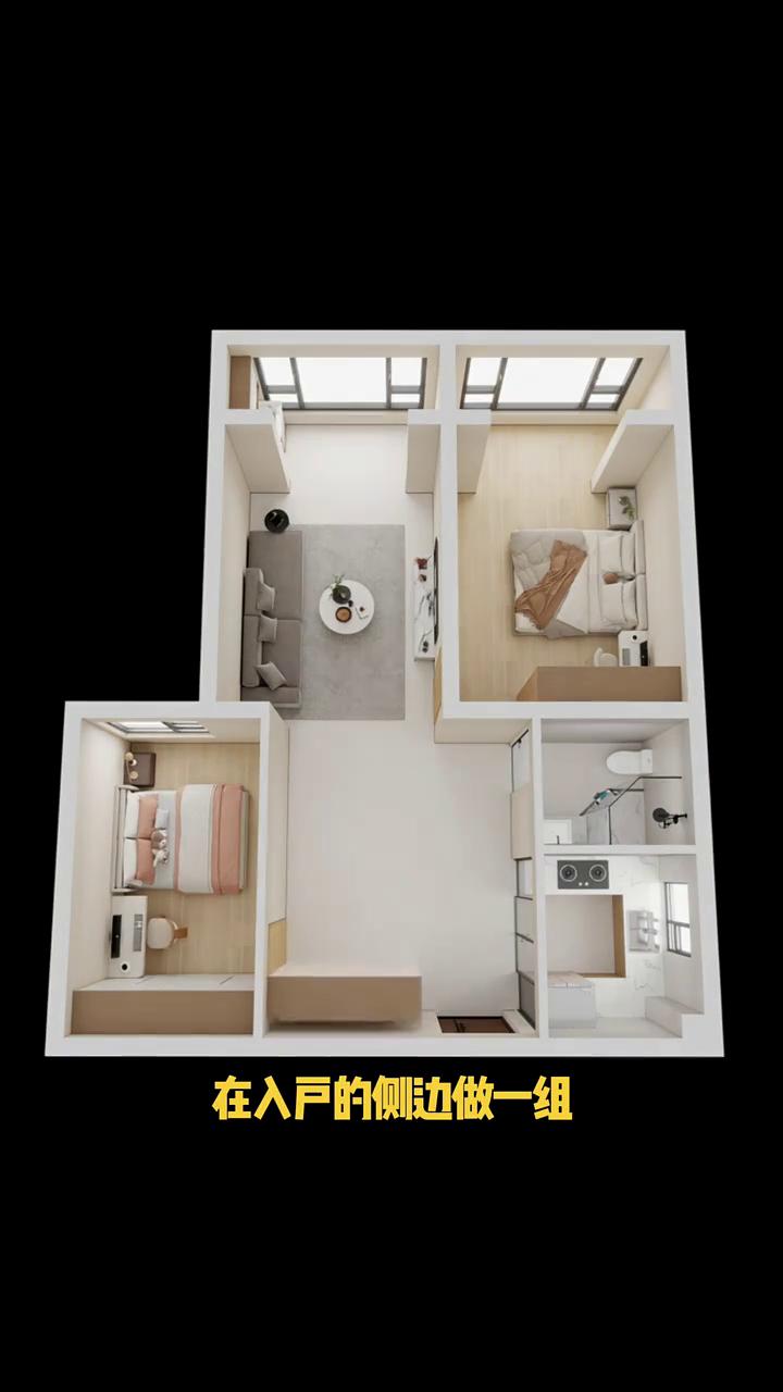 这个户型一进门就看到两个卧室的门,私密性不好。整个客餐厅的布置也比较零碎,电视都放不了,而且只有一个小窗户,采光也不好。那么不如这样做: