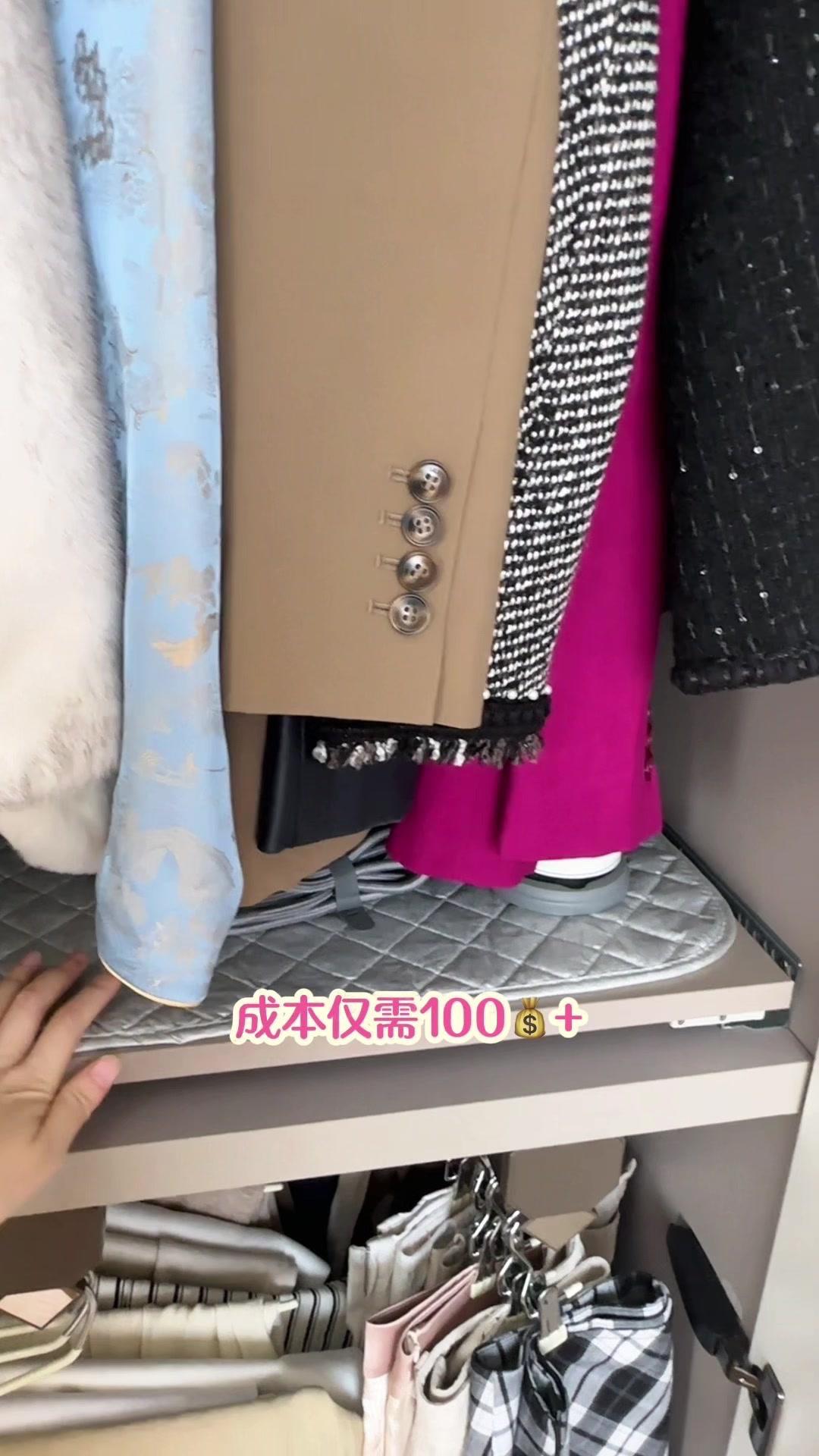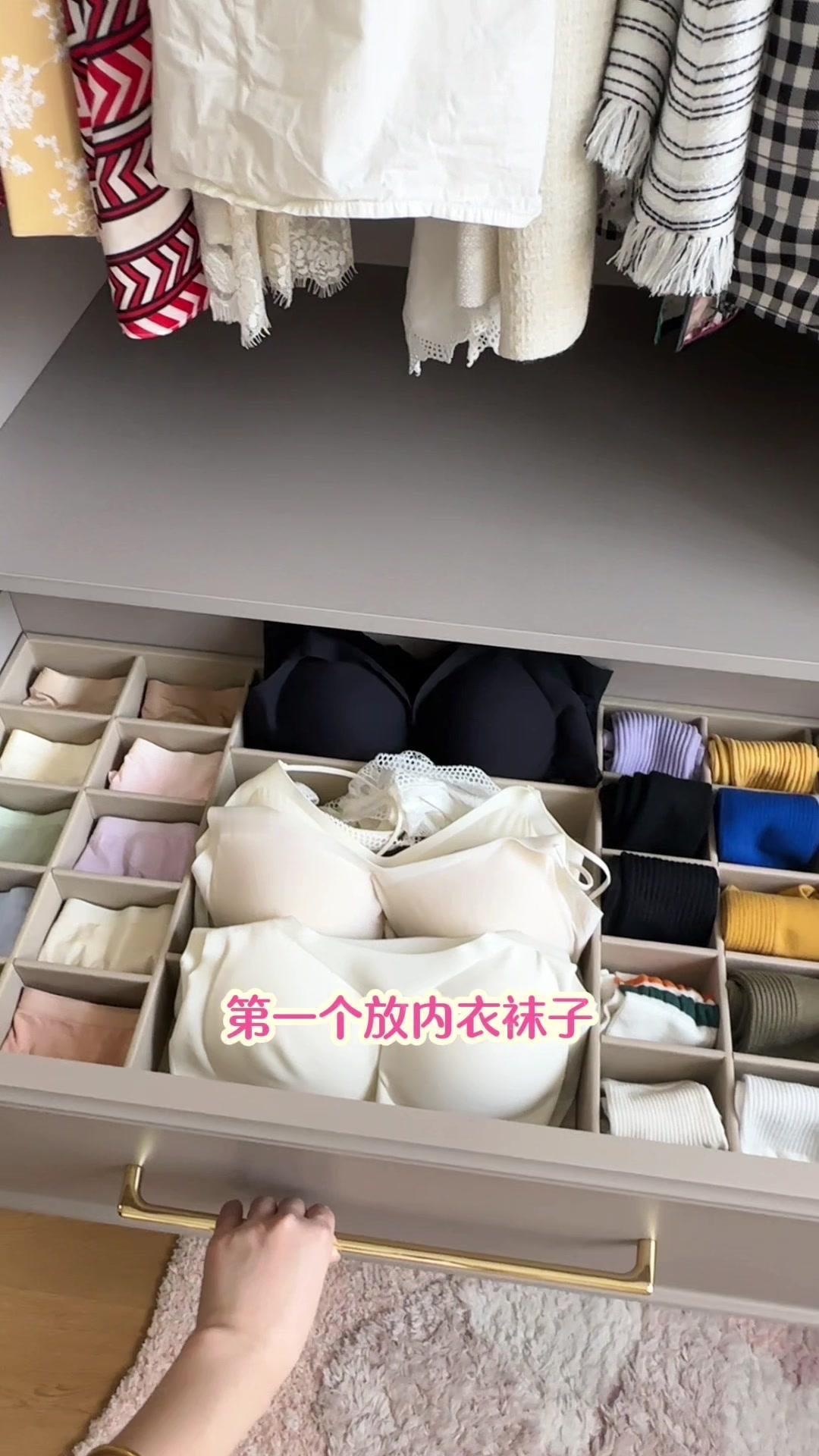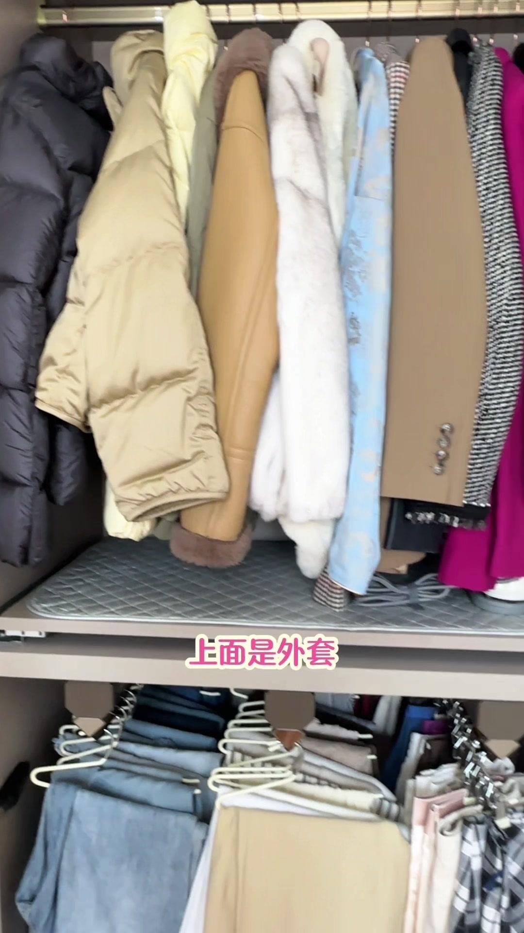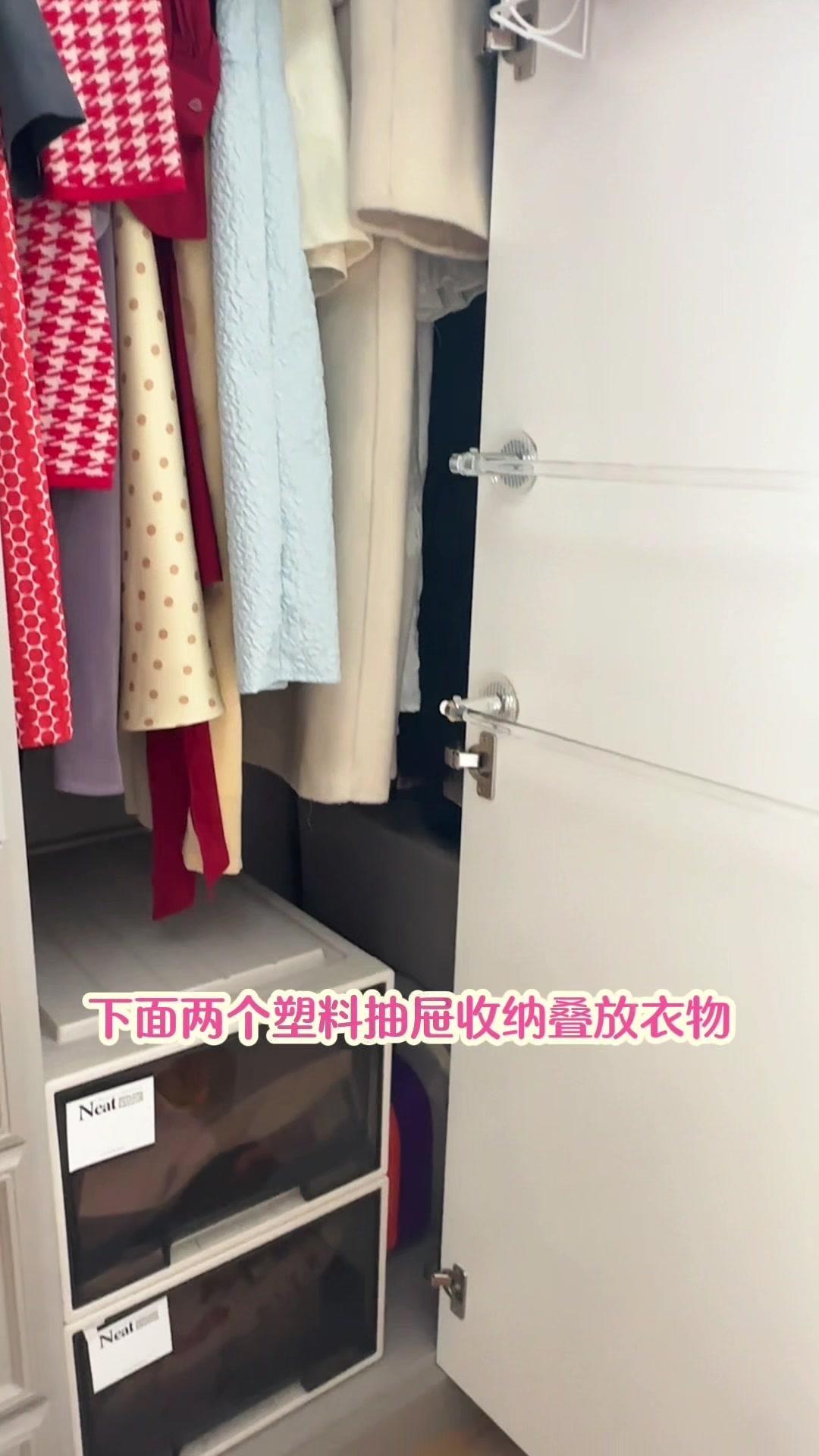 7️⃣衣柜挂长款大衣,下面第一个抽屉放健身上衣,门上金属架挂围巾,搜冰柜架又便宜又实用。