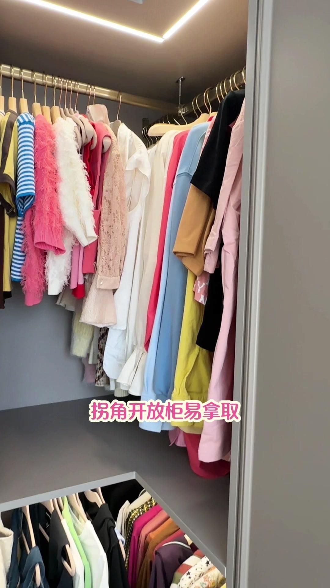 8️⃣拐角开放柜易拿取,上面是外套,这是后来自制的推拉熨衣板,面积大熨衣叠衣,又实用又省空间,成本仅需100。