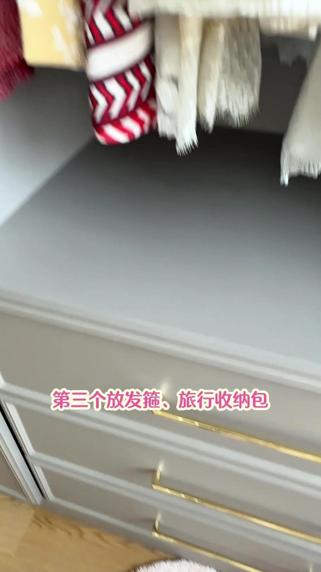 6️⃣这里是里面相通的衣柜,没有隔板全是长款衣服,下面两个塑料抽屉收纳叠放衣物,金属架放各种漂亮的发圈;开放格衣柜放连衣裙,三个抽屉定制皮革收纳盒,第一个放内衣袜子,第三个放小包、包带、挂饰,第三个放发箍、旅行收纳包。