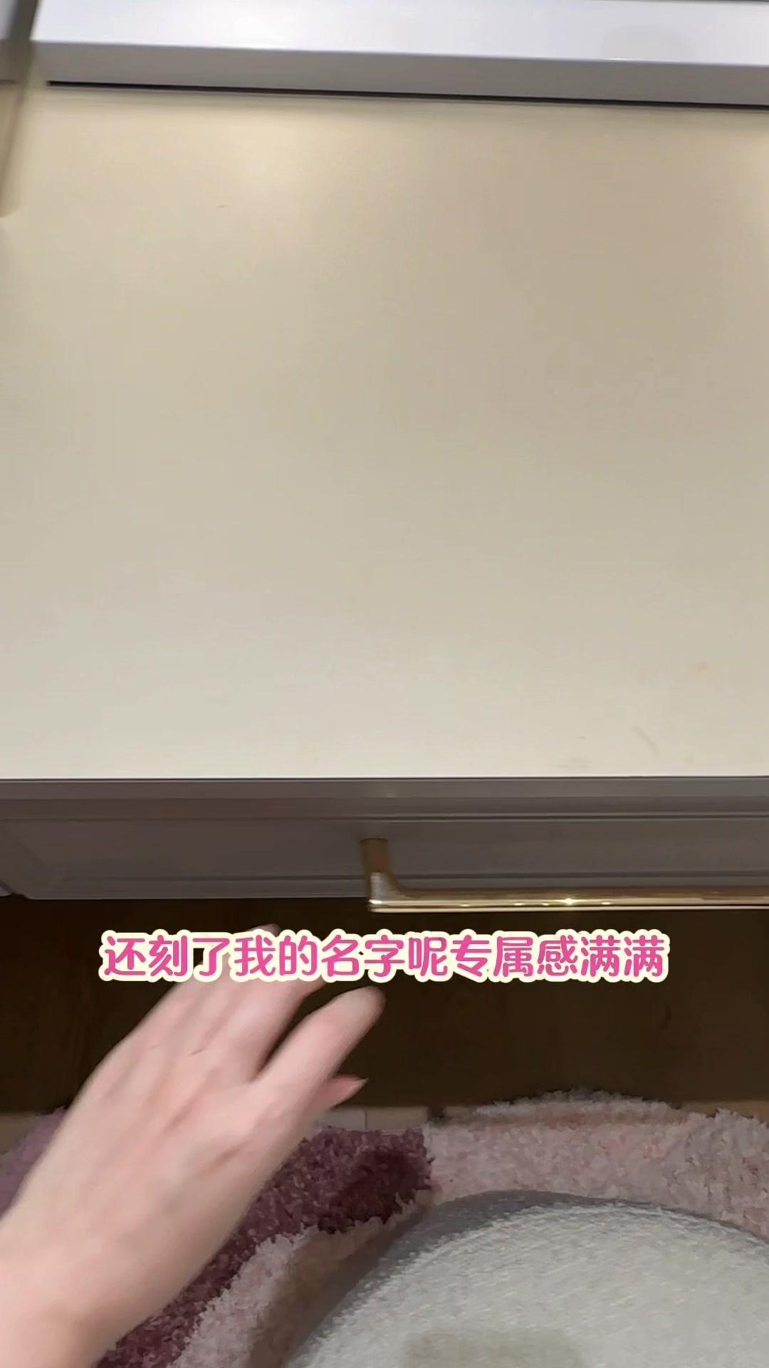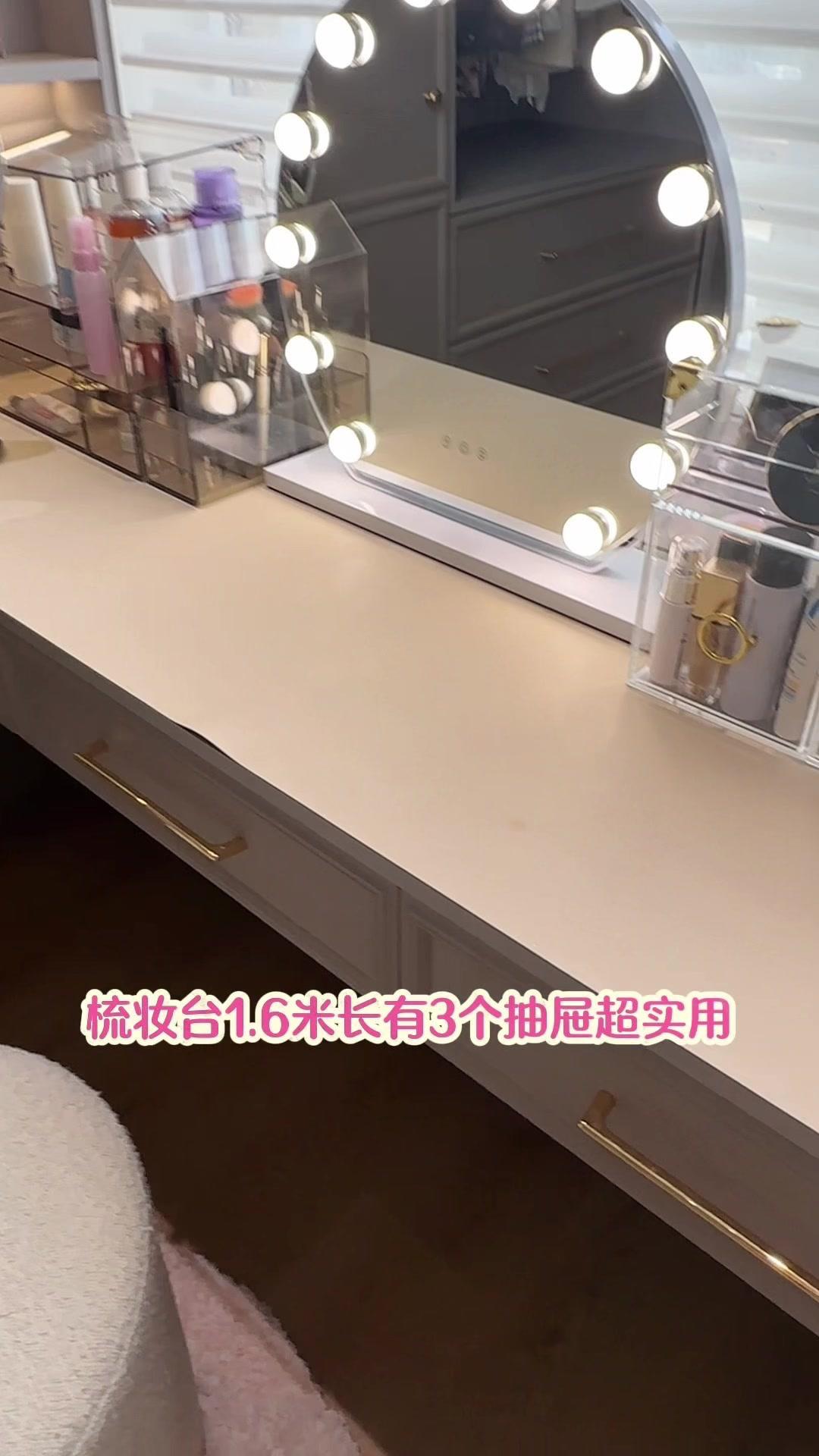 3️⃣梳妆台1.6米长,有3个抽屉超实用,定制亚克力收纳盒放化妆品,装的多好取放,海好清洁;定制植绒收纳盒放首饰格局合理,还刻了名字,专属感满满。