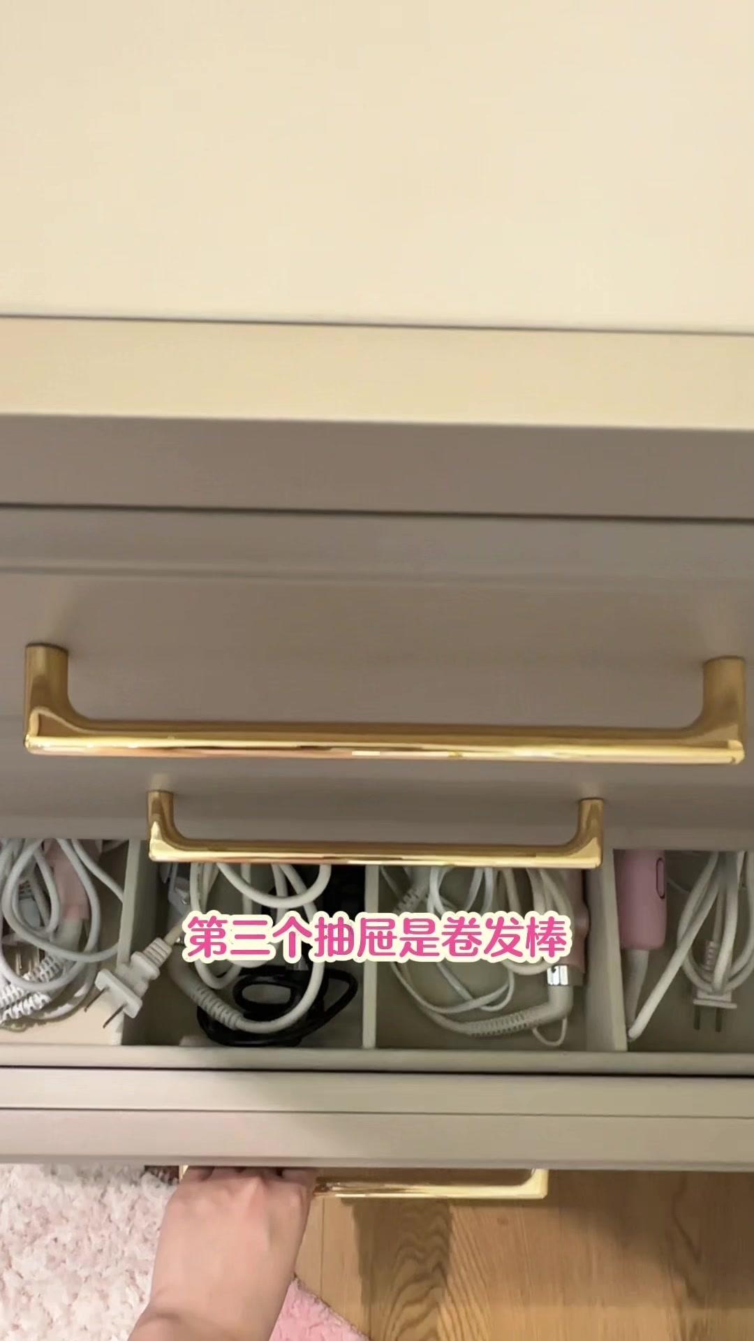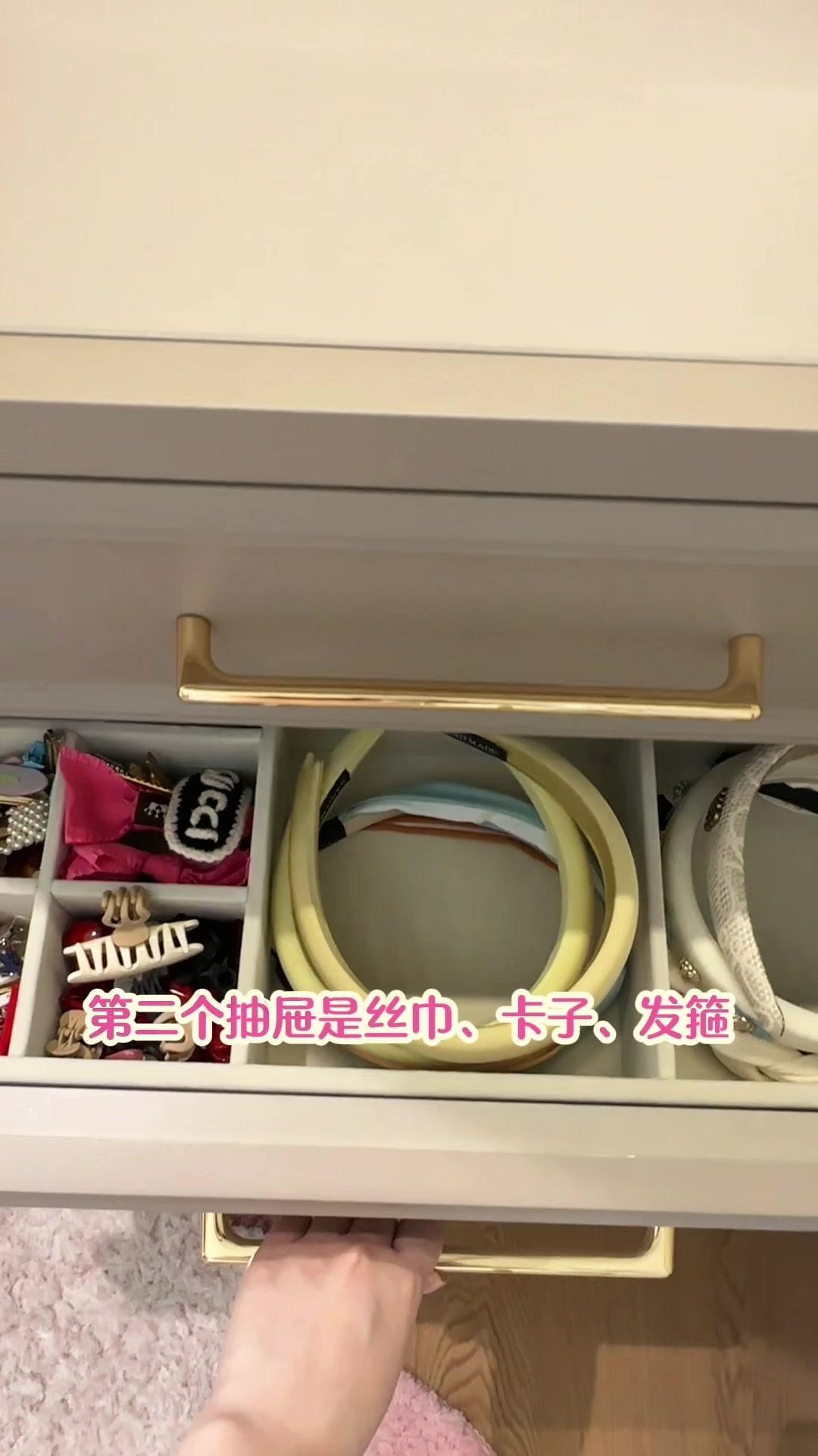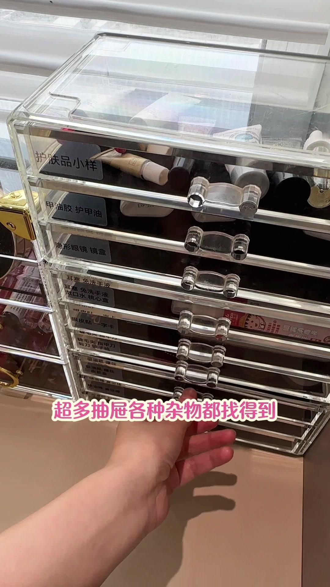 5️⃣上层粉饼、眼影、气垫,粉底液、定妆喷雾,唇釉,棉签、粉扑,超多抽屉各种杂物都找得到;开放收纳格可以放香水等。