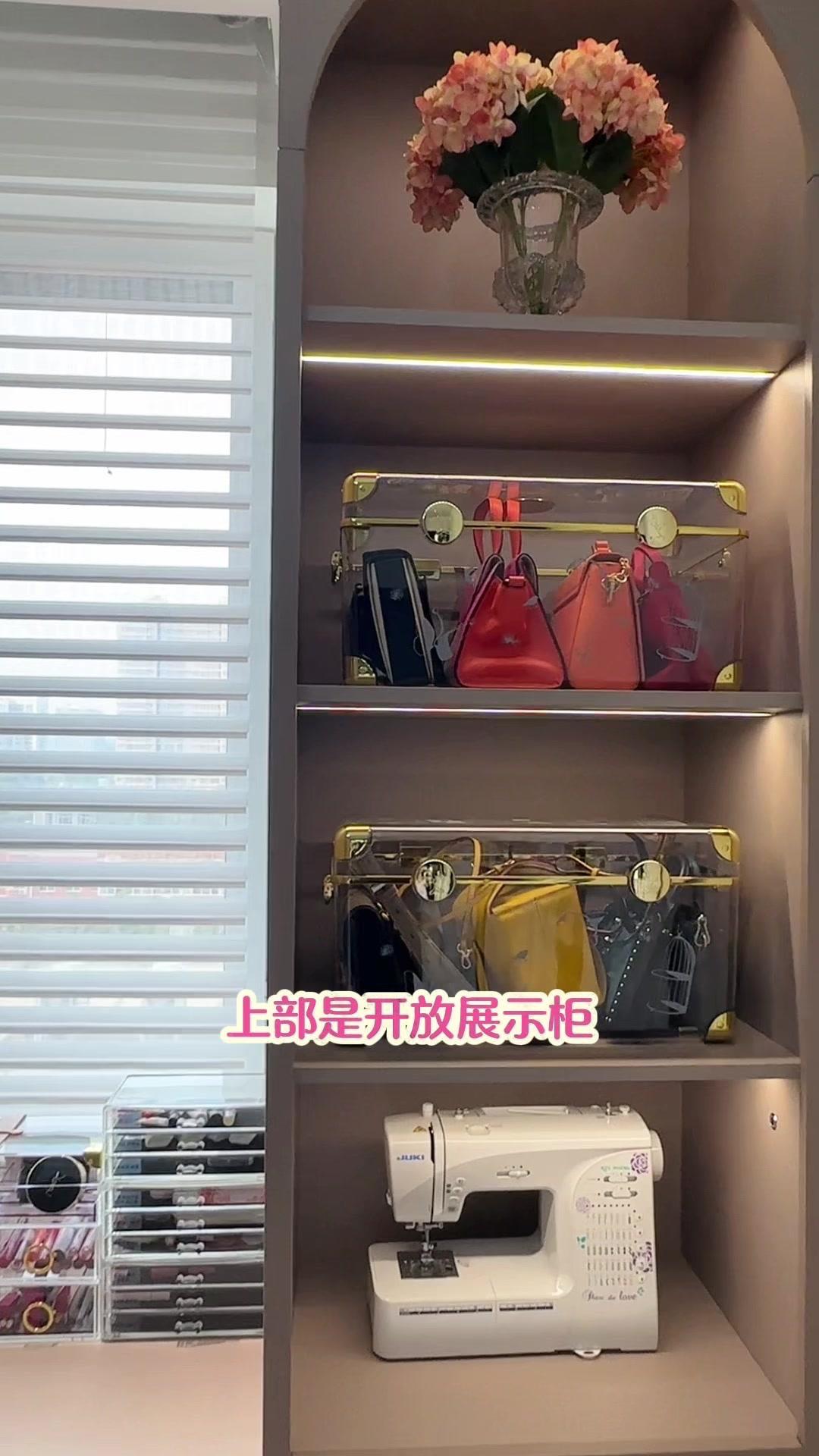 2️⃣窗户右边的柜子,上部是开放展示柜,包包用透明收纳箱装起来,又防尘又漂亮;下部是严丝合缝定制的植绒收纳盒,第一个抽屉放发抓和蝴蝶结,第二个抽屉是丝巾、卡子、发箍,第三个抽屉是卷发棒,第四个抽屉是琐碎小物。