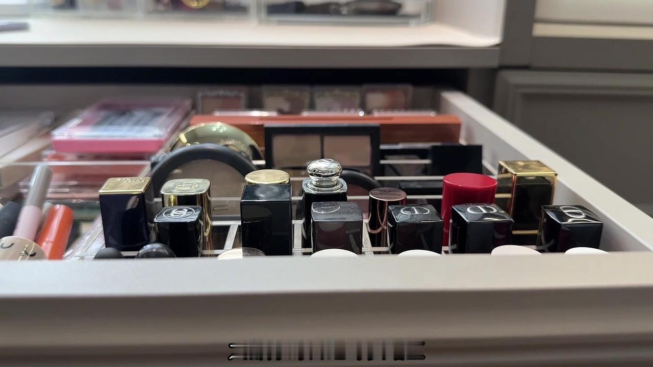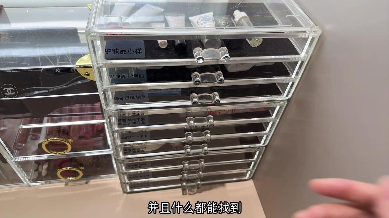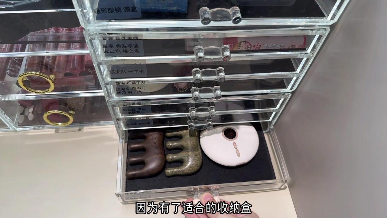 抽屉面板高15厘米,长度略有差别,几乎均分,内高9.5厘米,这个高度,大部分的口红可以站立,大部分的眼影、腮红斜着也可以插进去。
