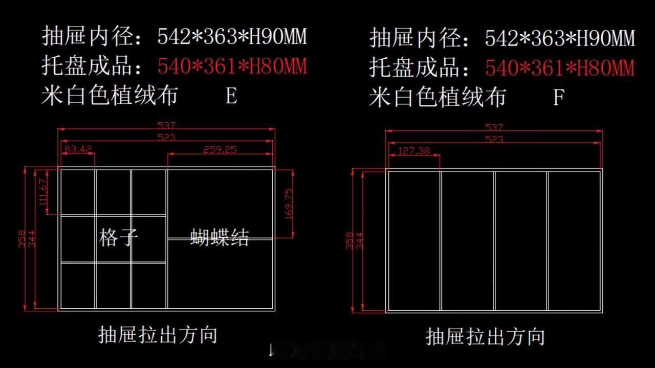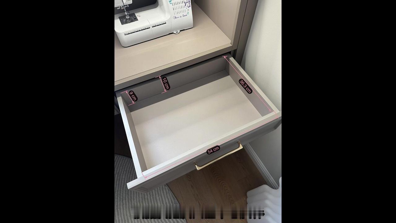 7️⃣梳妆台右边的柜子至关重要,女生各种头饰和零碎的东西很多,堆起来就会找不到,甚至再也不会用,这4个抽屉也定制了植绒收纳盒,根据发箍、发夹、丝巾、卷发棒等尺寸做的设计,整整齐齐,一目了然,收纳盒的尺寸是精心测量画出来的设计图,给大家可以直接抄作业。