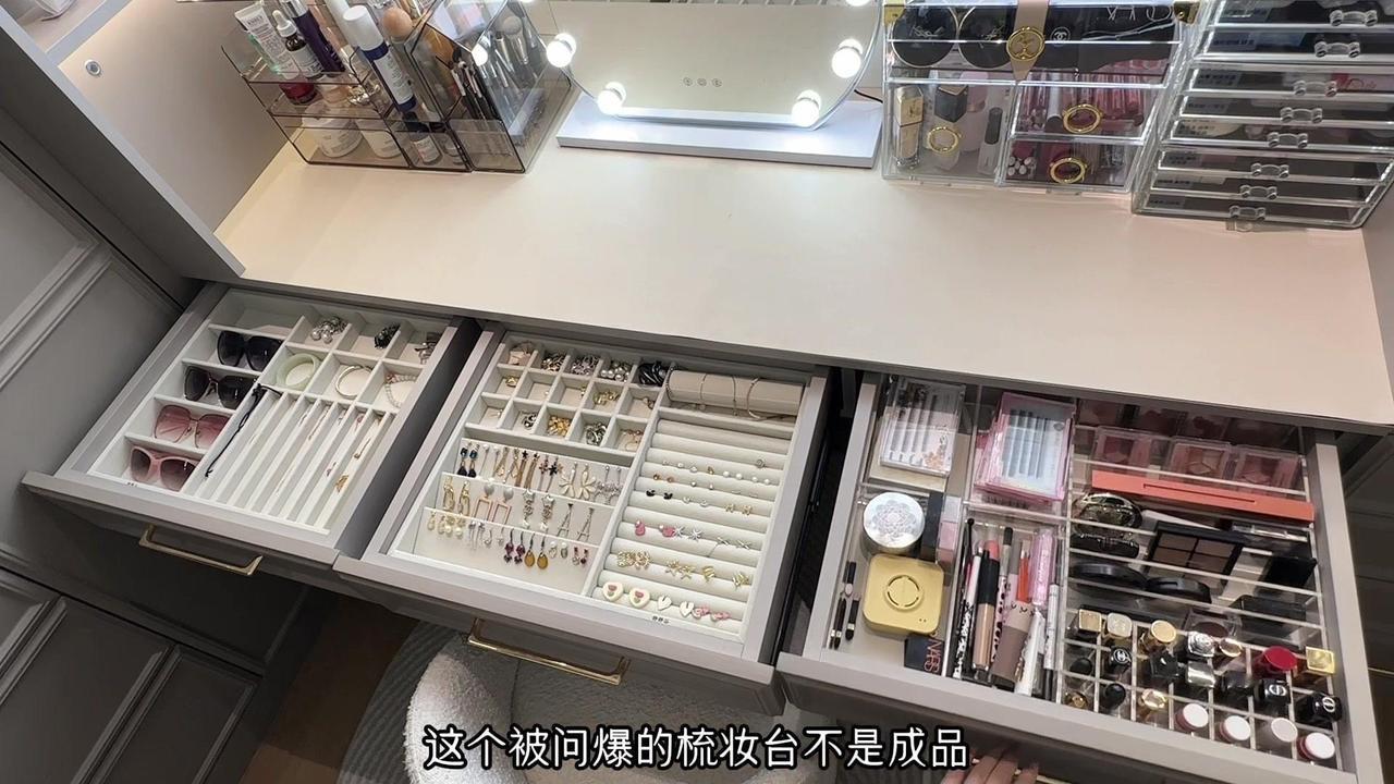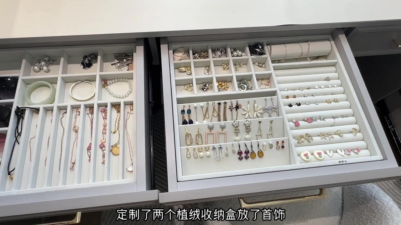4️⃣梳妆台3个抽屉非常实用,定制了2个植绒收纳盒放首饰,1个亚克力收纳盒放化妆品,每次化妆挑选的过程都觉得人生值得。