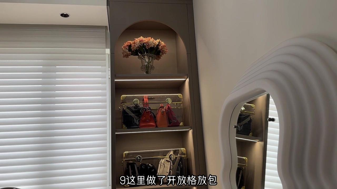 9️⃣这里做开放格放包,为了防尘放了收纳箱,非常的好看,上面做了拱形设计,淡淡的法式风很漂亮。