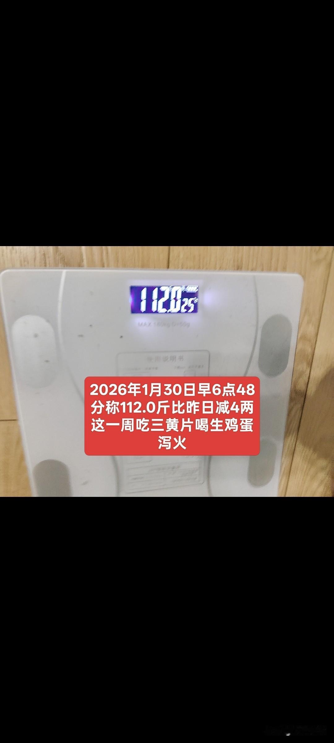 今天早晨6点28分称体重,再次回到113.1斤,咬咬牙,再坚持一天,一定要达到自己的最佳战果。