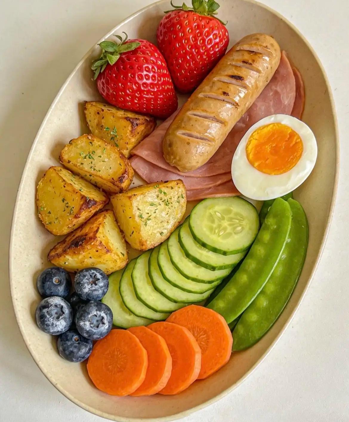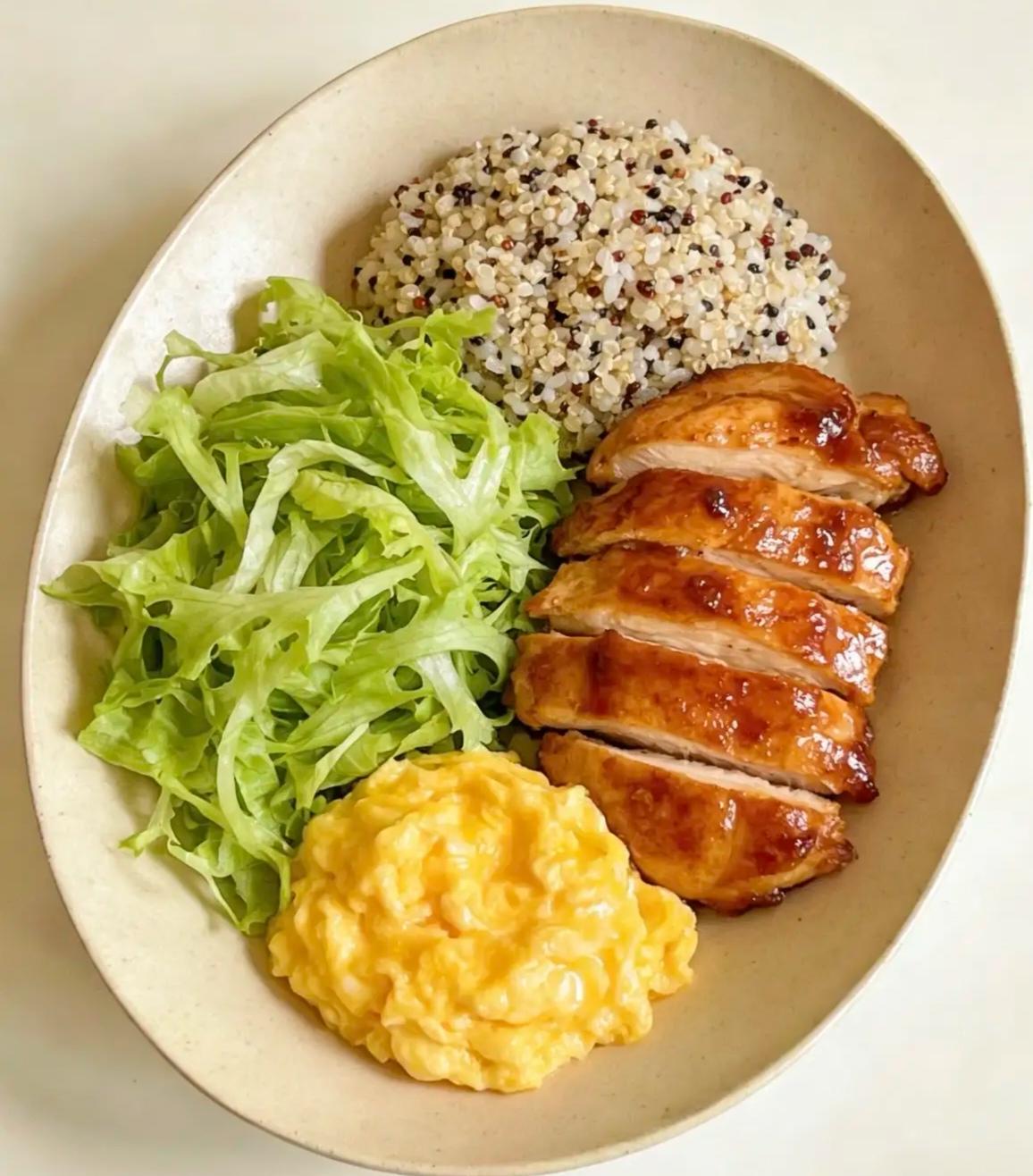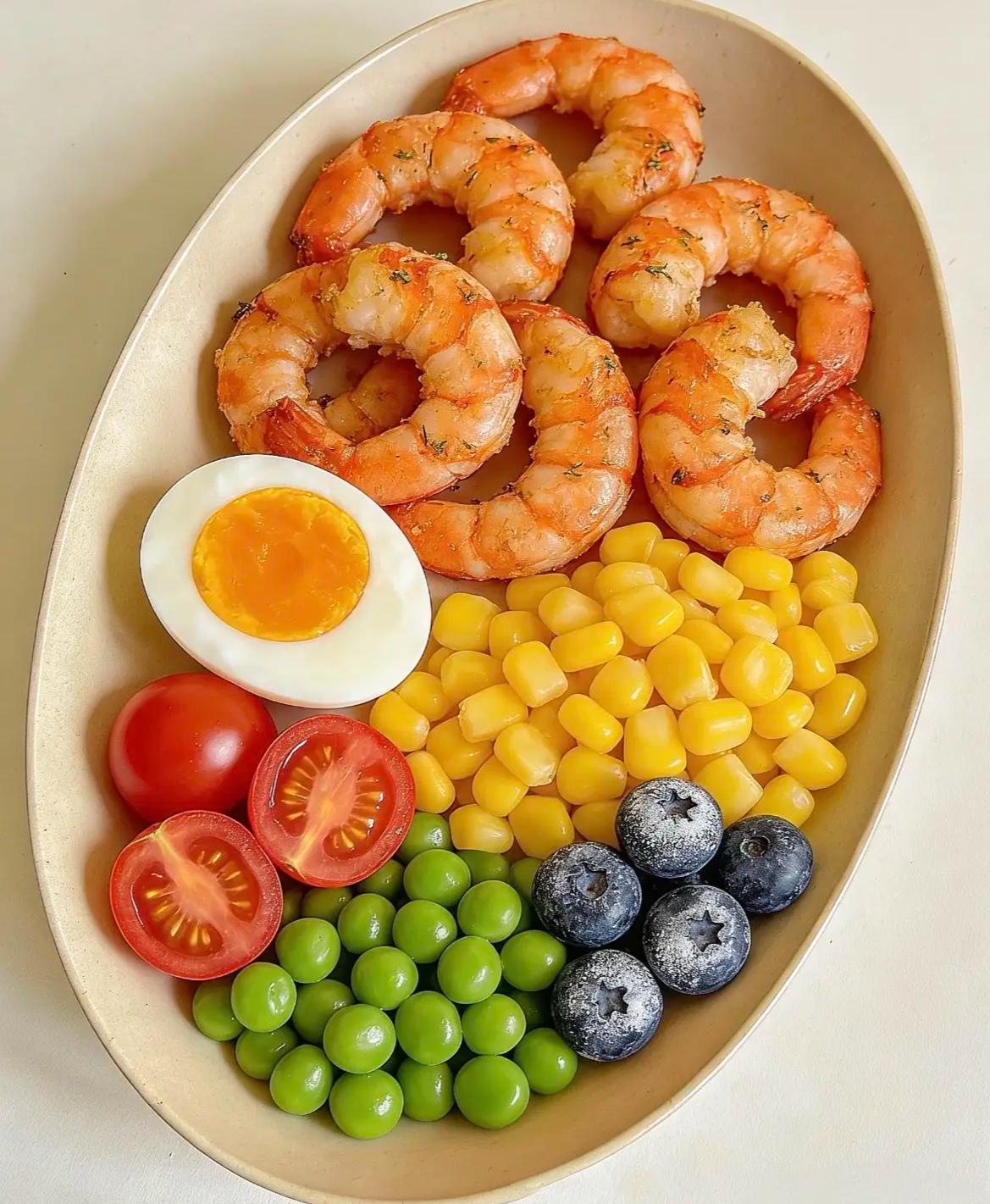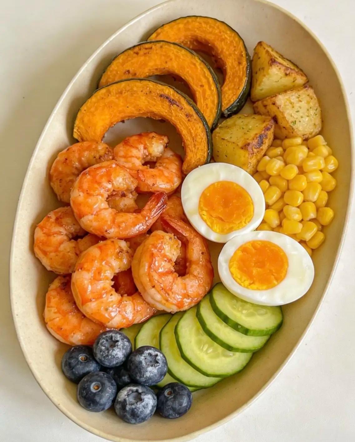 我嫂子做的减脂餐,完全不是寡淡水煮菜,香煎大虾、烤薯角、溏心蛋、照烧鸡胸肉,荤素搭配颜值高,看着就超有食欲。