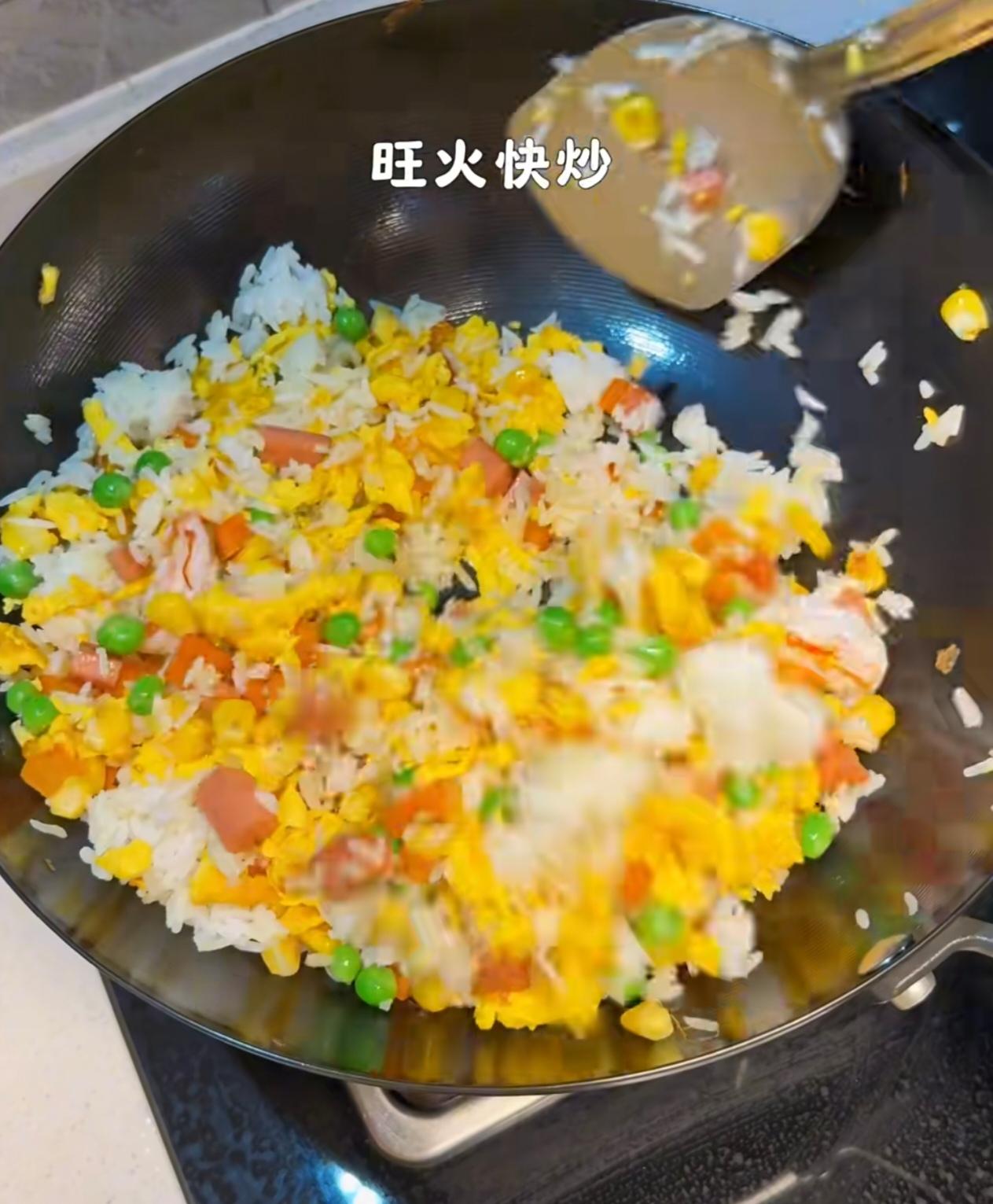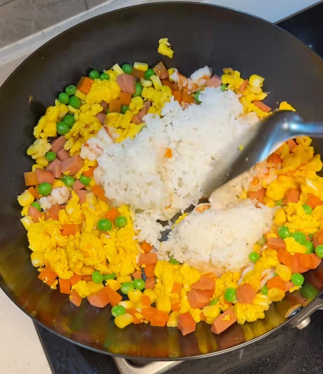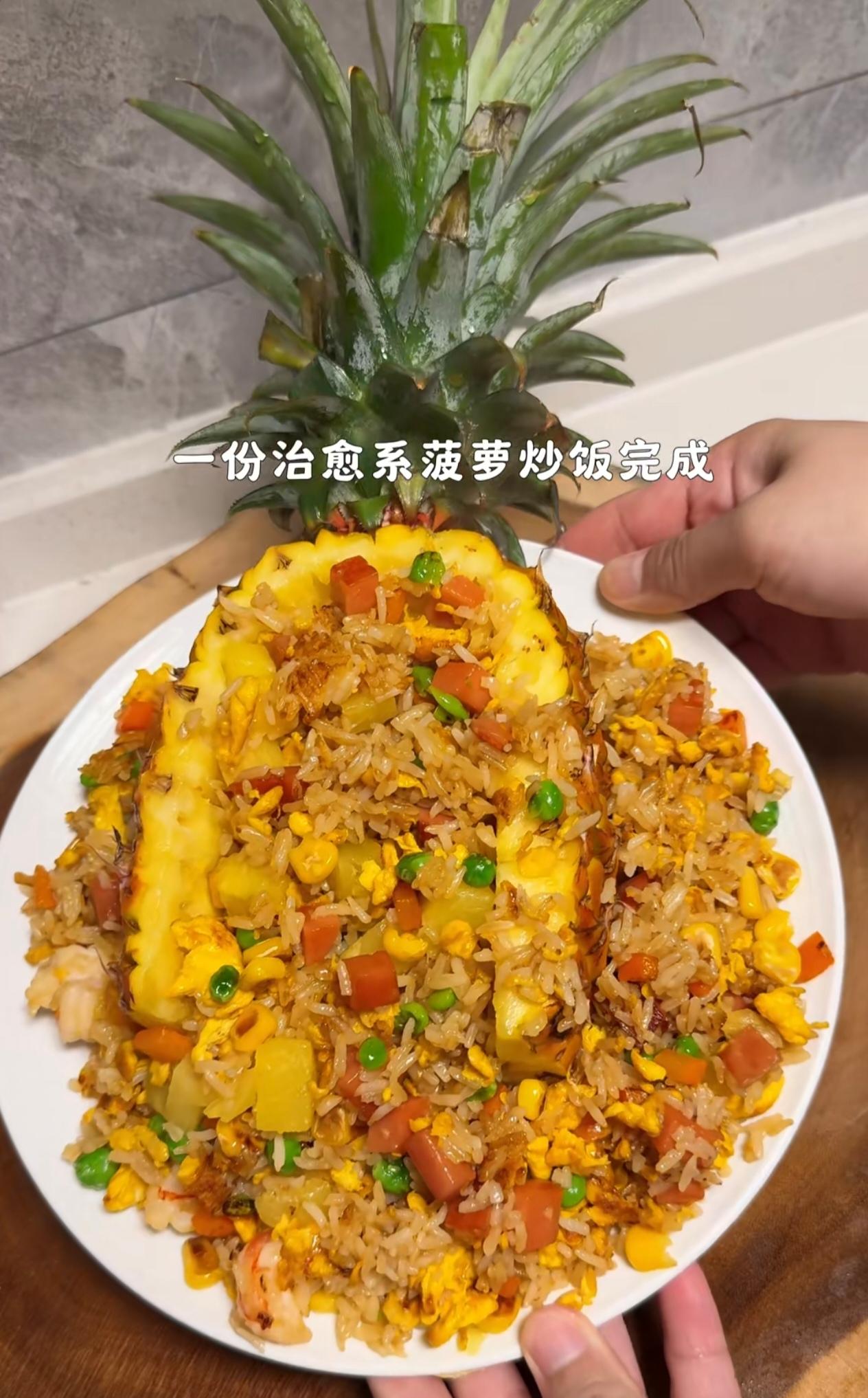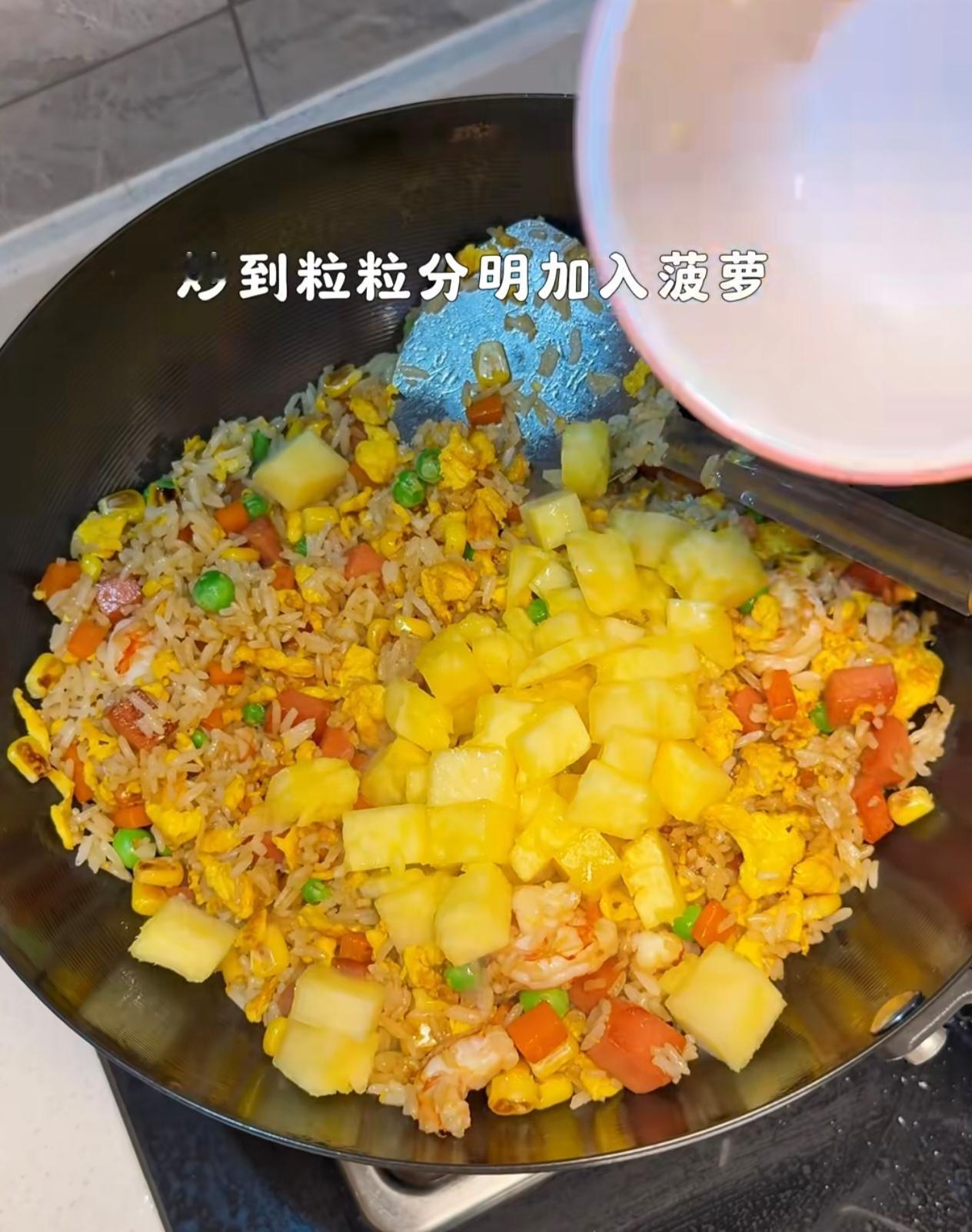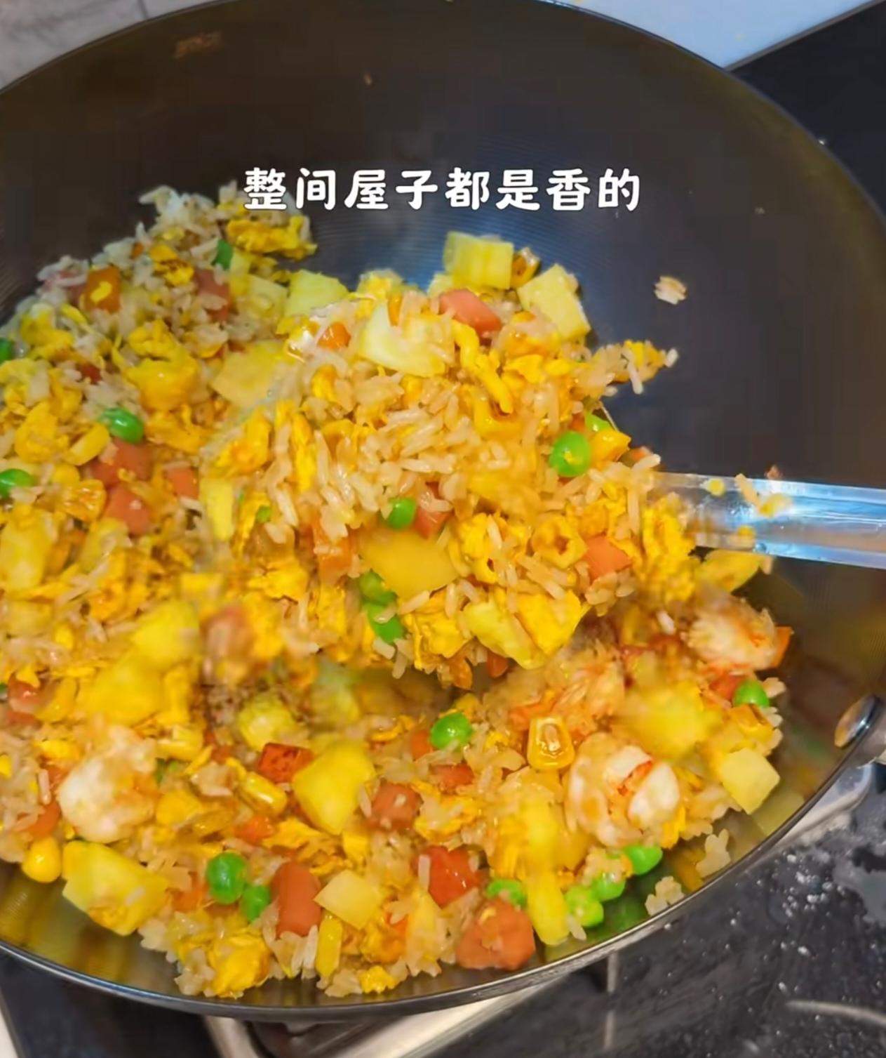 酸甜多汁的菠萝丁,裹着粒粒分明的炒饭,配上滑嫩的鸡蛋,还有玉米、青豆、火腿丁提味,一口下去酸甜鲜香,清爽不腻,越吃越好吃!