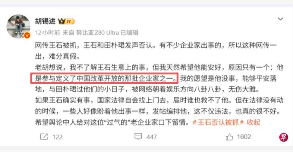 王石被抓可能是谣言,港媒现在消息也不准了。胡锡进评价“王石是参与定义了中国改革开