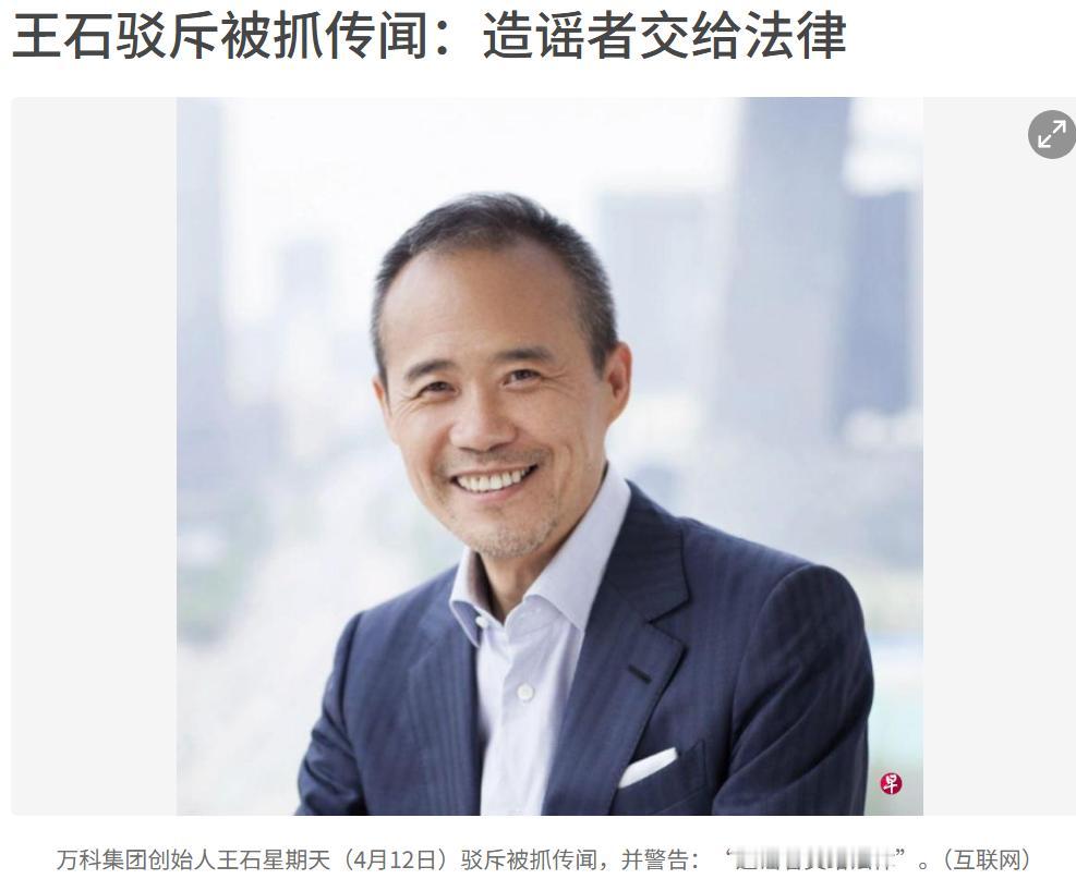 王石被抓可能是谣言,港媒现在消息也不准了。胡锡进评价“王石是参与定义了中国改革开放的那批企业家之一,所以希望他一切安好。”王石夫妇很快也发声了,一是证明自己没事,另外也告诉那个乱发信息的媒体可能要摊上官司了。