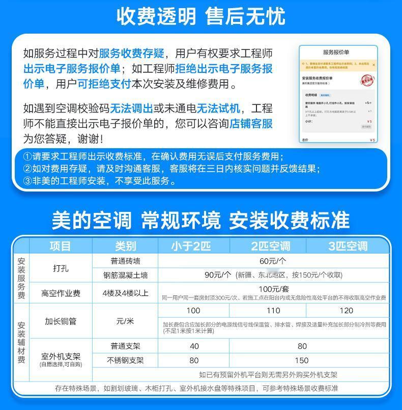 这次的空调安装不太让人满意,我没太多选择。卧室原来用的美的空调,用了快20年,一直运转正常,所以这次我没考虑其他品牌,选了美的最便宜的大一匹空调,旧的是小一匹。或许因为是大品牌,最让我费解的是,自备支架居然要加收20元人工费,这在其他品牌空调安装中从未有过。再者,旧机回收方面,其他商家给370元,美的美云收却只给330元。这空调质量如何、使用体验怎样,还得等用了之后才知道。