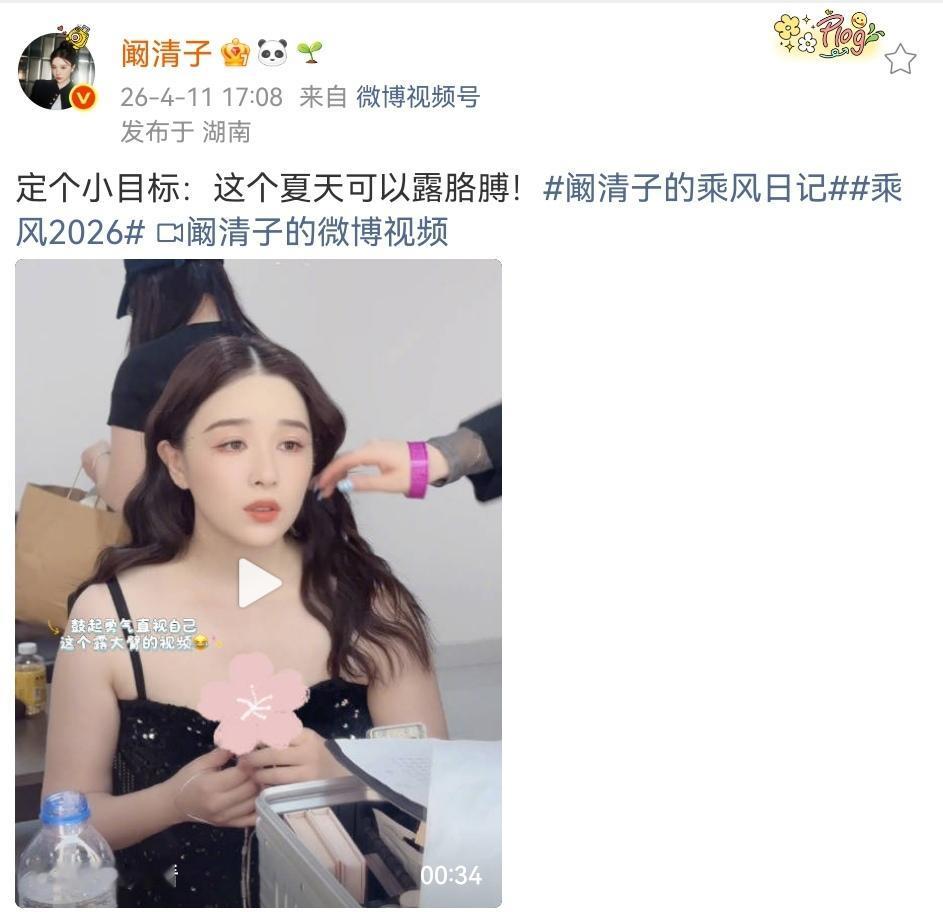 4月11日,阚清子在个人账号晒出了一个视频,并说,定个小目标:这个夏天可以露胳膊!